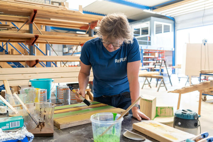 Het werken in de productie bij Replay Speeltoestellen bestaat uit grote machines, veel kabaal, veel stof, maar vooral ook veel plezier! ‘’Ik zie mijn werk als een fysiek gevecht tussen mij en het speeltoestel. In de ochtend komt er een boomstam binnen waarmee ik de strijd aanga en aan het einde van de dag zijn wij vriendjes omdat ik er een speeltoestel van heb gemaakt’’, aldus Frank.