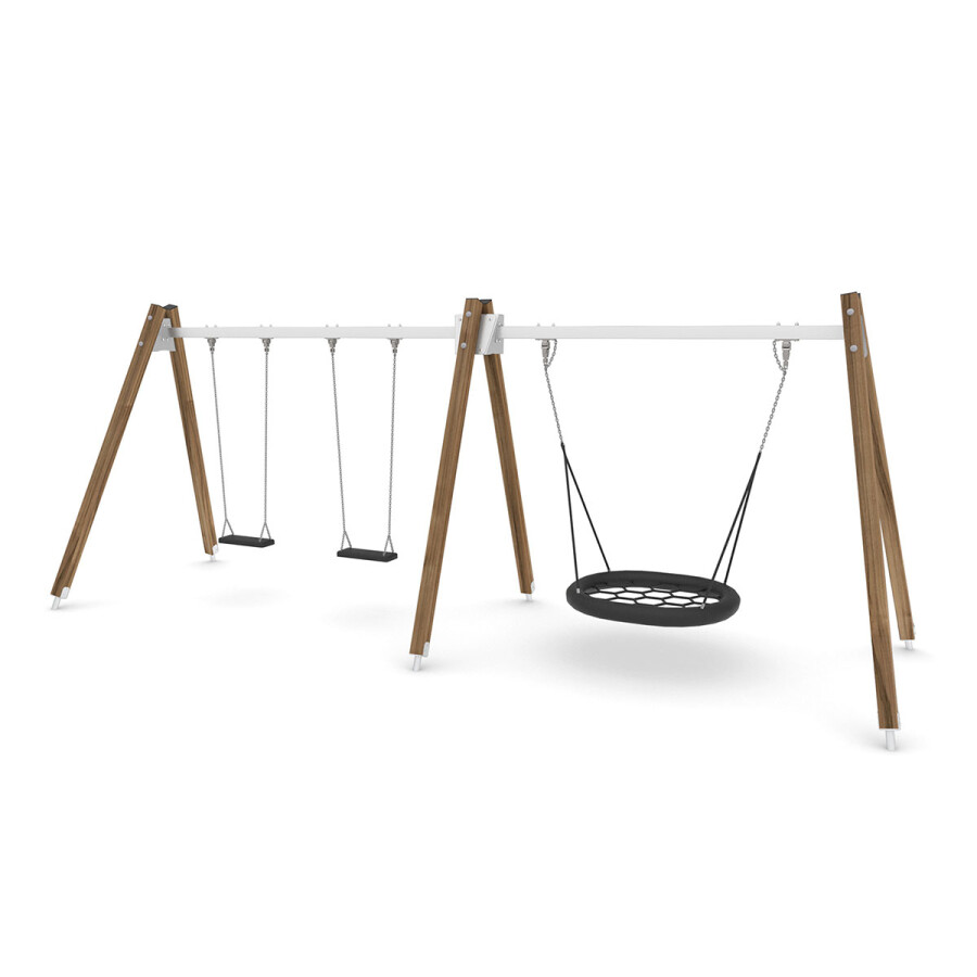 De schommel kan uitgevoerd worden met andere schommelzitjes en andere kleuren bovenbalken.