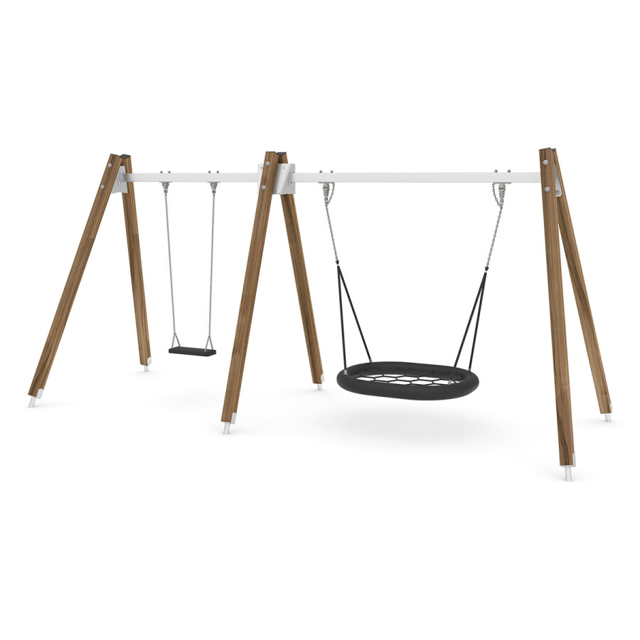 De schommel kan uitgevoerd worden met andere schommelzitjes en andere kleuren bovenbalken.