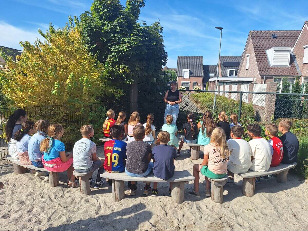 Basisschool De Bongerd heeft haar buitenruimte omgetoverd tot een inspirerende plek voor korte lessen zoals voorlezen of een presentatie geven. Kinderen ervaren het buiten leren op hun eigen manier: de één krijgt nieuwe frisse energie, terwijl de ander juist extra focus vind in de frisse buitenlucht.