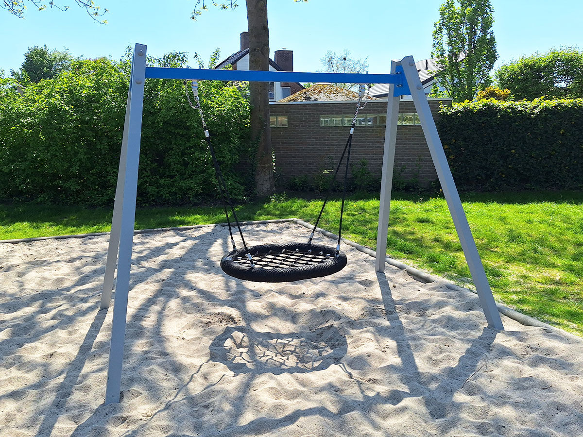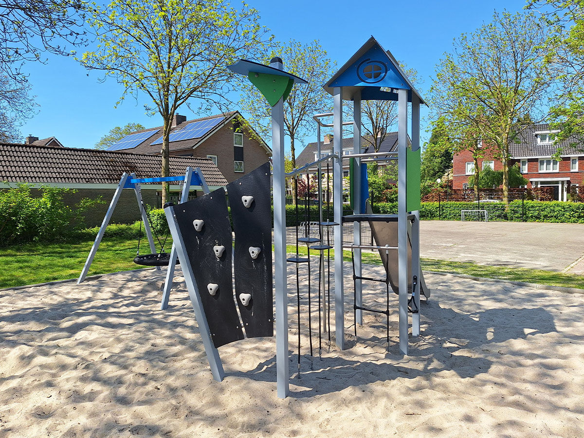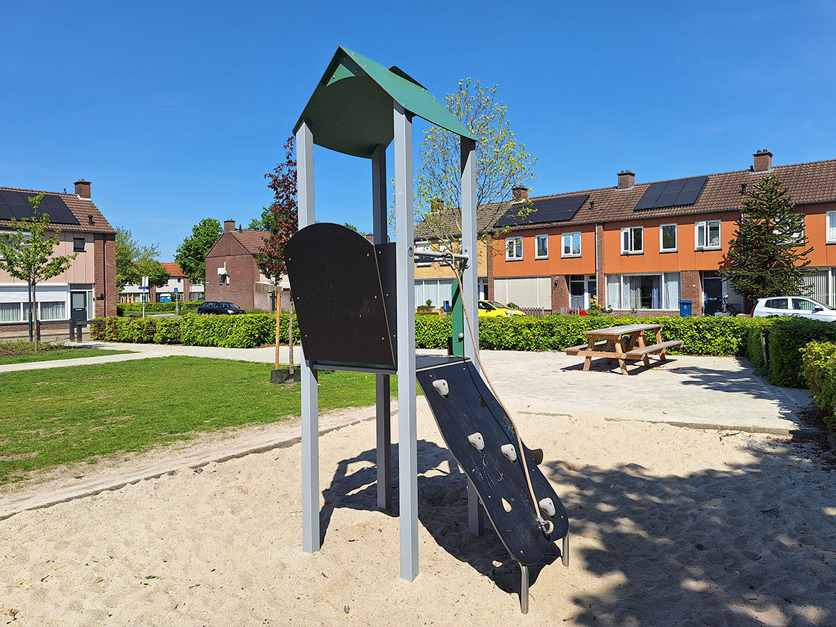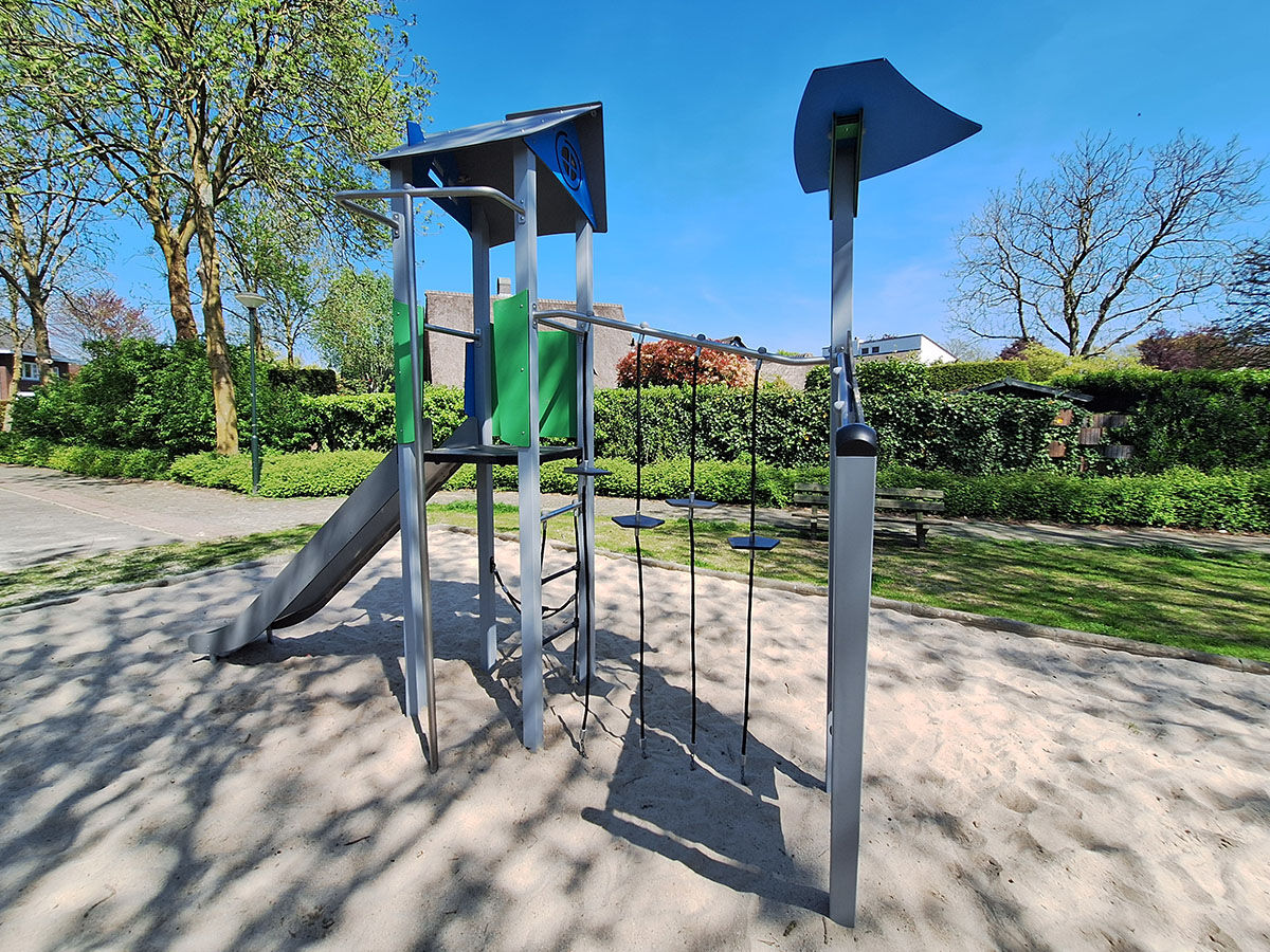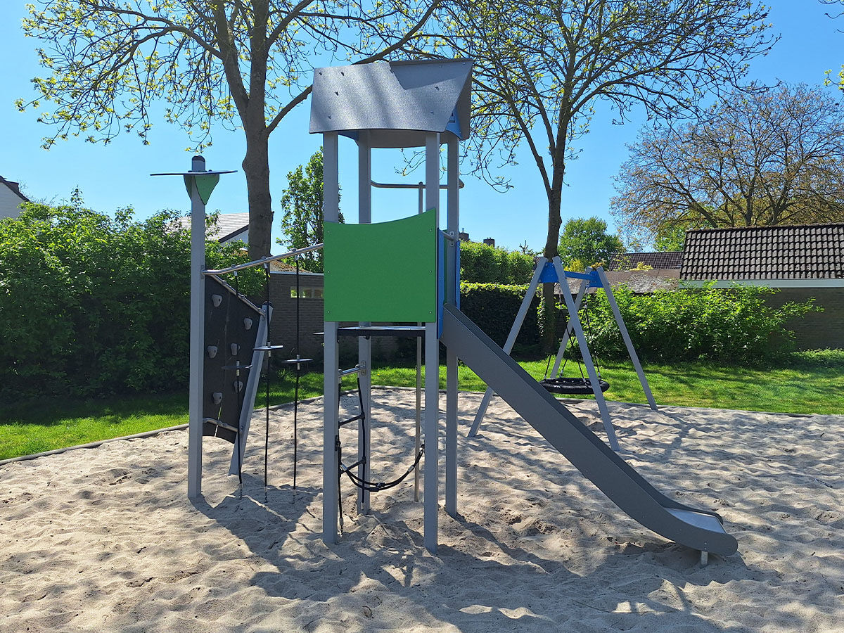 Op de eerste speelplek zijn het houten klimtoestel en de schommel vervangen door robuuste varianten van gecoat metaal. De frisse kleuren geven de speelplek een moderne, uitnodigende uitstraling, terwijl de stevige materialen zorgen voor langdurig gebruiksplezier.