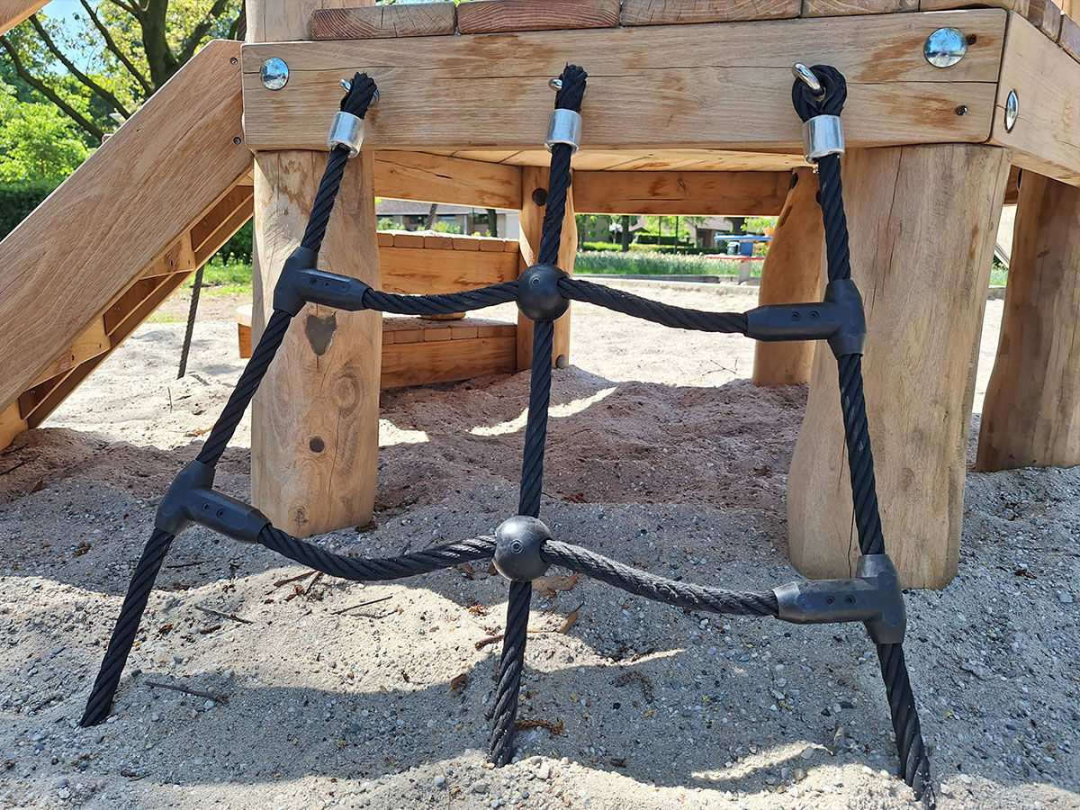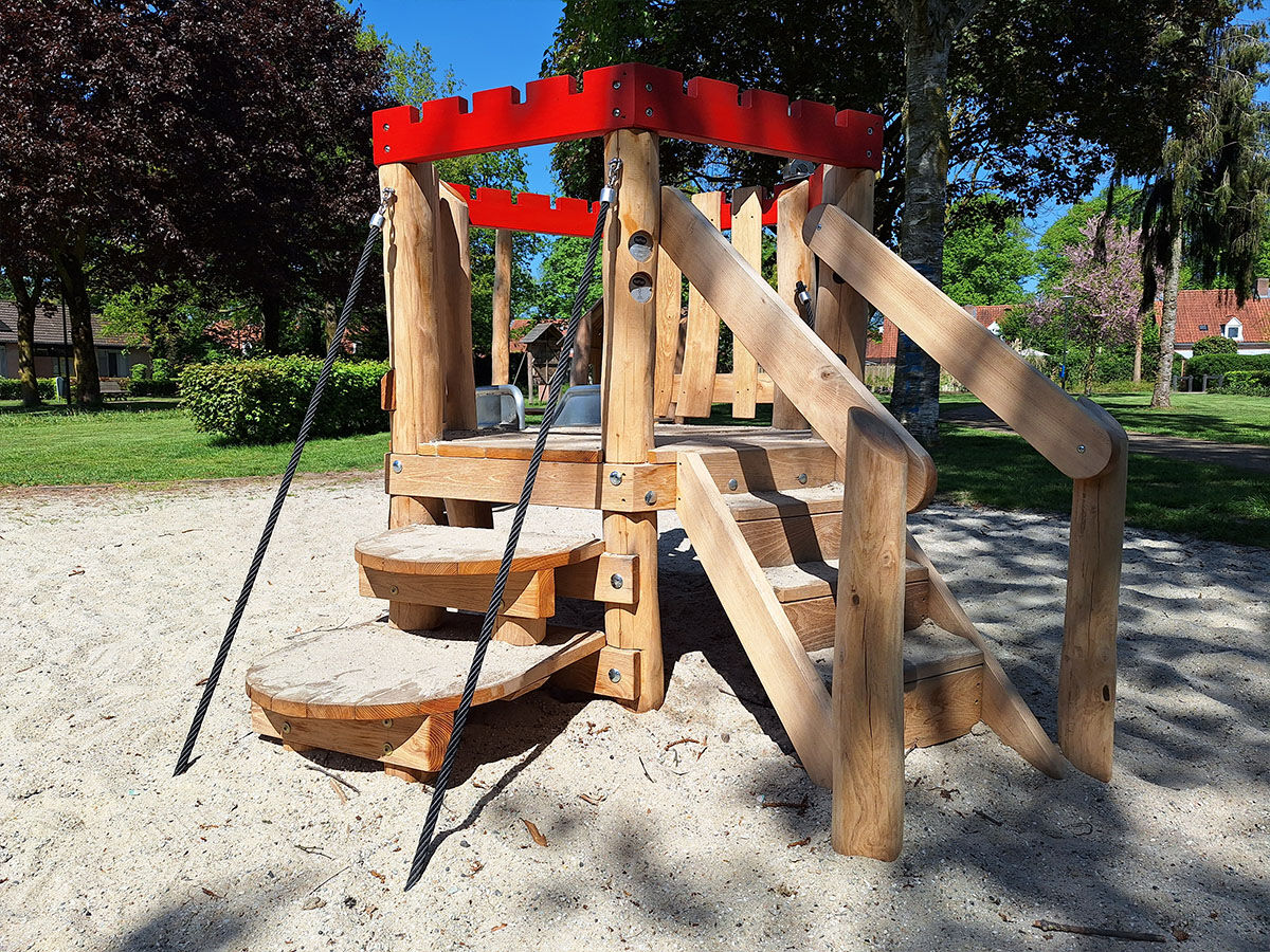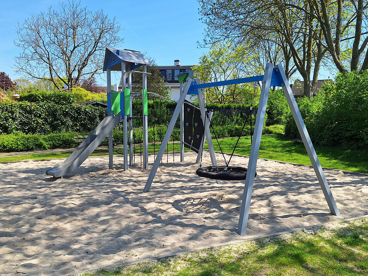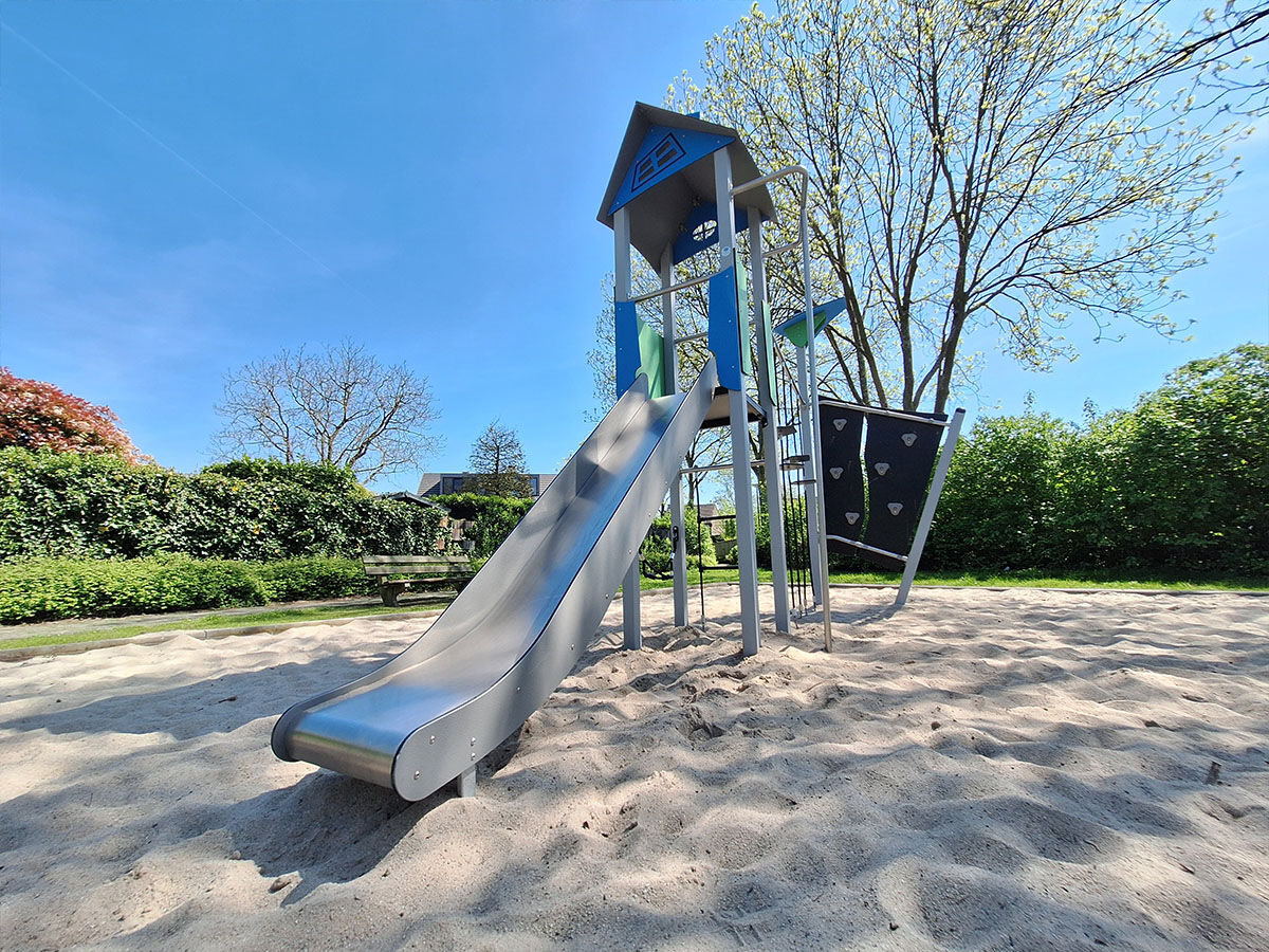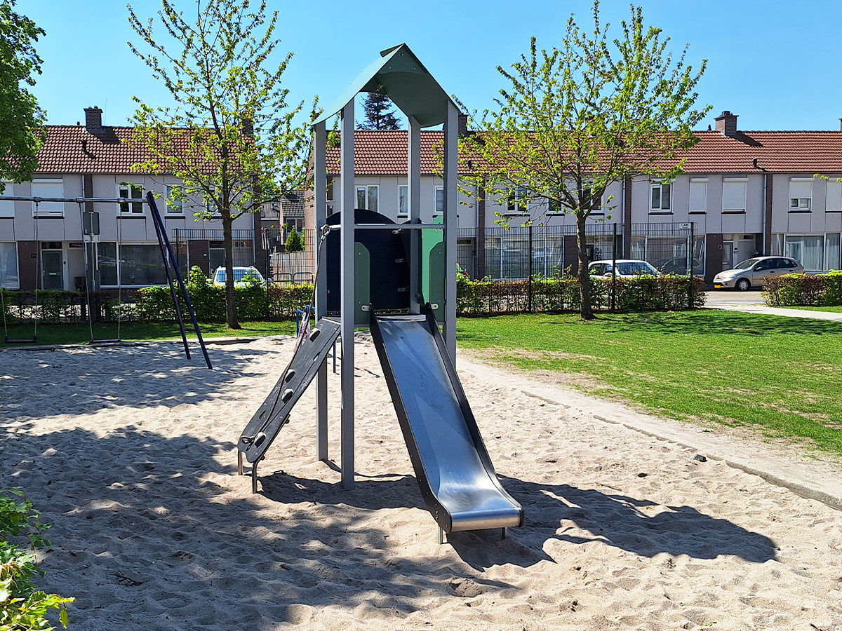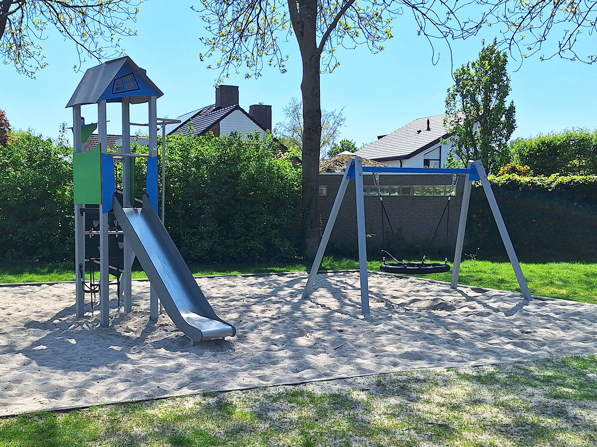 Op de eerste speelplek zijn het houten klimtoestel en de schommel vervangen door robuuste varianten van gecoat metaal. De frisse kleuren geven de speelplek een moderne, uitnodigende uitstraling, terwijl de stevige materialen zorgen voor langdurig gebruiksplezier.