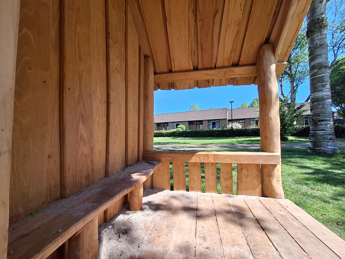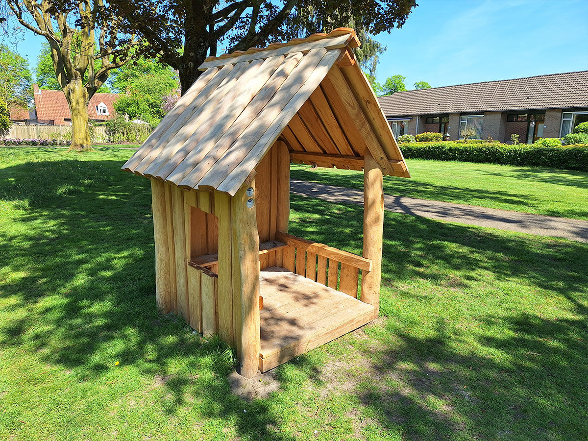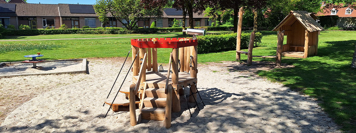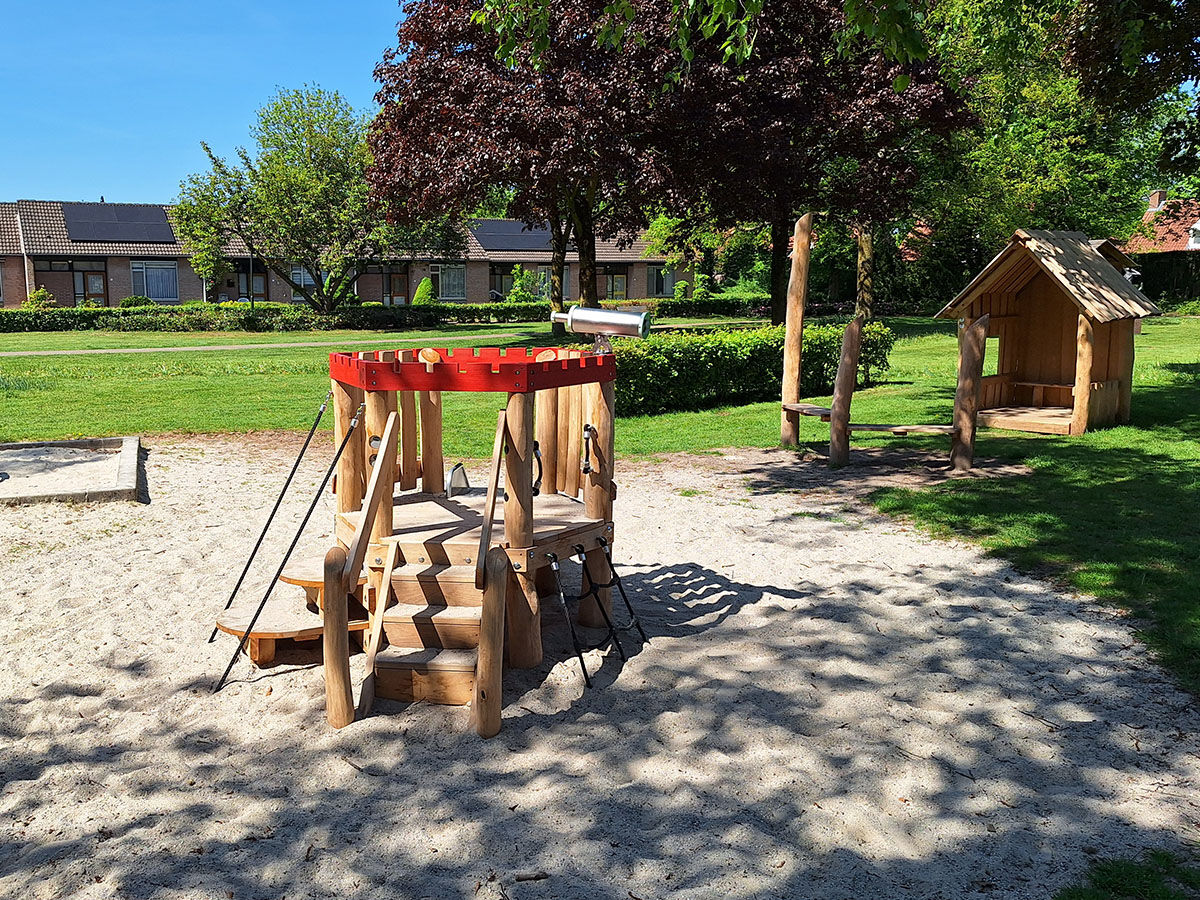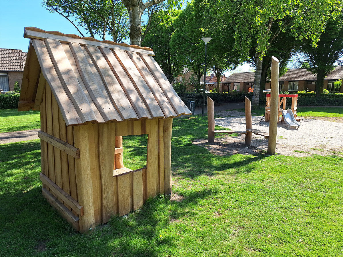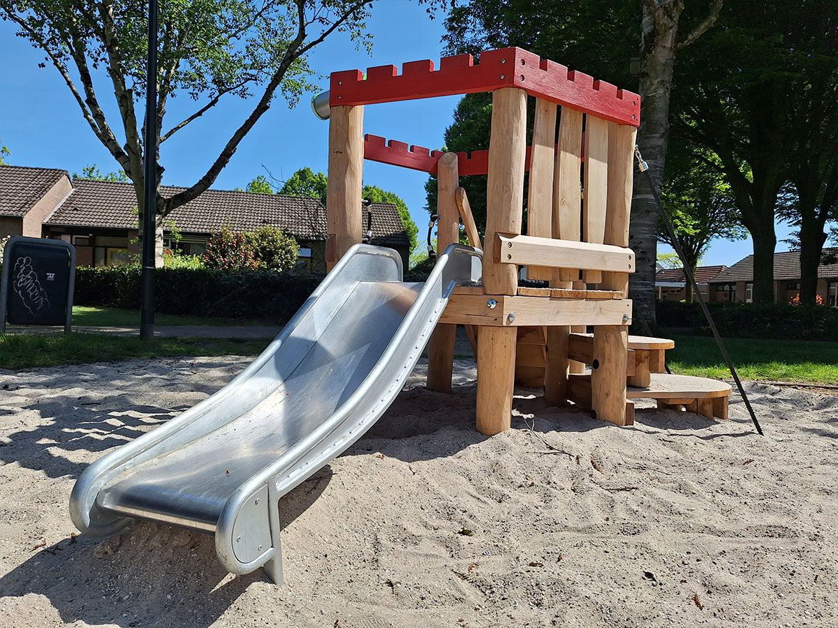 Speelplek 2, gelegen in een parkachtige omgeving, is volledig opnieuw ingericht met natuurlijke robinia speeltoestellen. De versleten toestellen zijn verwijderd en vervangen door duurzame speelobjecten die perfect aansluiten bij de groene setting. De nieuwe inrichting richt zich vooral op jongere kinderen, met veilige en speelse elementen die stimuleren tot ontdekken, bewegen en fantasievol spel.
