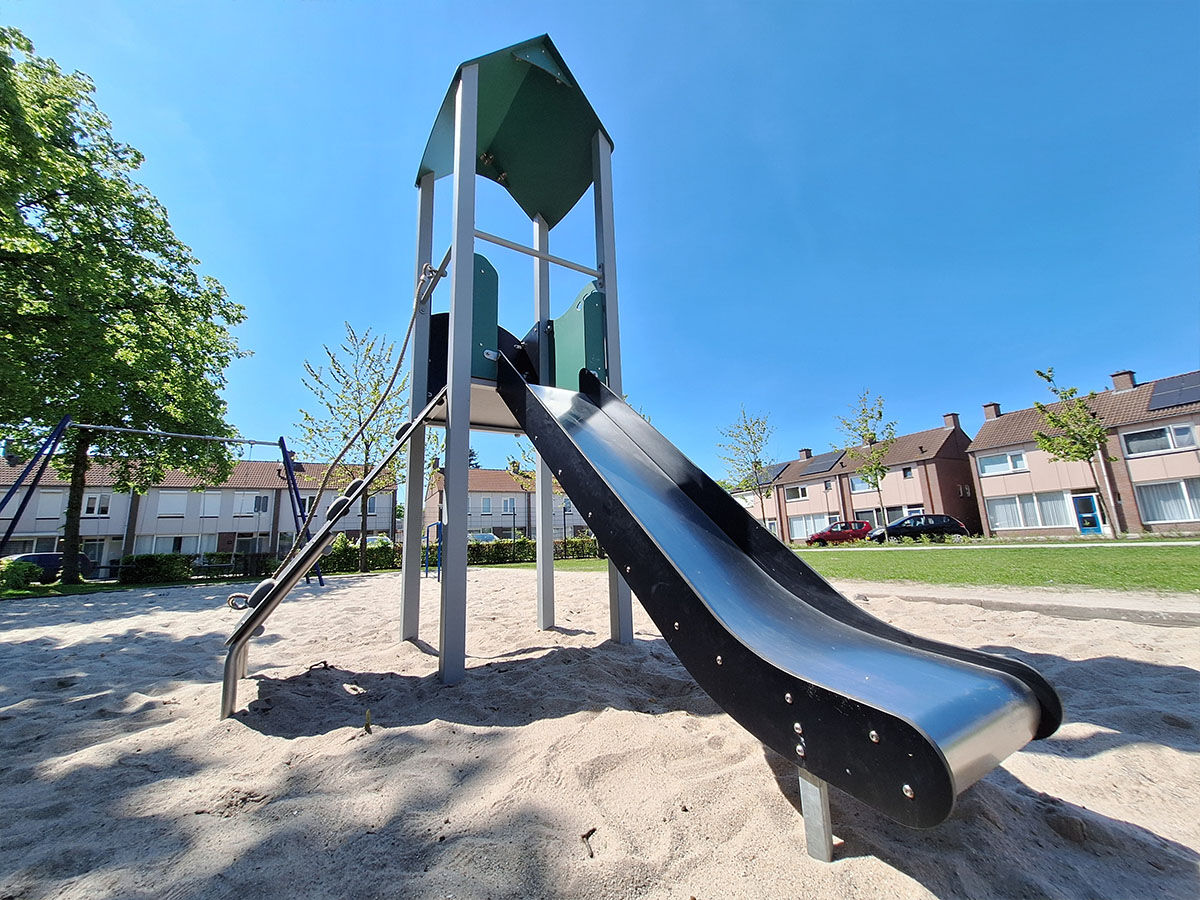 Bij speelplek 3 zijn enkele verouderde metalen toestellen vervangen door een nieuw, groen metalen toestel. Dankzij de kleurstelling voegt het nieuwe toestel zich op natuurlijke wijze in de omgeving, terwijl het toch een frisse upgrade vormt ten opzichte van de oude inrichting. Het behoud van metaal past bovendien goed bij het oorspronkelijke karakter van deze plek.