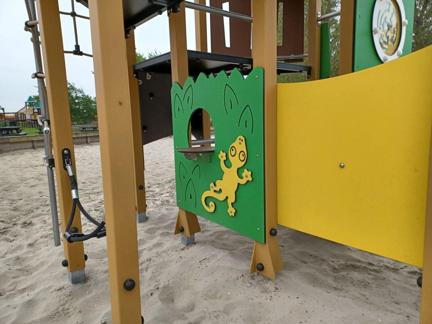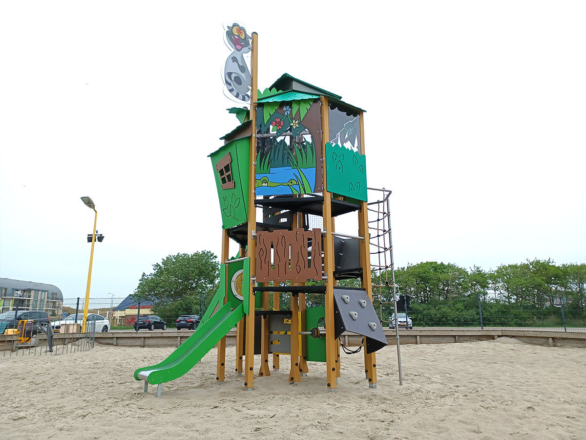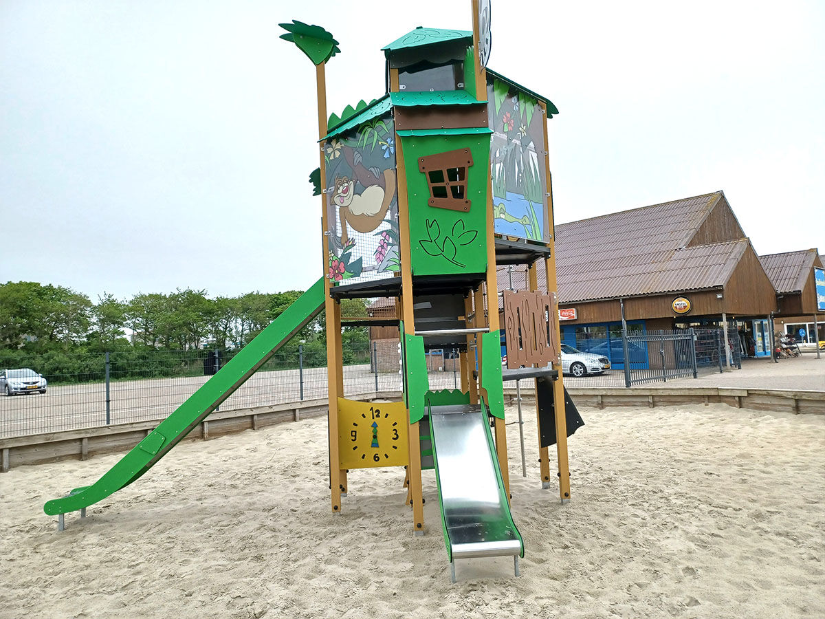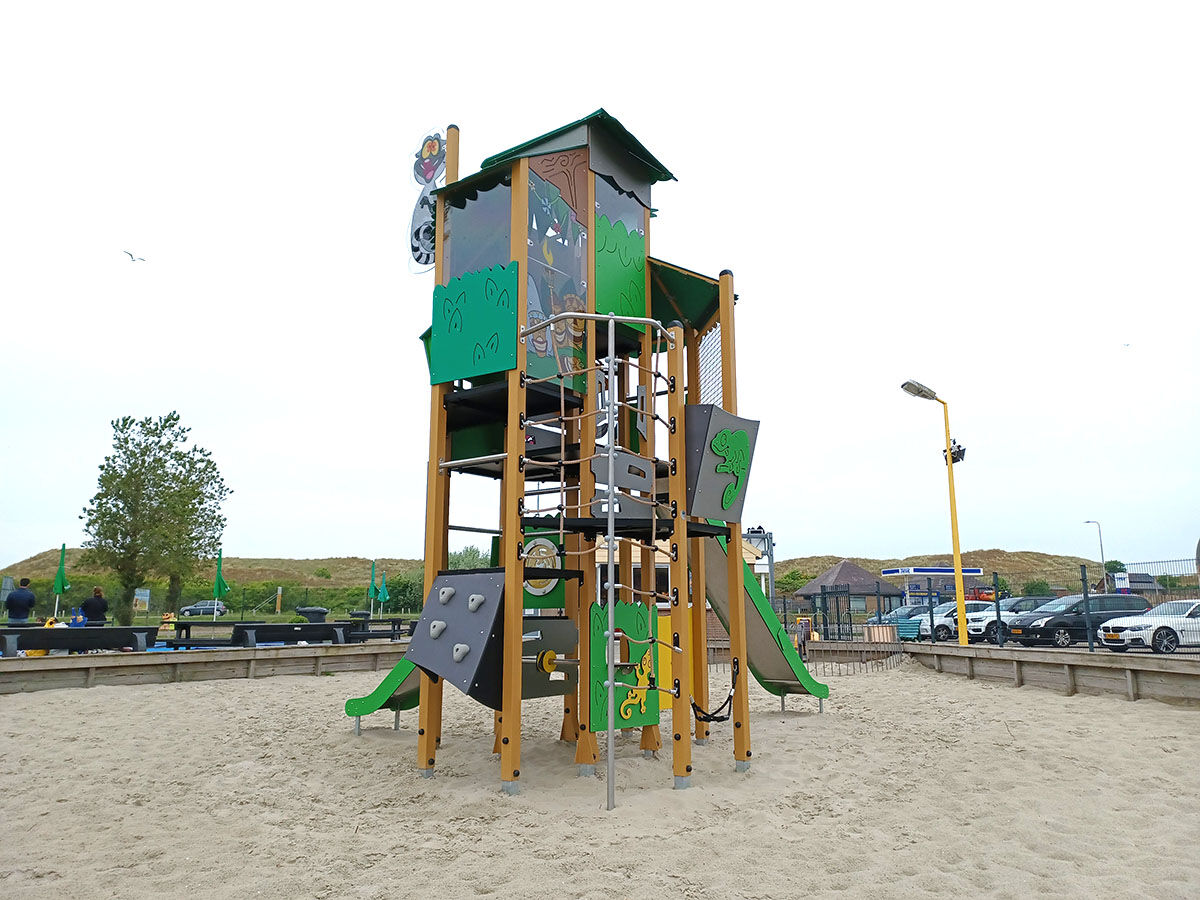 Het speeltoestel waar het allemaal over gaat is Speeljungle Madagaskar. Dit is een toestel uit onze Fantasy Playline. Het is een hoge speeltoren in een jungle thema en heeft veel verschillende speelelementen. Qua materiaalkeuze is er voor gepoedercoat staal gekozen. Dit niet geheel zonder reden. Het speelpark ligt dicht bij de kust. Houten speeltoestellen zijn dan niet zo geschikt, omdat de zilte lucht in het hout gaat bijten. Gepoedercoat staal geeft speeltoestellen een dubbele bescherming. Hierdoor gaan dit soort toestellen langs de kust langer mee. Een duurzame keuze dus voor deze locatie!