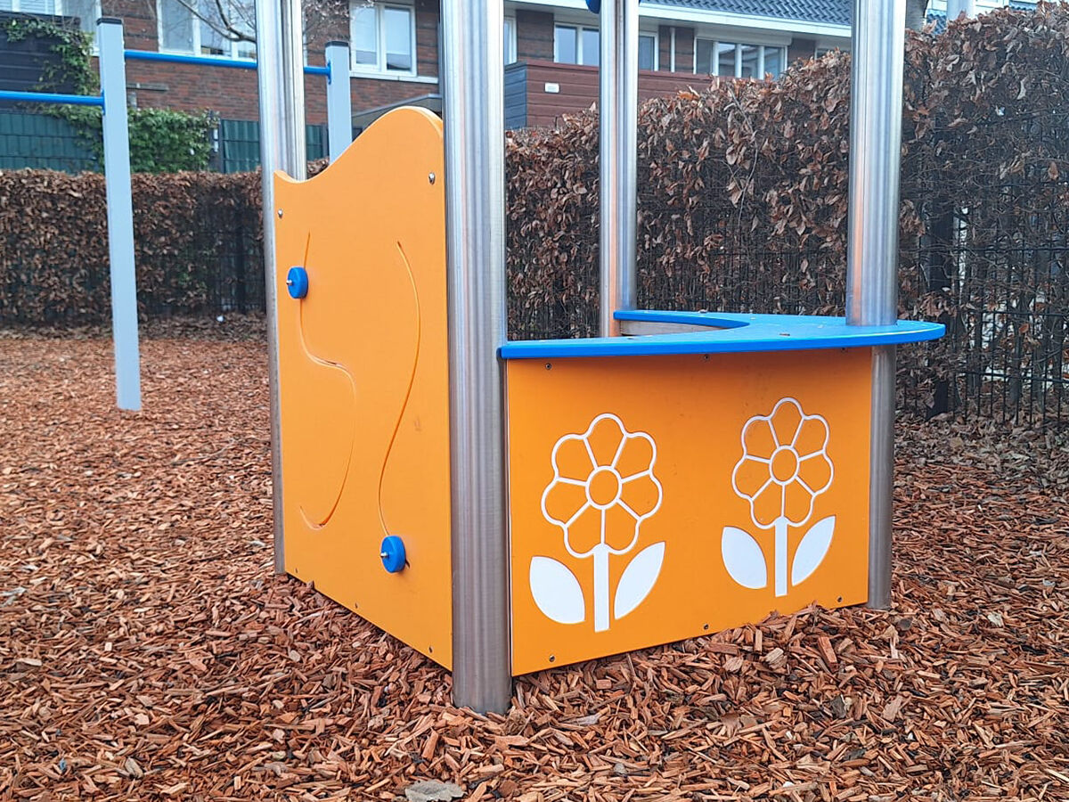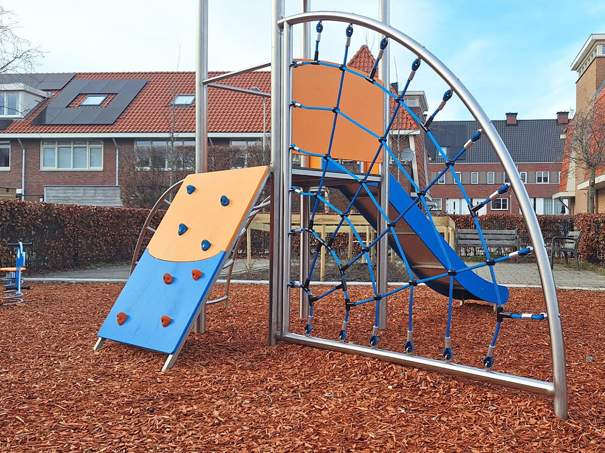 De oude houten toestellen zijn vervangen door speeltoestellen van RVS en staal. Deze materialen zijn gekozen vanwege hun lange levensduur, onderhoudsvriendelijkheid en robuuste uitstraling. Hierdoor is de speelplek niet alleen duurzamer, maar ook beter bestand tegen intensief gebruik en weersinvloeden.