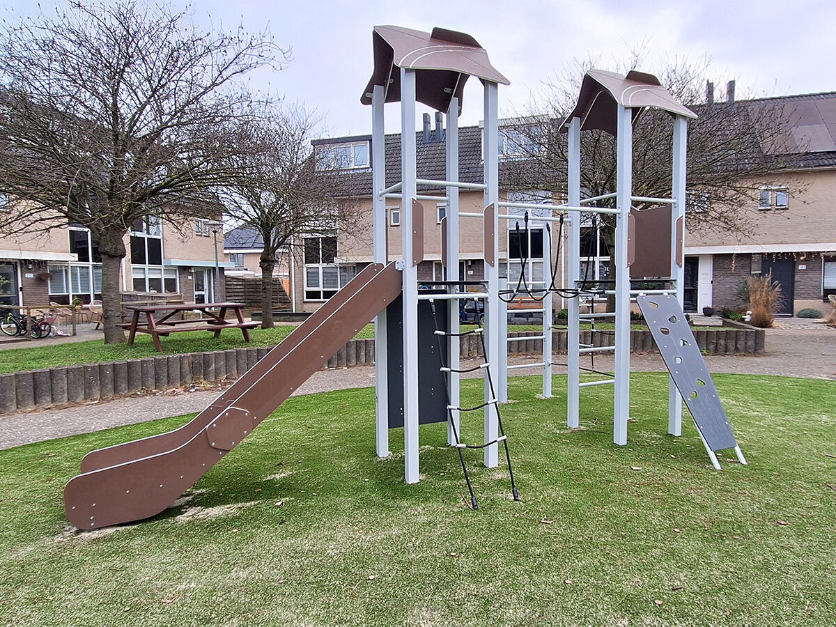 De belangrijkste wensen vanuit de bewoners waren een glijbaan, schommel en een klimtoestel. Om deze elementen optimaal te combineren, hebben wij gekozen voor speelcombinatie Marijn waarin klimmen en glijden samenkomen in één toestel. Hierdoor ontstaat een compact maar uitdagend speeltoestel dat zowel motorische ontwikkeling als speelplezier stimuleert. Daarnaast hebben we de bestaande tafeltennistafel en het duikelrek behouden, aangezien deze nog in goede staat waren en prima een tweede ronde mee konden. Zo bleef een deel van de vertrouwde speelplek behouden én werd duurzaam omgegaan met bestaande materialen.