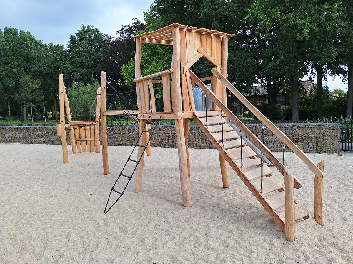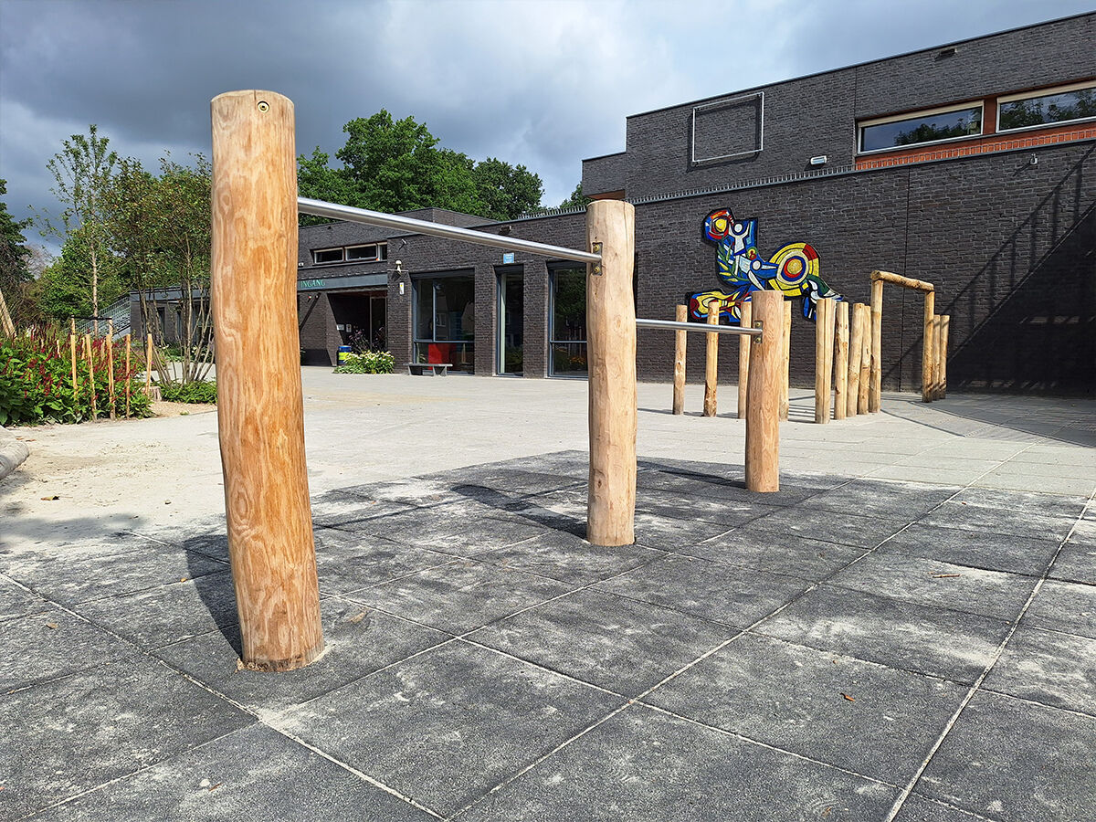 Aan de achterkant van de school was de wens om een groot en uitdagend speeltoestel te plaatsen. Hiervoor werd gekozen voor Speelcombinatie Virginia – een veelzijdig toestel met een verhoogd parcours, meerdere klimroutes en een indrukwekkende glijbaantoren met twee opgangen: een trap en een touwladder. Ook installeerden we hier een zesdelig duikelrek, waarop meerdere kinderen tegelijk kunnen spelen.