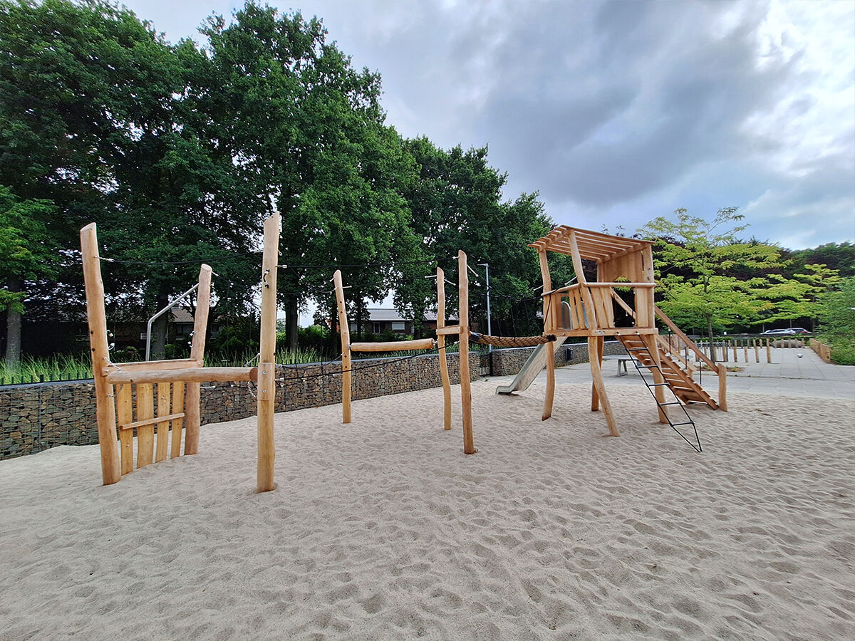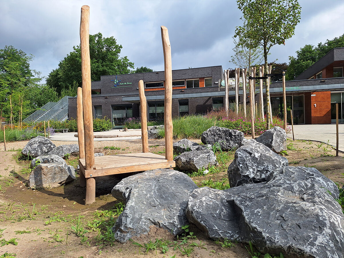 Aan de voorzijde van het schoolplein plaatsten we een vogelnestschommel, klimtoestel Vlier en een dubbel duikelrek. Ook is hier een speelse wadi aangelegd, waarbij kinderen via stapstenen naar een centrale vlonder kunnen lopen. De vlonder is gebouwd met hoge palen, zodat er in de zomer een schaduwdoek kan worden opgehangen. Het resultaat is een natuurlijk ogend speelgebied dat kinderen uitnodigt tot ontdekken en bewegen.