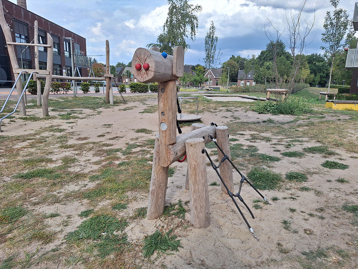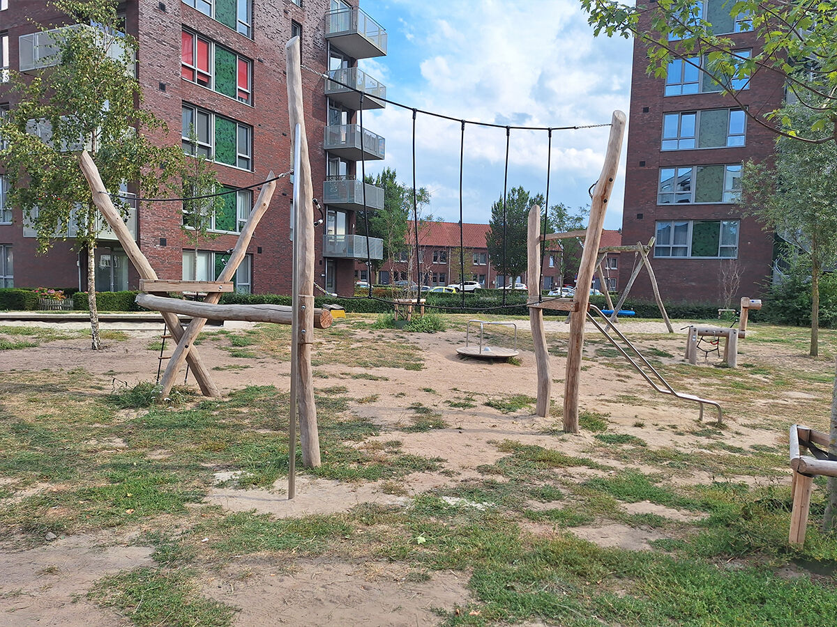 De kinderen hadden duidelijke wensen: balanceren, verstoppen, parcours en draaien moesten in ieder geval terugkomen. Deze speelwaarden zijn de basis geweest voor ons ontwerp. Ook de gemeente had een belangrijke voorwaarde: het moest een natuurlijke uitstraling krijgen. Daarom hebben we gekozen voor toestellen van duurzaam Robinia hout, passend in de groene omgeving.