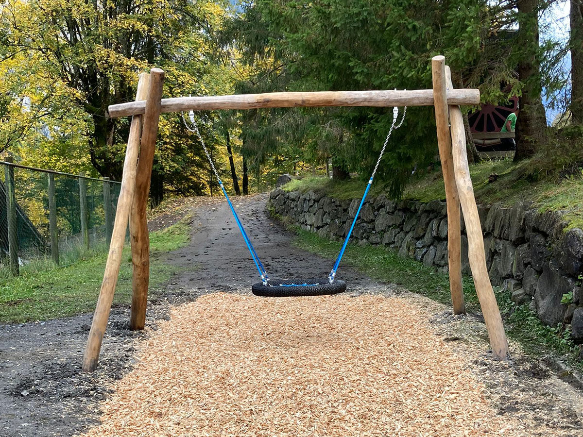 Natuurlijk moesten de toestellen ook nog geplaatst worden, iets anders dan normaal, maar zeker niet onmogelijk! Samen met onze trouwe partner HVR Speeltotaal werkten we zorgvuldig aan de voorbereidingen en logistiek om het toestel op locatie in Zwitserland te monteren. Zo gezegd zo gedaan. De valdempende ondergrond werd voorzien van een natuurlijke laag houtschors, wat niet alleen een veilige demping biedt, maar ook mooi aansluit bij de natuurlijke omgeving van de camping.