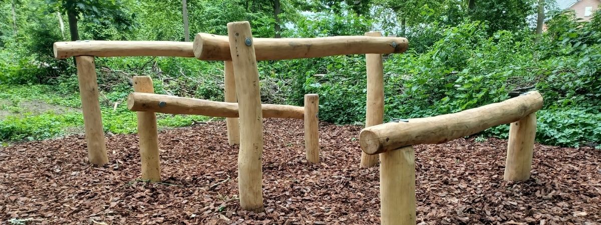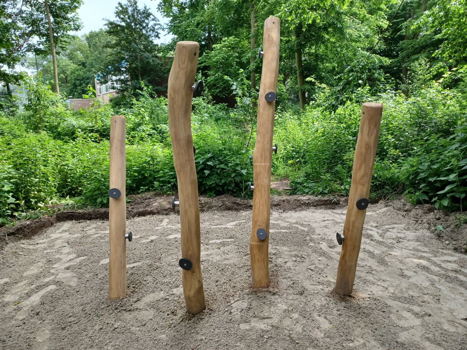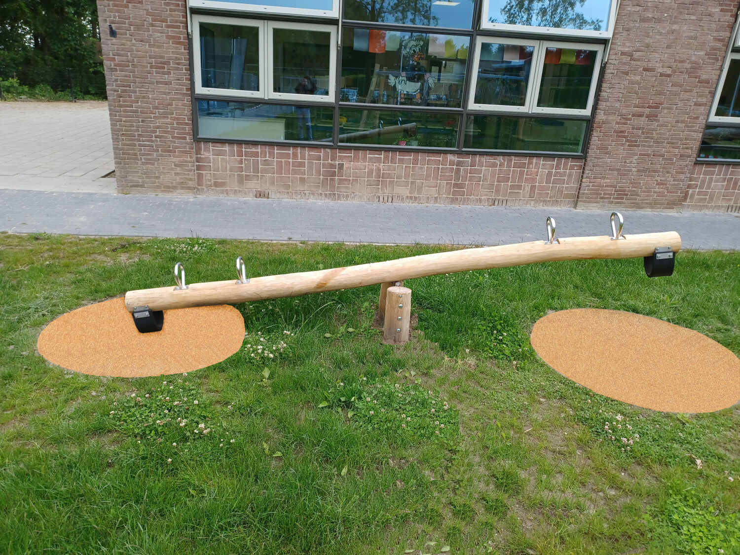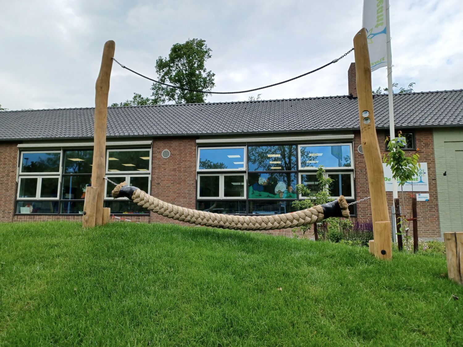 Er is gekozen voor een volledig natuurlijk uitziende speeltuin. Alle speeltoestellen zijn daarom van Robinia hout gemaakt. Dit omdat de natuurlijke uitstraling het beste past bij de omgeving. Achter de school ligt namelijk een parkje, en de houten speeltoestellen gaan daar mooi in op. De speeltoestellen zijn aan beide kanten van de school geplaatst. Zo vind je er een glijbaan, een zwerfkeienladder, een wip, een vijfkantschommel en nog verschillende klim- en parcourstoestellen. Een grote diversiteit aan speelfuncties die voor veel vermaak zorgen.