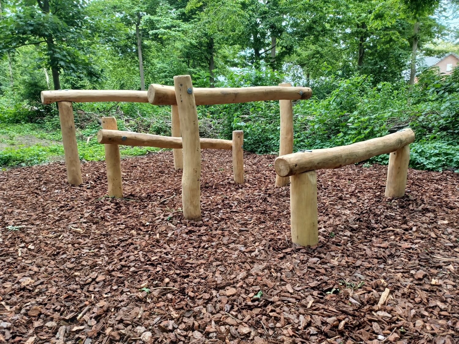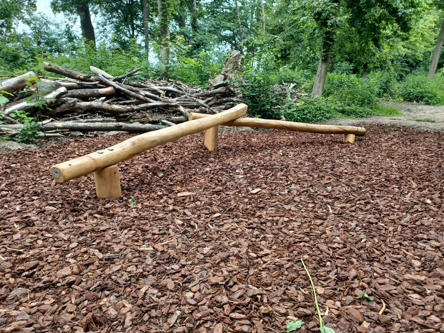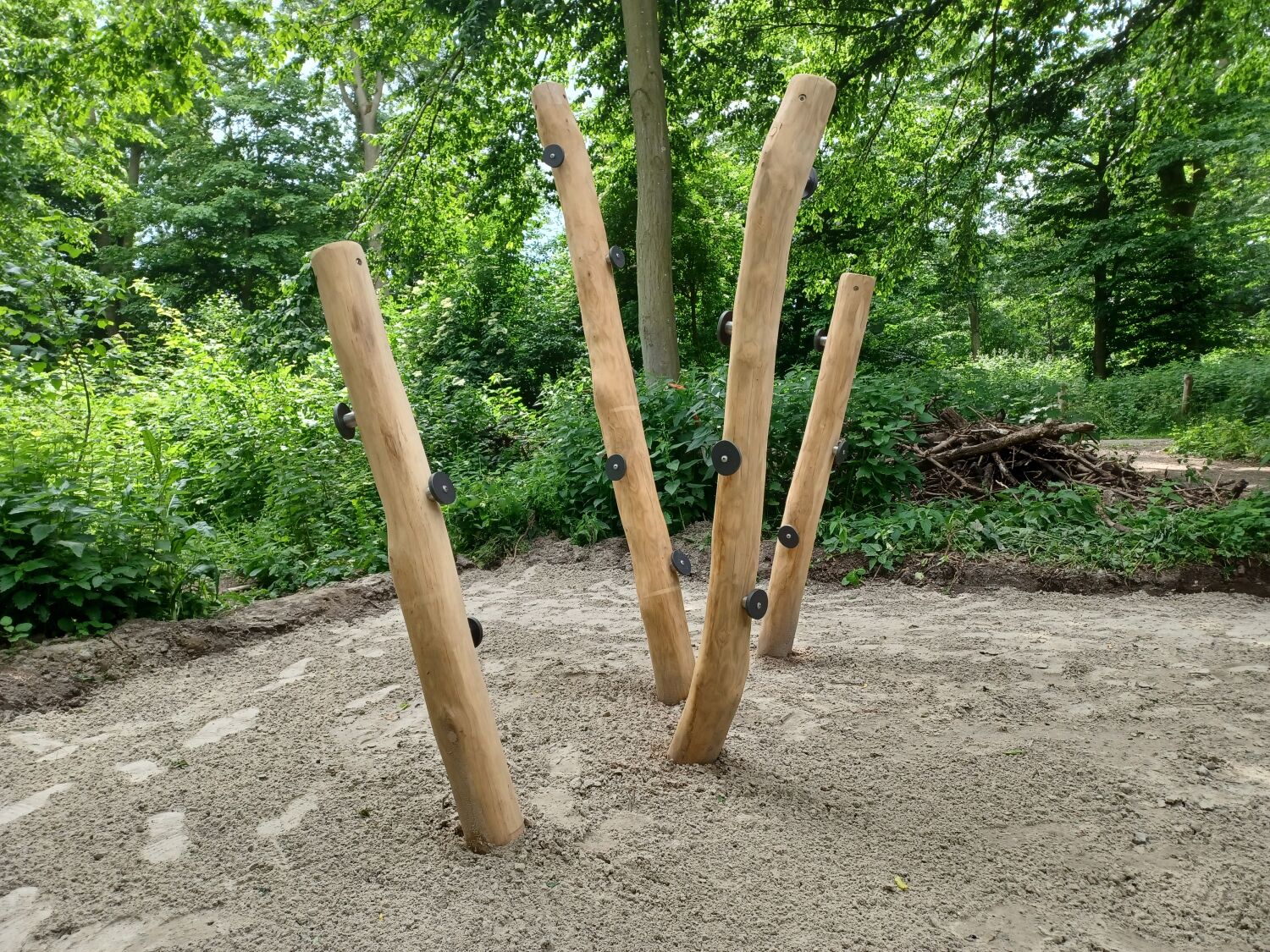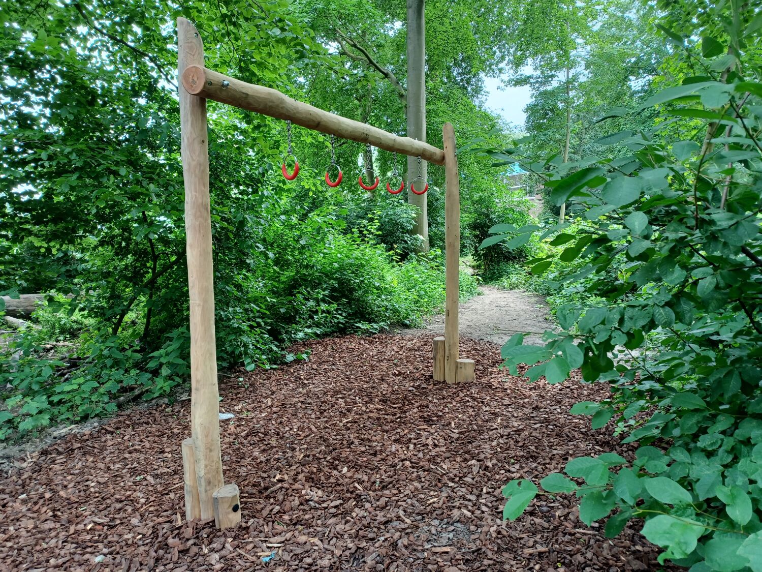 Er is gekozen voor een volledig natuurlijk uitziende speeltuin. Alle speeltoestellen zijn daarom van Robinia hout gemaakt. Dit omdat de natuurlijke uitstraling het beste past bij de omgeving. Achter de school ligt namelijk een parkje, en de houten speeltoestellen gaan daar mooi in op. De speeltoestellen zijn aan beide kanten van de school geplaatst. Zo vind je er een glijbaan, een zwerfkeienladder, een wip, een vijfkantschommel en nog verschillende klim- en parcourstoestellen. Een grote diversiteit aan speelfuncties die voor veel vermaak zorgen.