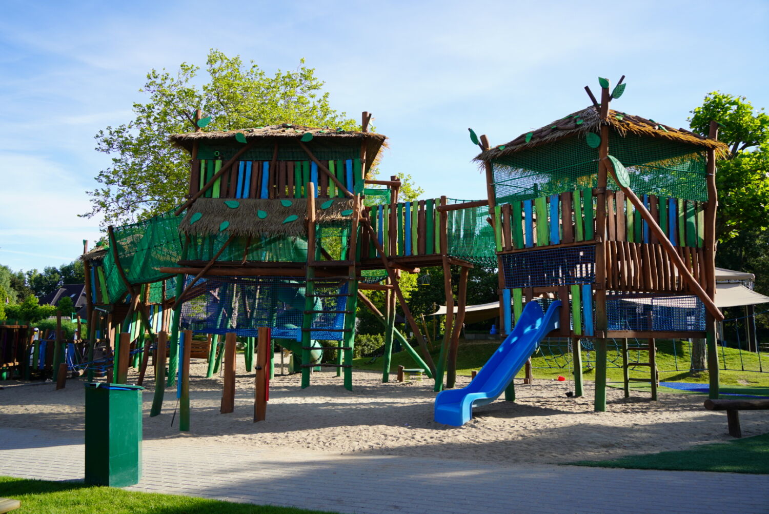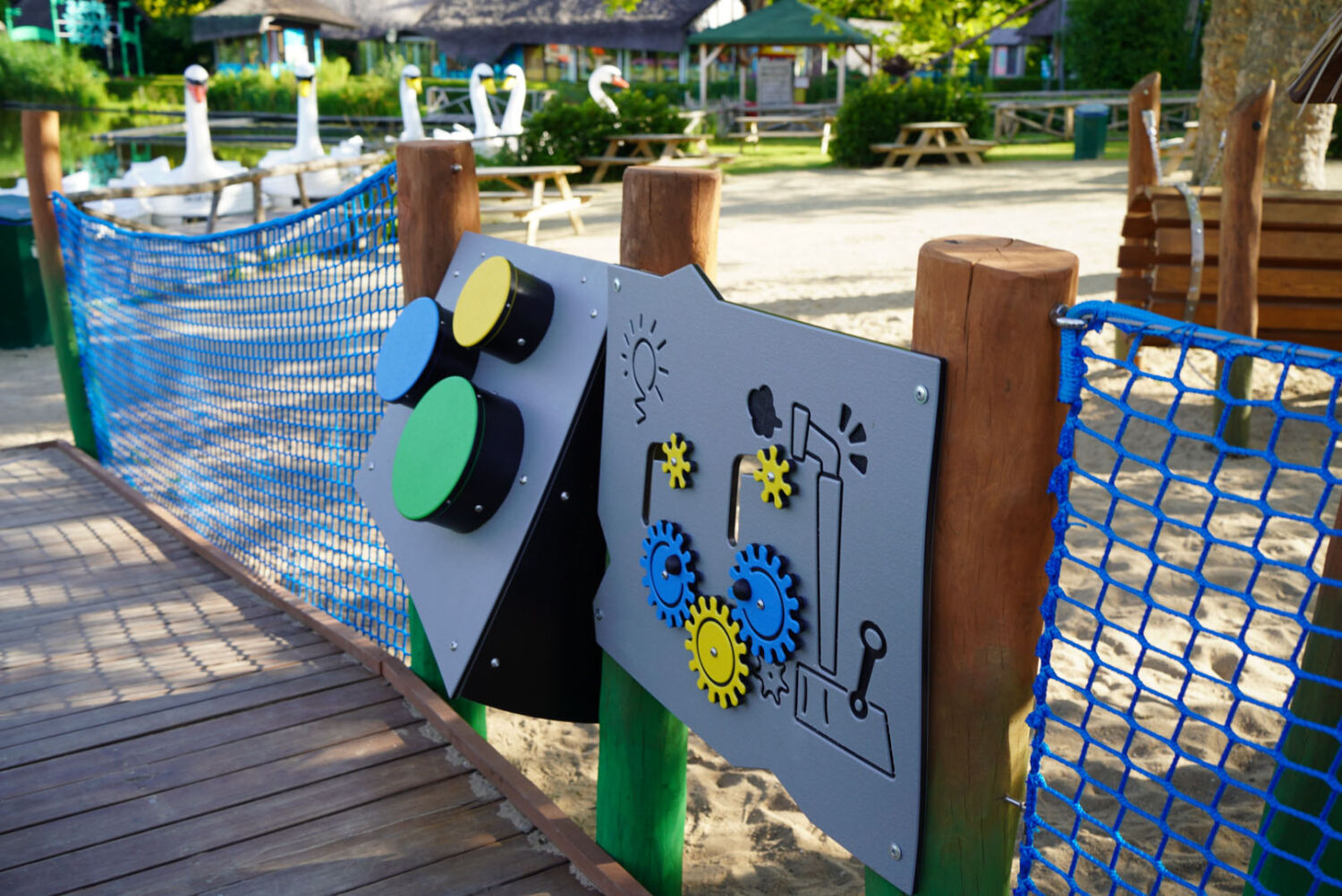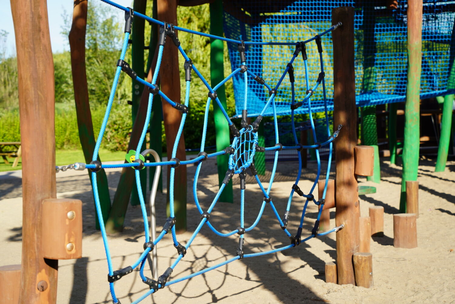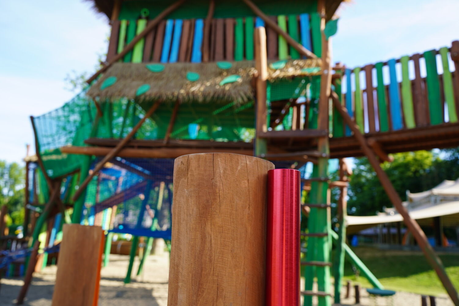 Ook de keuze voor het materiaal is bewust gemaakt. Het speeltoestel dat eerst op deze plek stond was van hout gemaakt, dus wilde de opdrachtgever graag ook een houten toestel in de plaats, omdat dit een natuurlijke uitstraling geeft. Vandaar dat wij het van Robinia hout hebben gemaakt. Om het qua uitstraling helemaal te laten passen bij de rest van het park, zijn verschillende onderdelen van het speeltoestel in de huisstijlkleuren van het park geverfd. Al het decoratiewerk is met de hand gedaan.