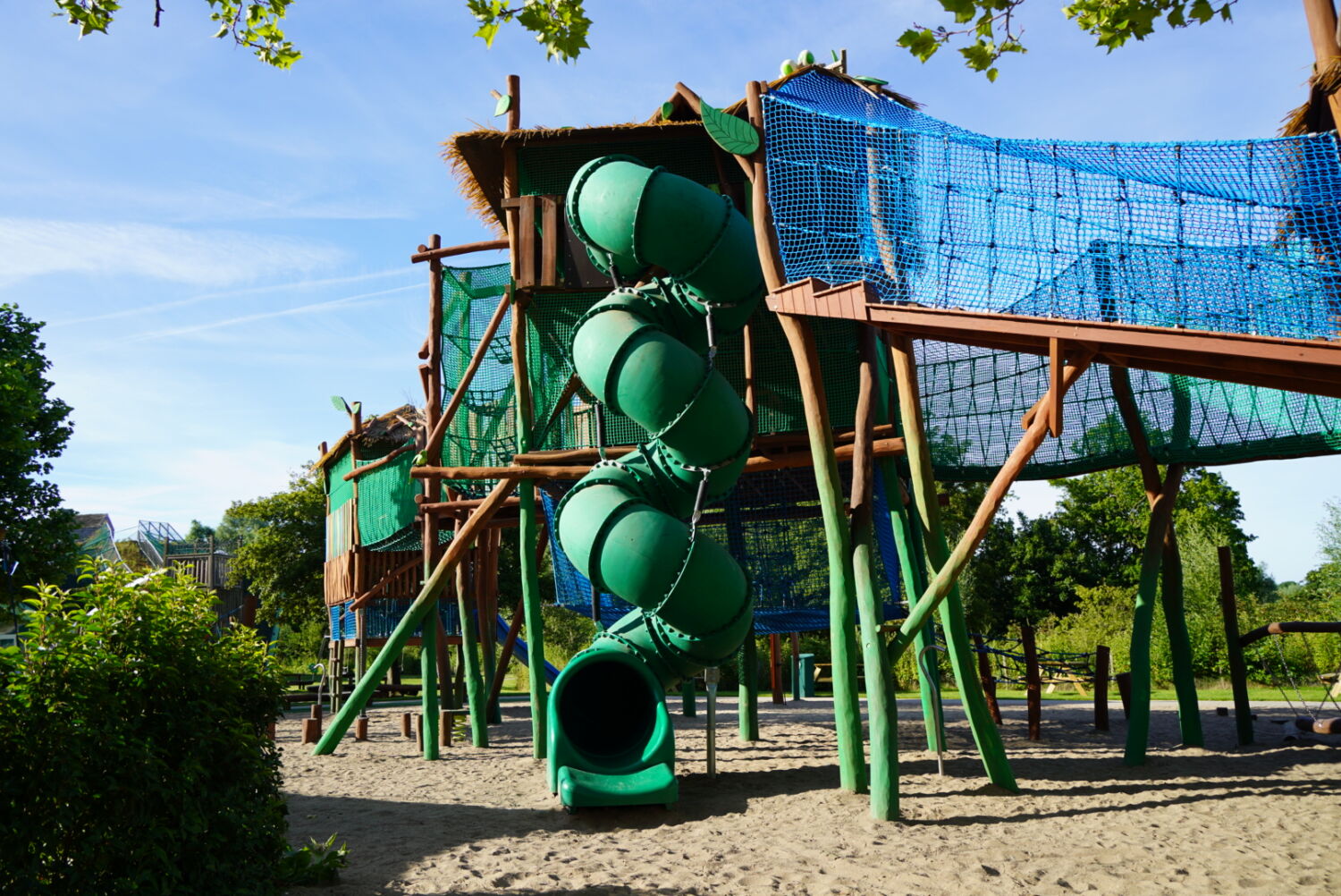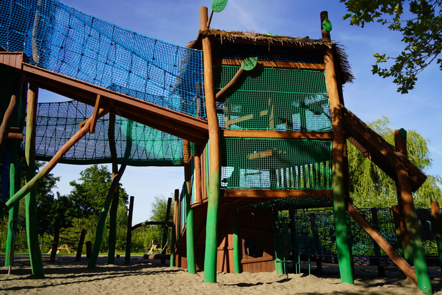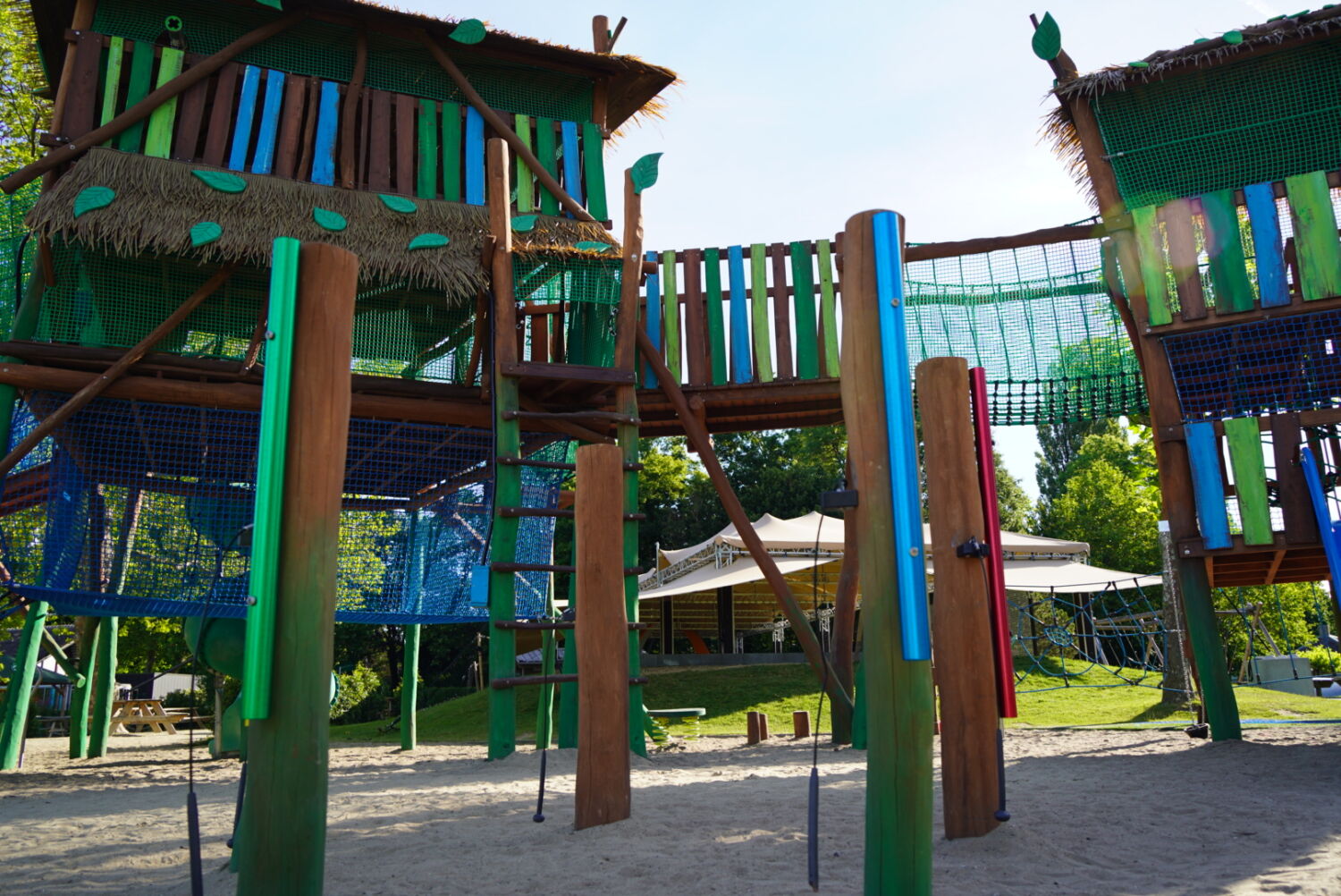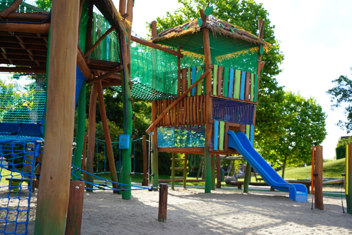 Ook de keuze voor het materiaal is bewust gemaakt. Het speeltoestel dat eerst op deze plek stond was van hout gemaakt, dus wilde de opdrachtgever graag ook een houten toestel in de plaats, omdat dit een natuurlijke uitstraling geeft. Vandaar dat wij het van Robinia hout hebben gemaakt. Om het qua uitstraling helemaal te laten passen bij de rest van het park, zijn verschillende onderdelen van het speeltoestel in de huisstijlkleuren van het park geverfd. Al het decoratiewerk is met de hand gedaan.