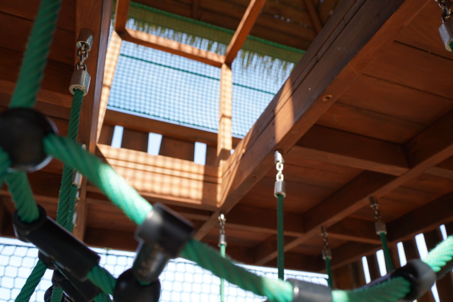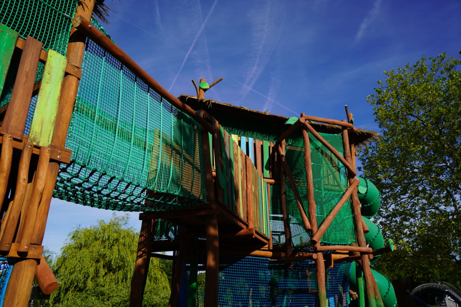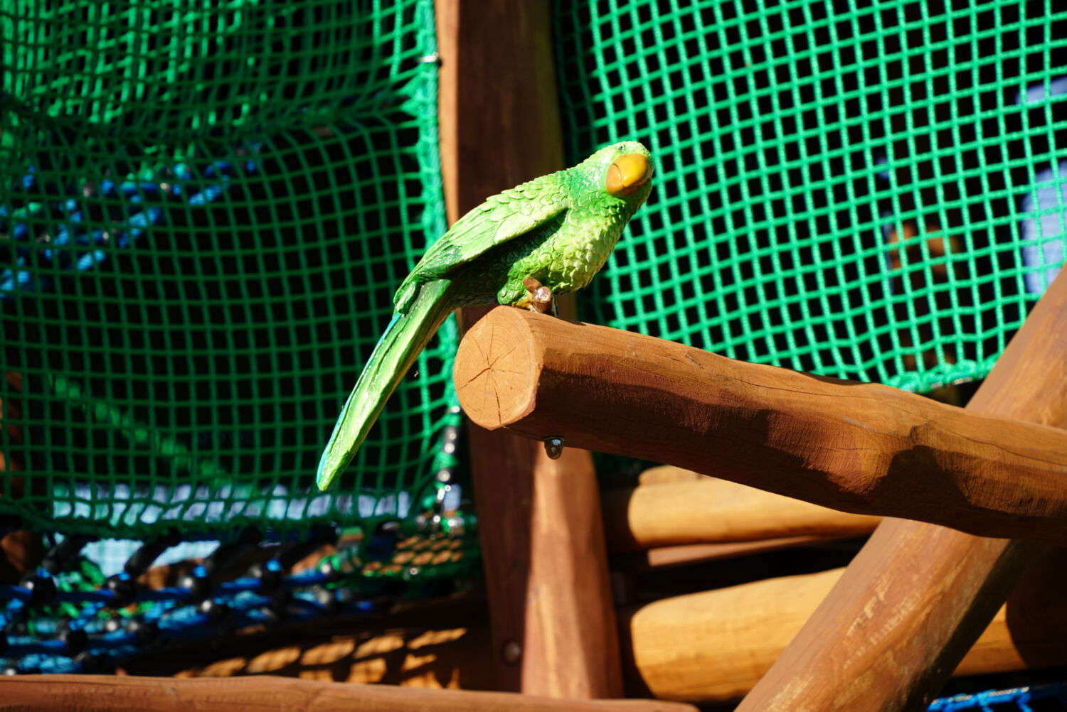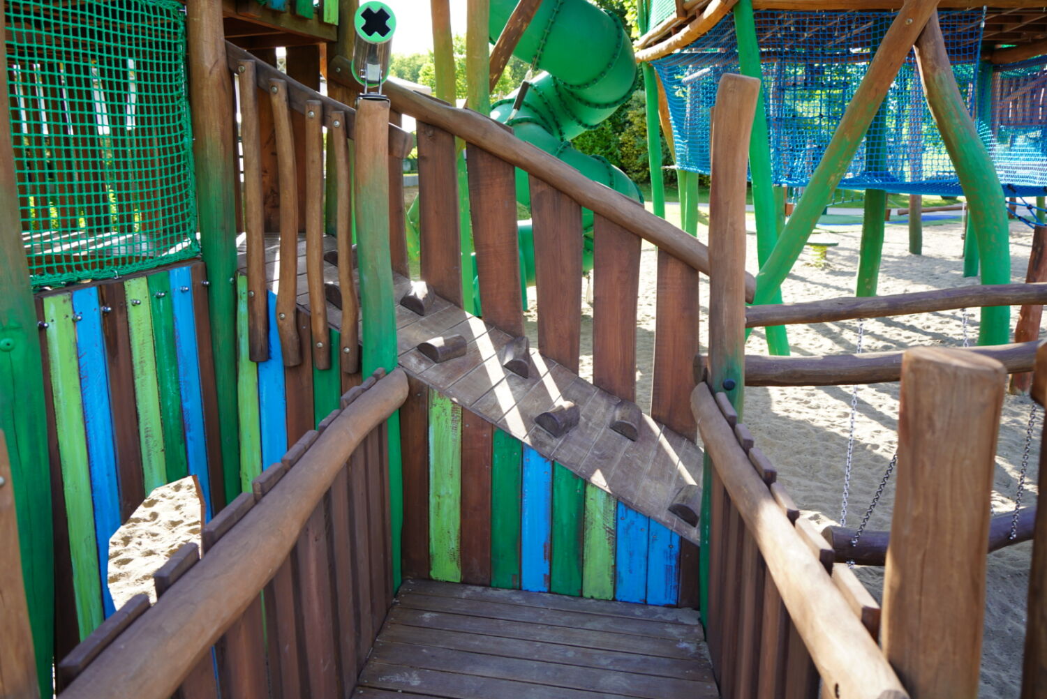 Ook de keuze voor het materiaal is bewust gemaakt. Het speeltoestel dat eerst op deze plek stond was van hout gemaakt, dus wilde de opdrachtgever graag ook een houten toestel in de plaats, omdat dit een natuurlijke uitstraling geeft. Vandaar dat wij het van Robinia hout hebben gemaakt. Om het qua uitstraling helemaal te laten passen bij de rest van het park, zijn verschillende onderdelen van het speeltoestel in de huisstijlkleuren van het park geverfd. Al het decoratiewerk is met de hand gedaan.