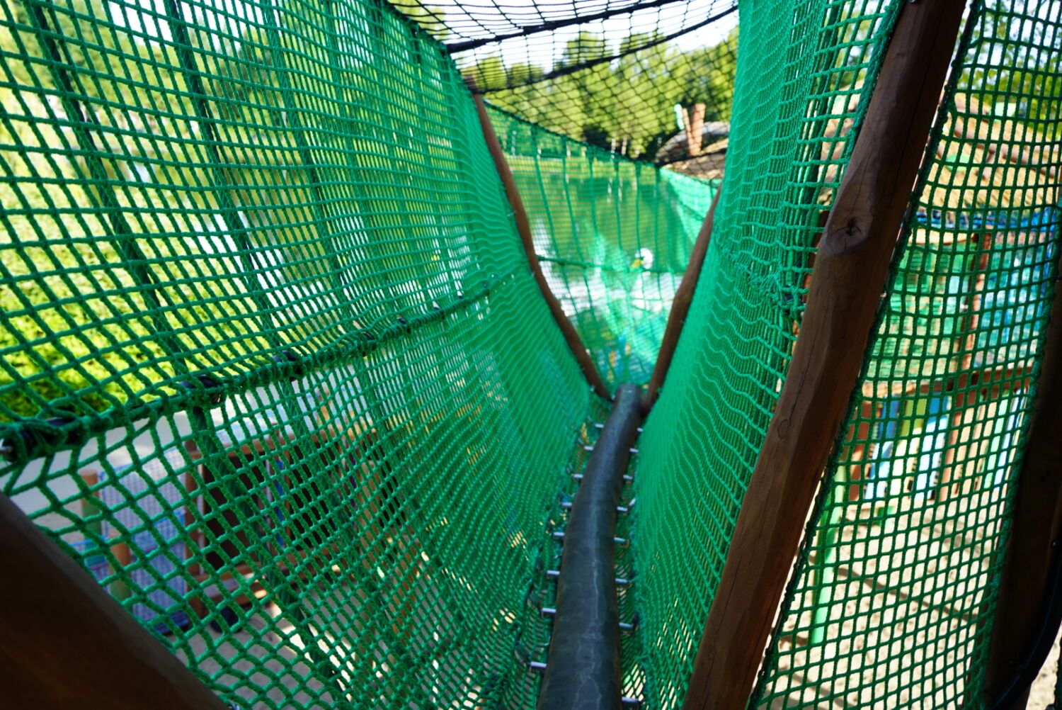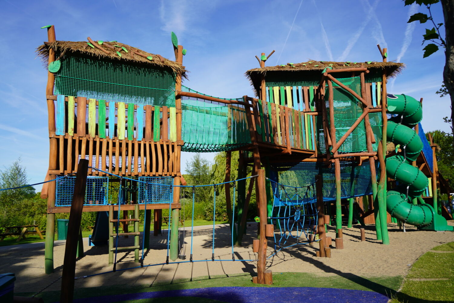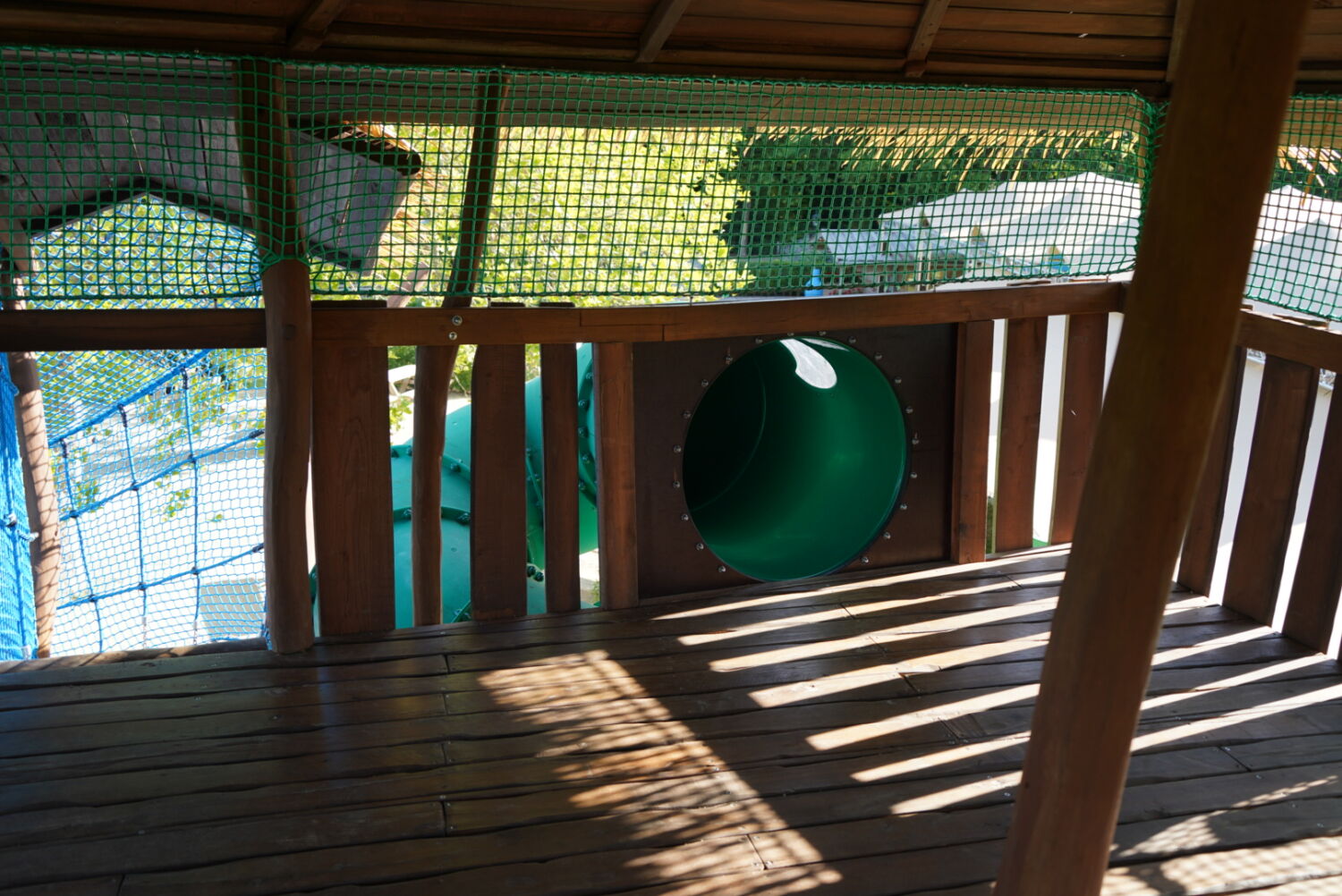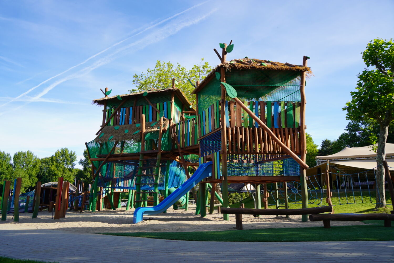 Ook de keuze voor het materiaal is bewust gemaakt. Het speeltoestel dat eerst op deze plek stond was van hout gemaakt, dus wilde de opdrachtgever graag ook een houten toestel in de plaats, omdat dit een natuurlijke uitstraling geeft. Vandaar dat wij het van Robinia hout hebben gemaakt. Om het qua uitstraling helemaal te laten passen bij de rest van het park, zijn verschillende onderdelen van het speeltoestel in de huisstijlkleuren van het park geverfd. Al het decoratiewerk is met de hand gedaan.