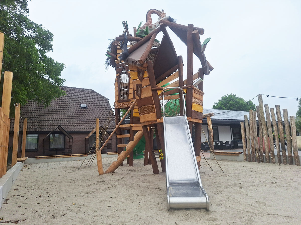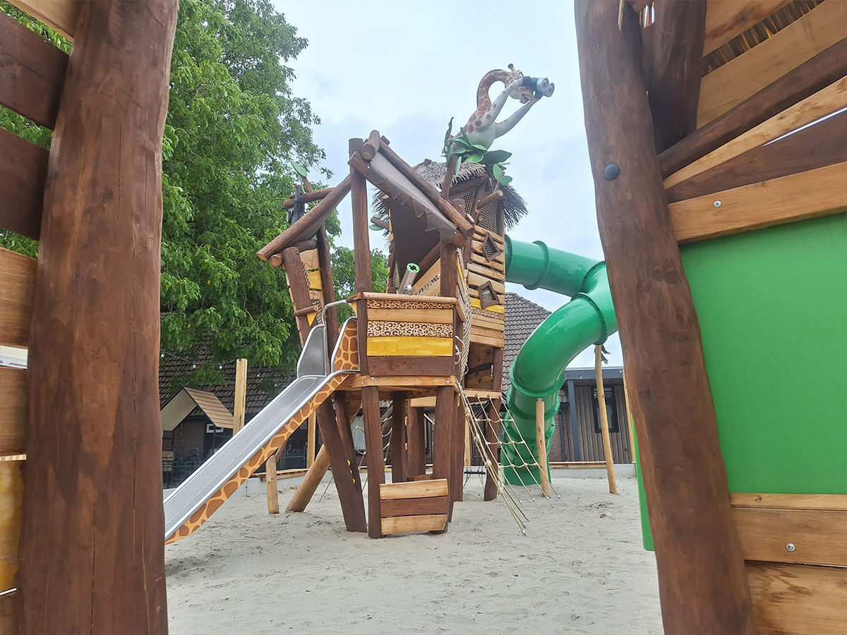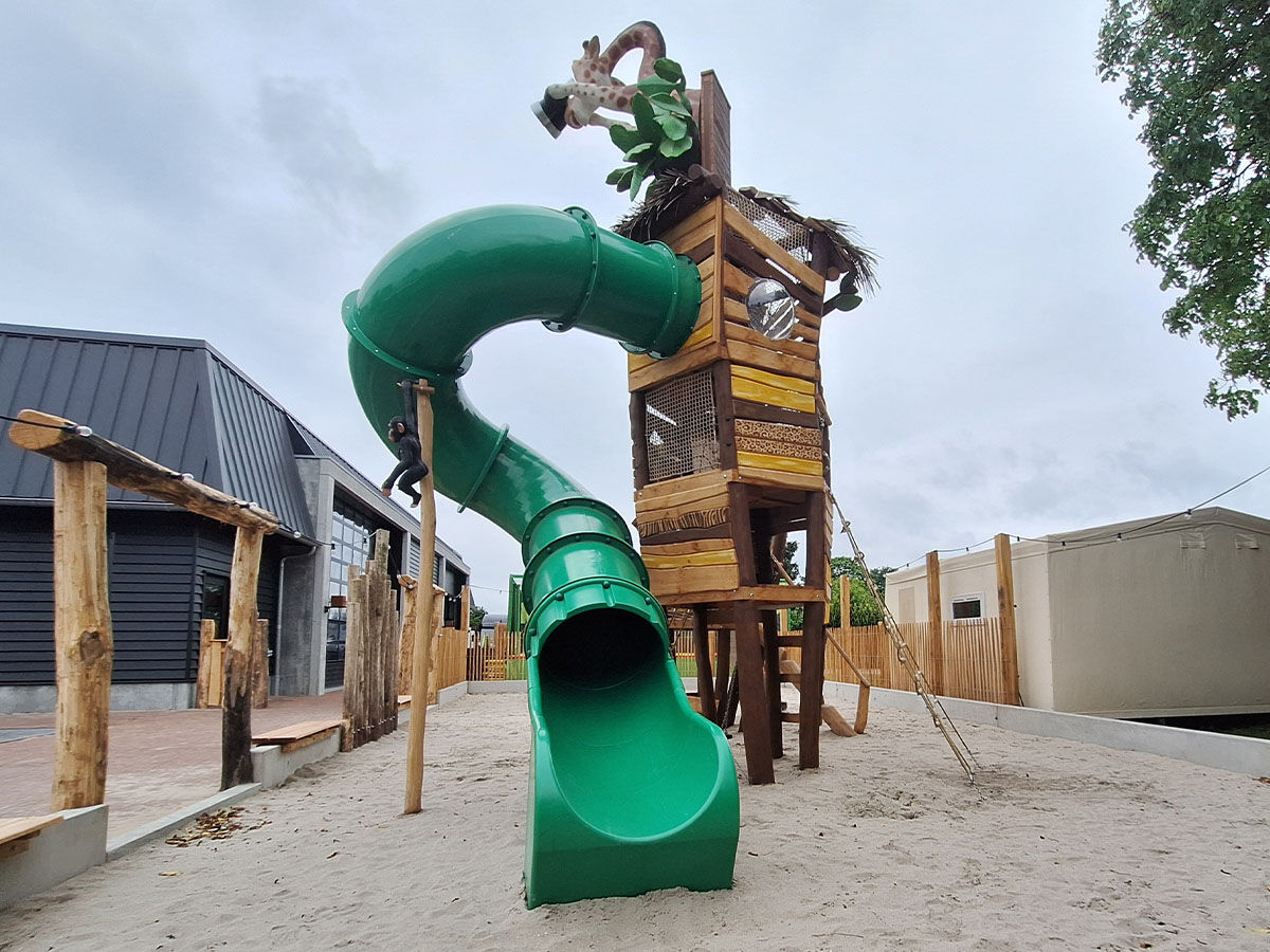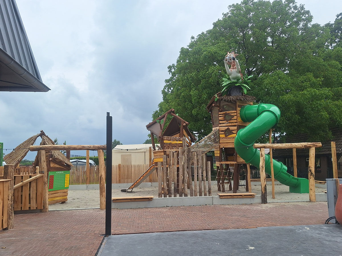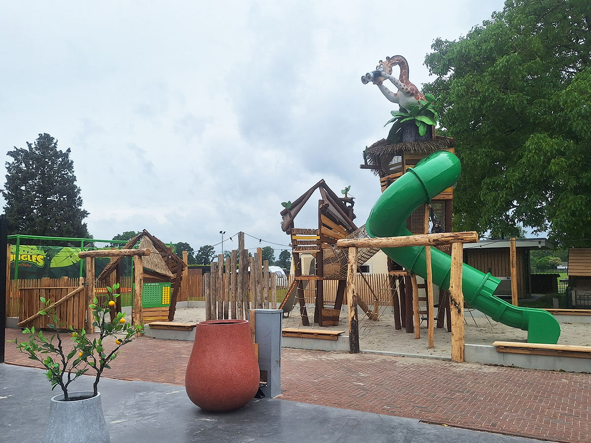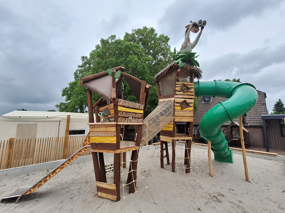 Een levensgrote tijger wijst de weg naar de grote speelplek, die is uitgevoerd in een avontuurlijk junglethema. Deze centrale speelzone is écht uniek dankzij de indrukwekkende polyester dieren: twee apen hangen speels aan touwen en boven op de grote toren staat een grote giraf met een verrekijker. Deze kijkt speels uit over het park en verwelkomt de gasten bij binnenkomst. De combinatie van thematische details, natuurlijke integratie en speelse uitdaging maakt deze speelplek tot een echte blikvanger van het vakantiepark.