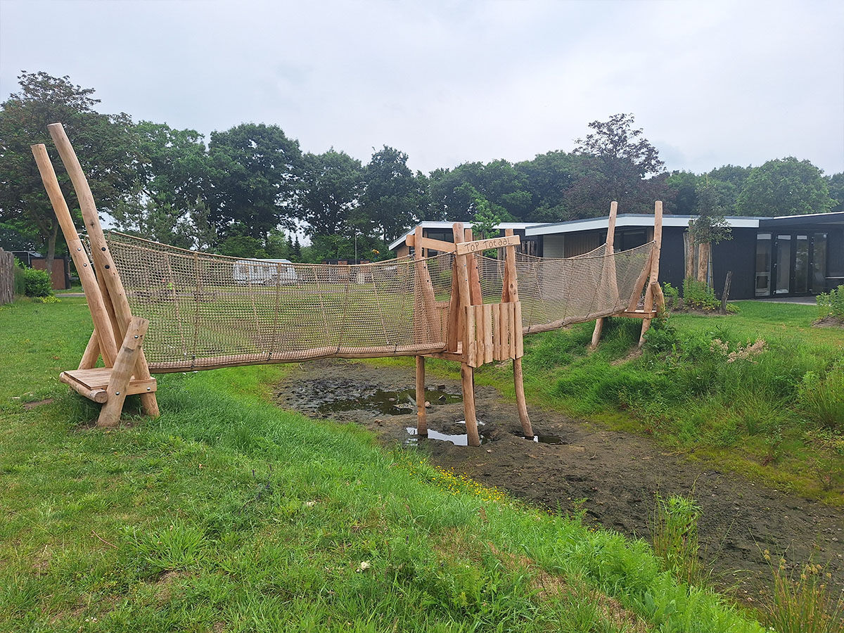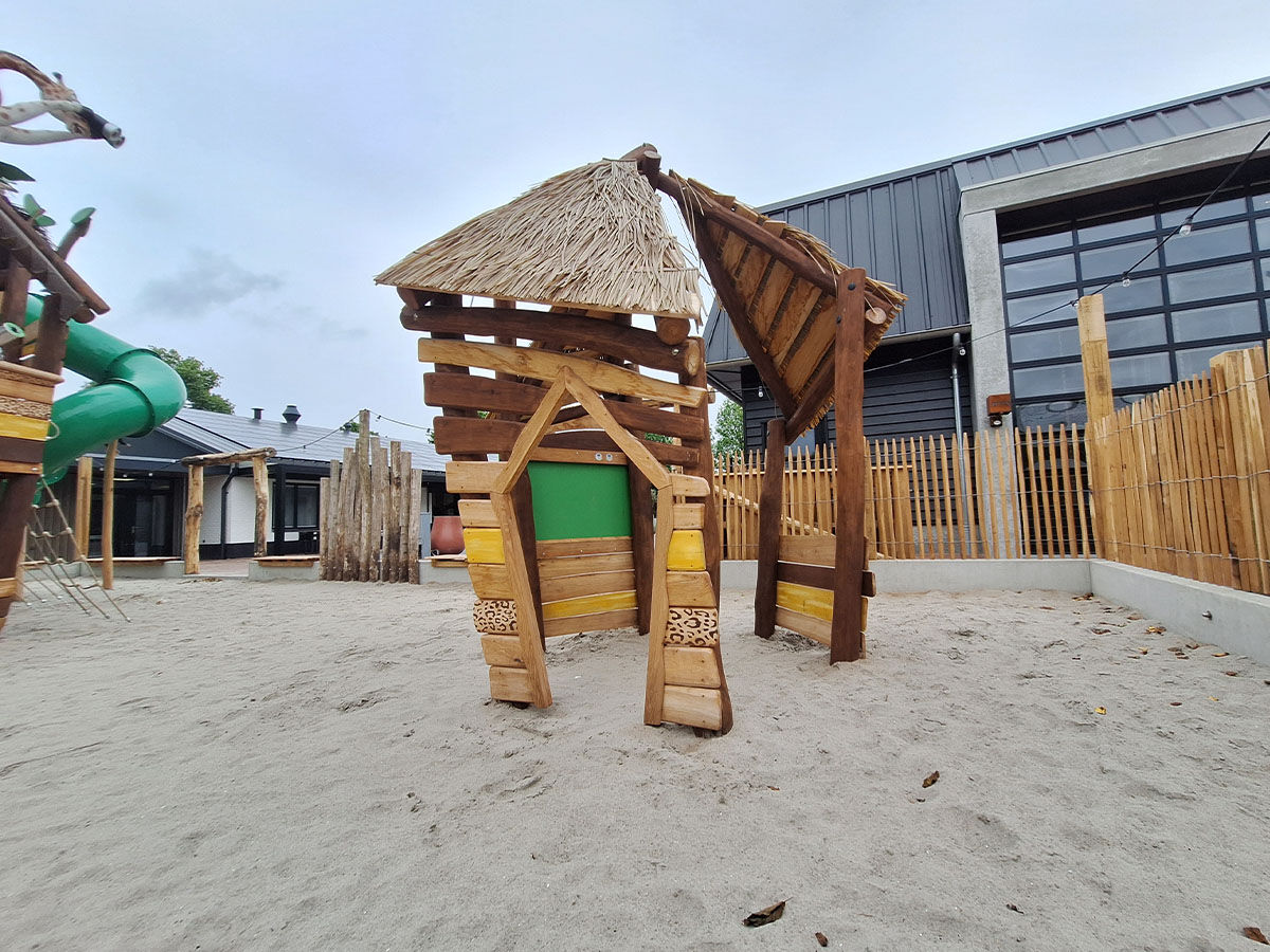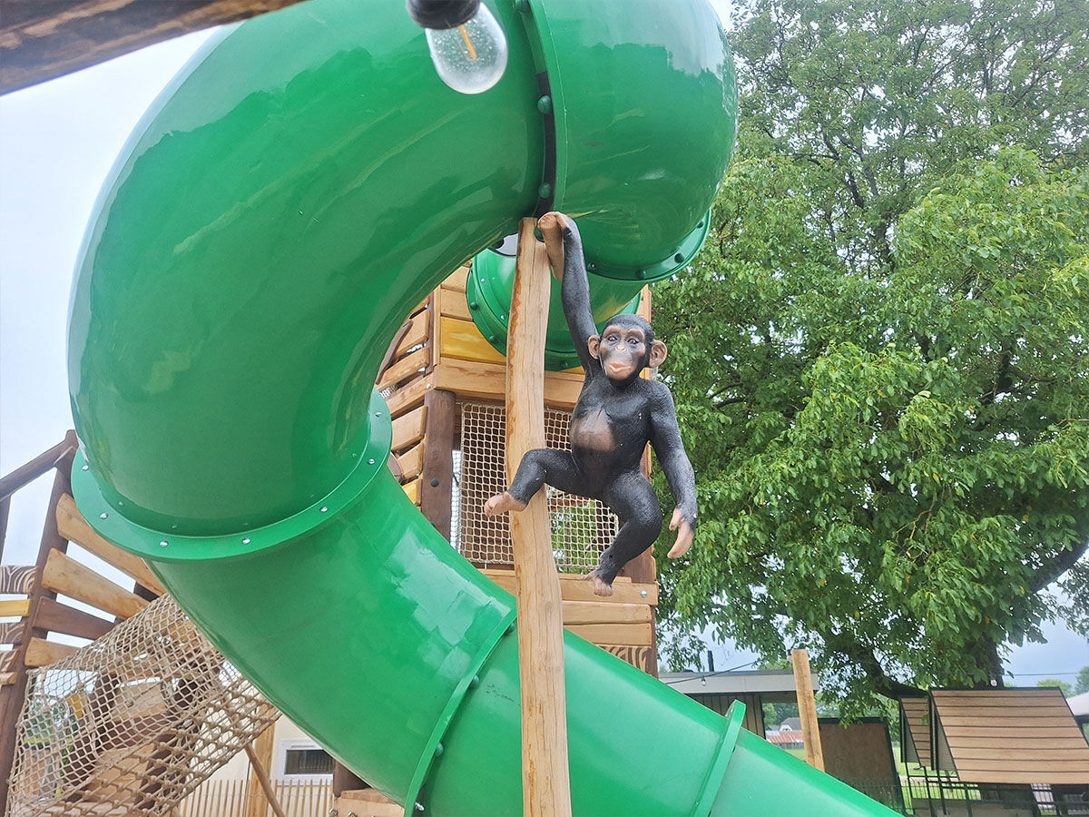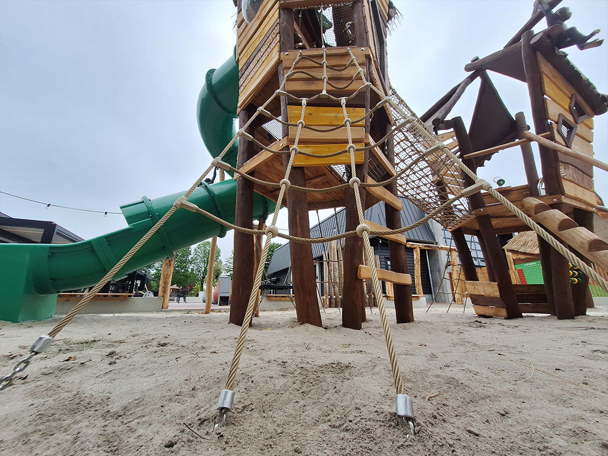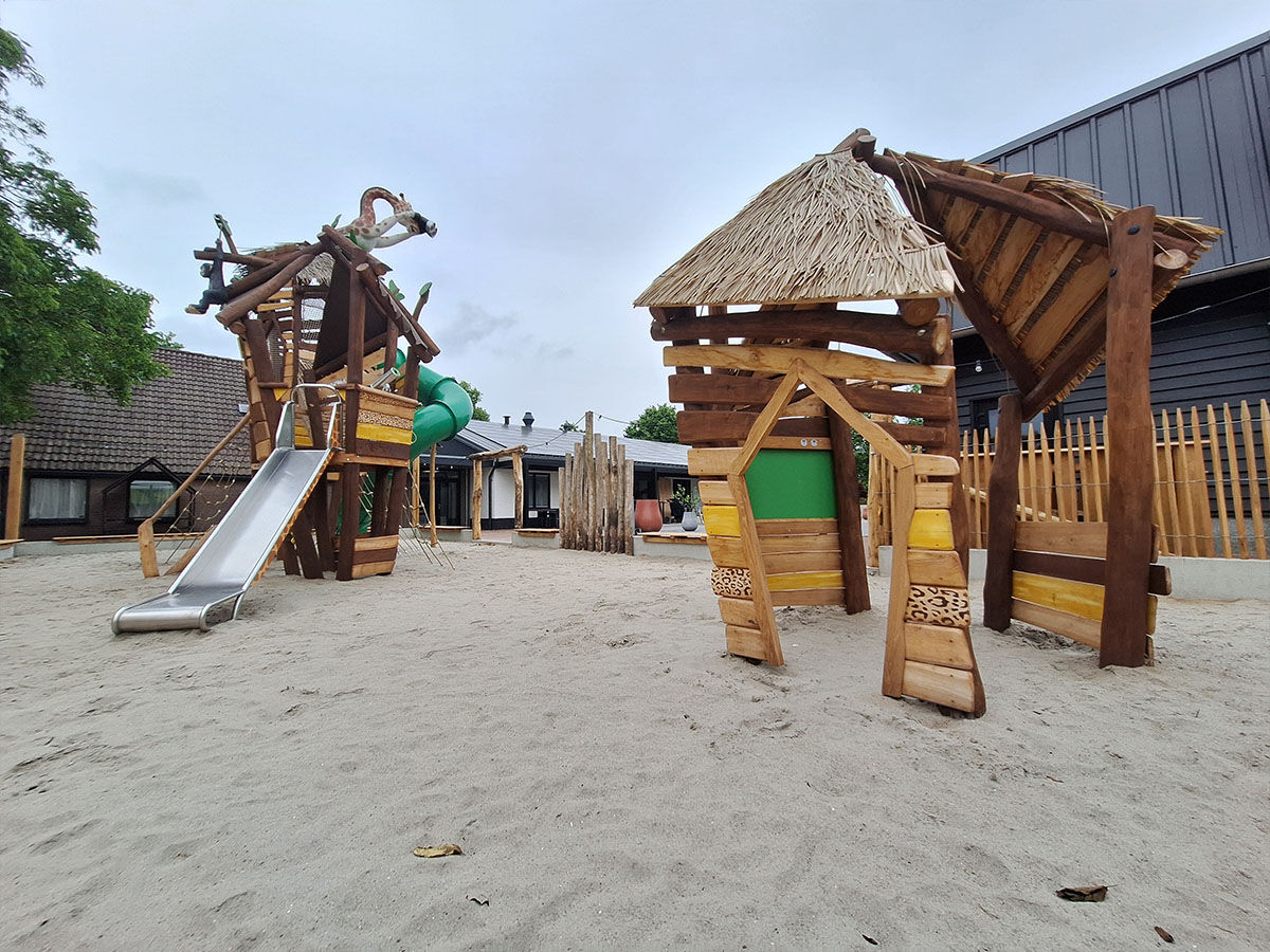 Een levensgrote tijger wijst de weg naar de grote speelplek, die is uitgevoerd in een avontuurlijk junglethema. Deze centrale speelzone is écht uniek dankzij de indrukwekkende polyester dieren: twee apen hangen speels aan touwen en boven op de grote toren staat een grote giraf met een verrekijker. Deze kijkt speels uit over het park en verwelkomt de gasten bij binnenkomst. De combinatie van thematische details, natuurlijke integratie en speelse uitdaging maakt deze speelplek tot een echte blikvanger van het vakantiepark.