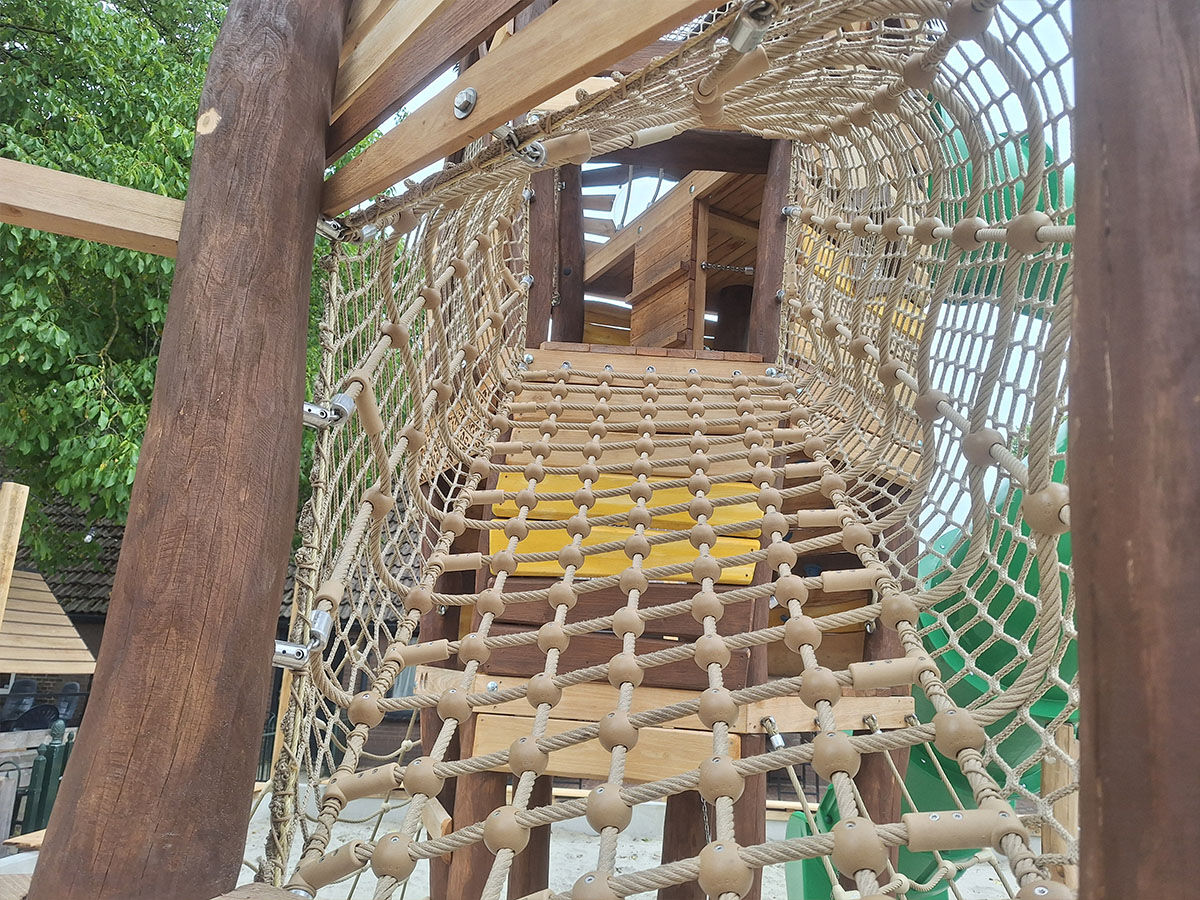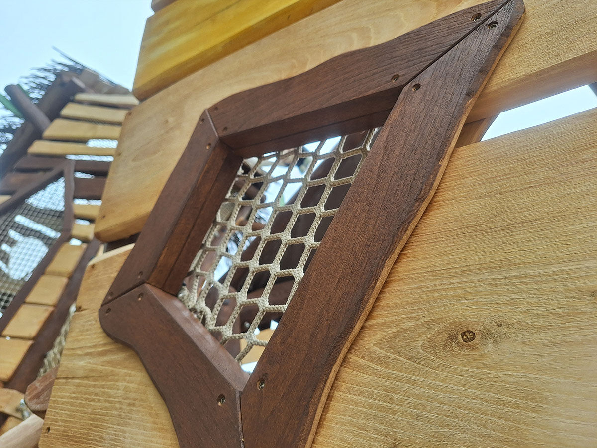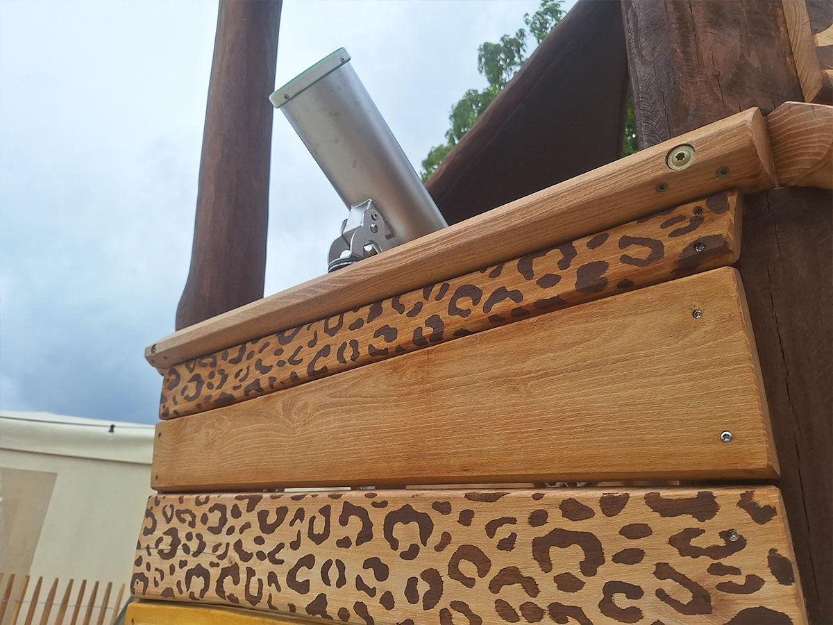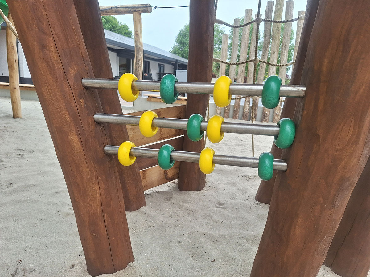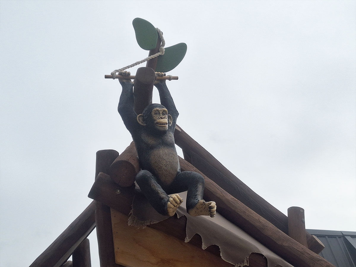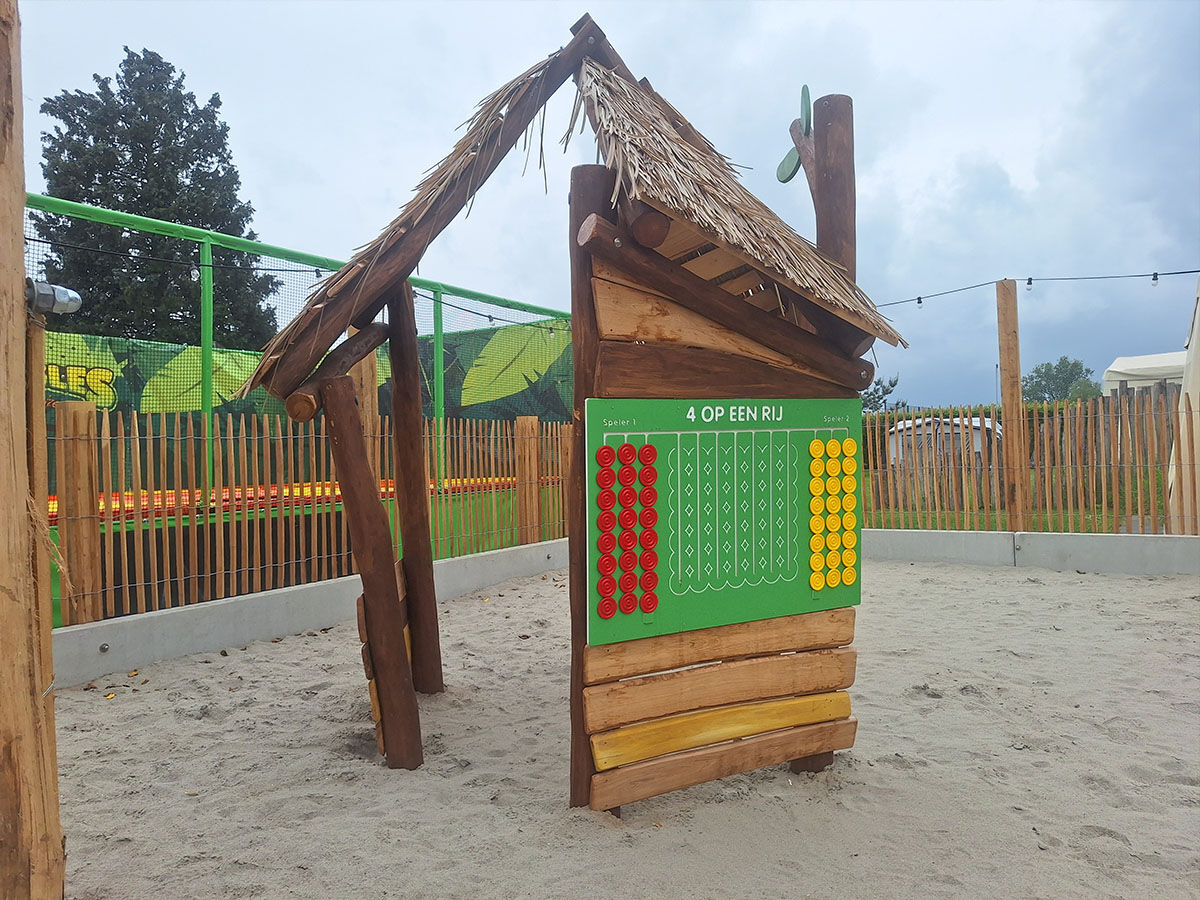 Een levensgrote tijger wijst de weg naar de grote speelplek, die is uitgevoerd in een avontuurlijk junglethema. Deze centrale speelzone is écht uniek dankzij de indrukwekkende polyester dieren: twee apen hangen speels aan touwen en boven op de grote toren staat een grote giraf met een verrekijker. Deze kijkt speels uit over het park en verwelkomt de gasten bij binnenkomst. De combinatie van thematische details, natuurlijke integratie en speelse uitdaging maakt deze speelplek tot een echte blikvanger van het vakantiepark.