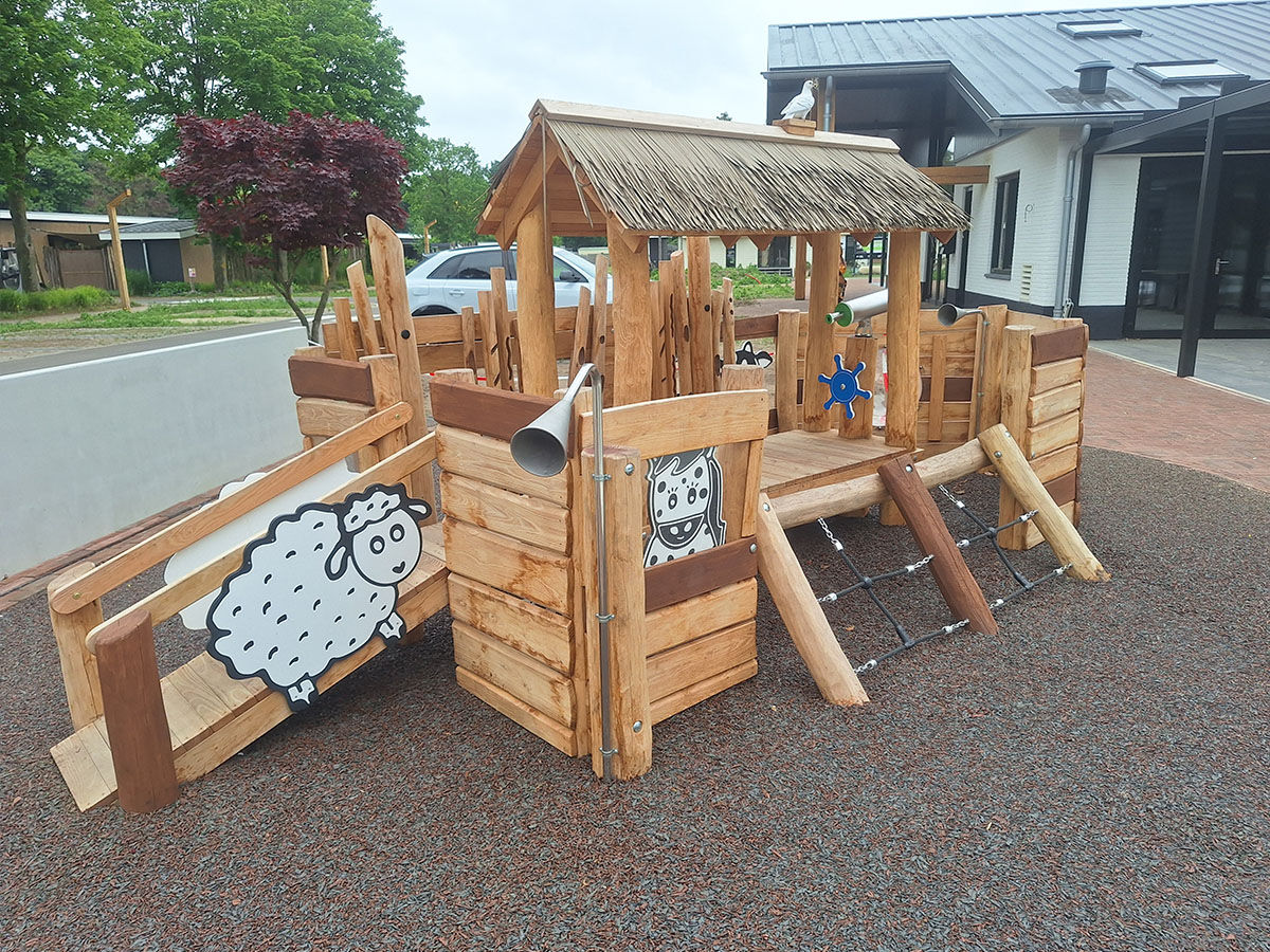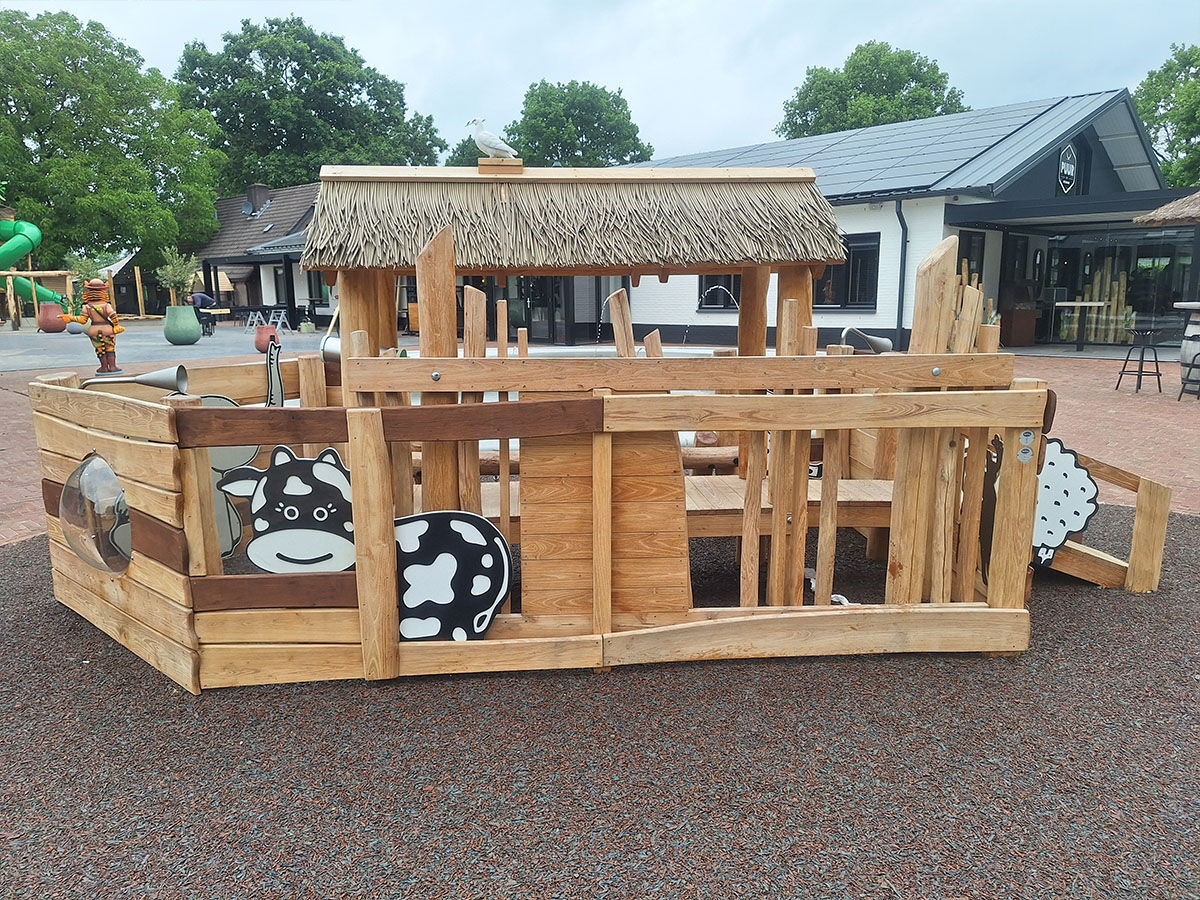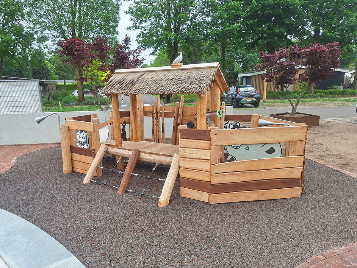 Samen ontwikkelden we diverse speelelementen die verspreid over het park zorgen voor plezier én verwondering. Zo ontwierpen we een thematische ark naast de receptie, waar kinderen kunnen spelen terwijl hun ouders rustig inchecken. De ark is aangekleed met dieren die ook daadwerkelijk op de Ark van Noach voorkwamen – waaronder een koe, een schaap en een duif die hoog op het dak pronkt. Dit element zorgt voor een herkenbaar verhaal en een warme, speelse entree van het park.