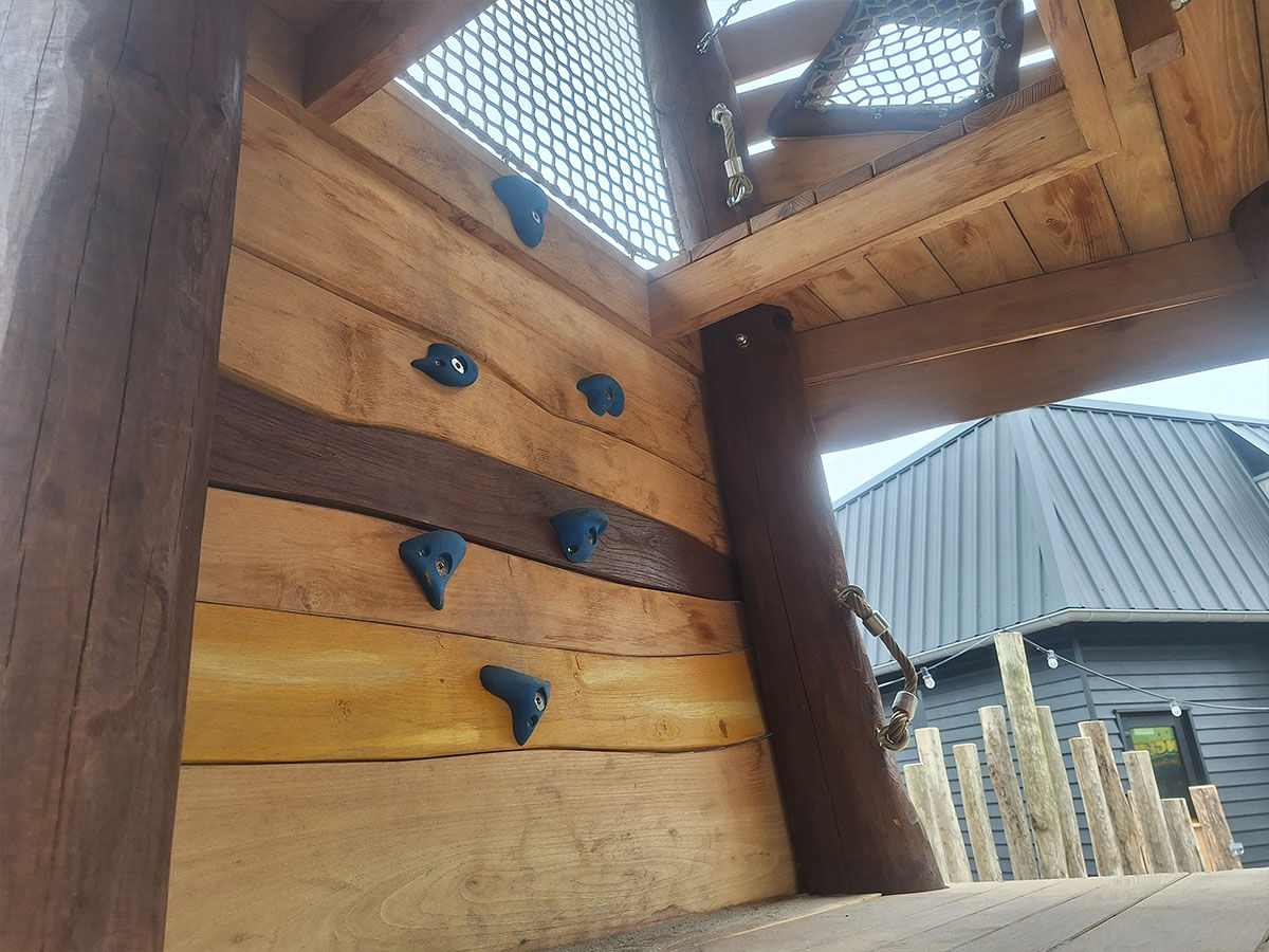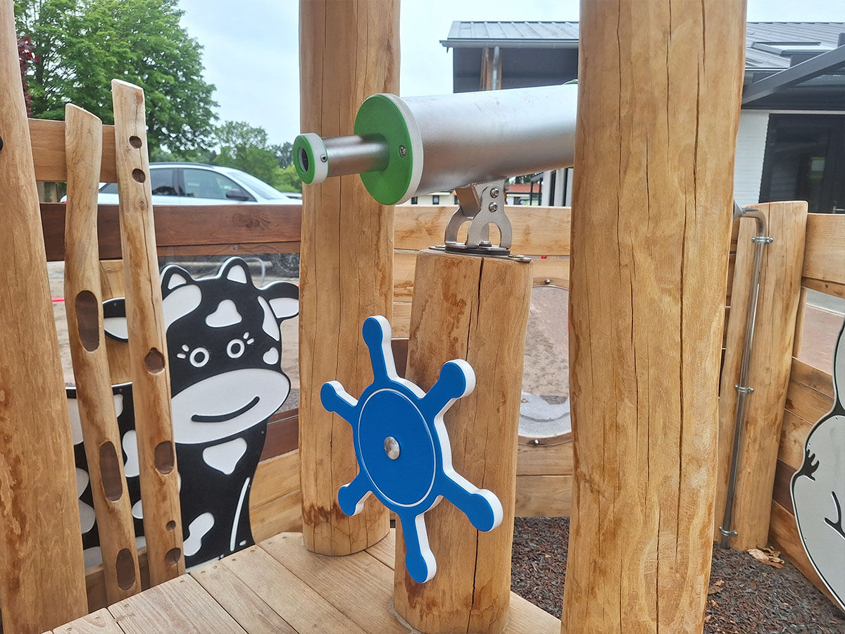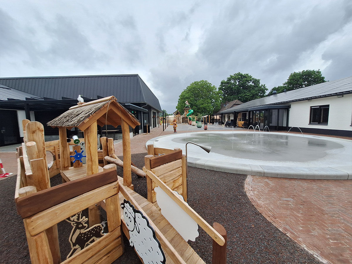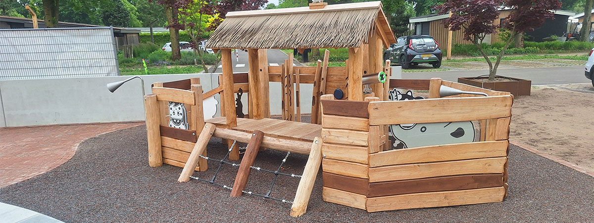 Samen ontwikkelden we diverse speelelementen die verspreid over het park zorgen voor plezier én verwondering. Zo ontwierpen we een thematische ark naast de receptie, waar kinderen kunnen spelen terwijl hun ouders rustig inchecken. De ark is aangekleed met dieren die ook daadwerkelijk op de Ark van Noach voorkwamen – waaronder een koe, een schaap en een duif die hoog op het dak pronkt. Dit element zorgt voor een herkenbaar verhaal en een warme, speelse entree van het park.