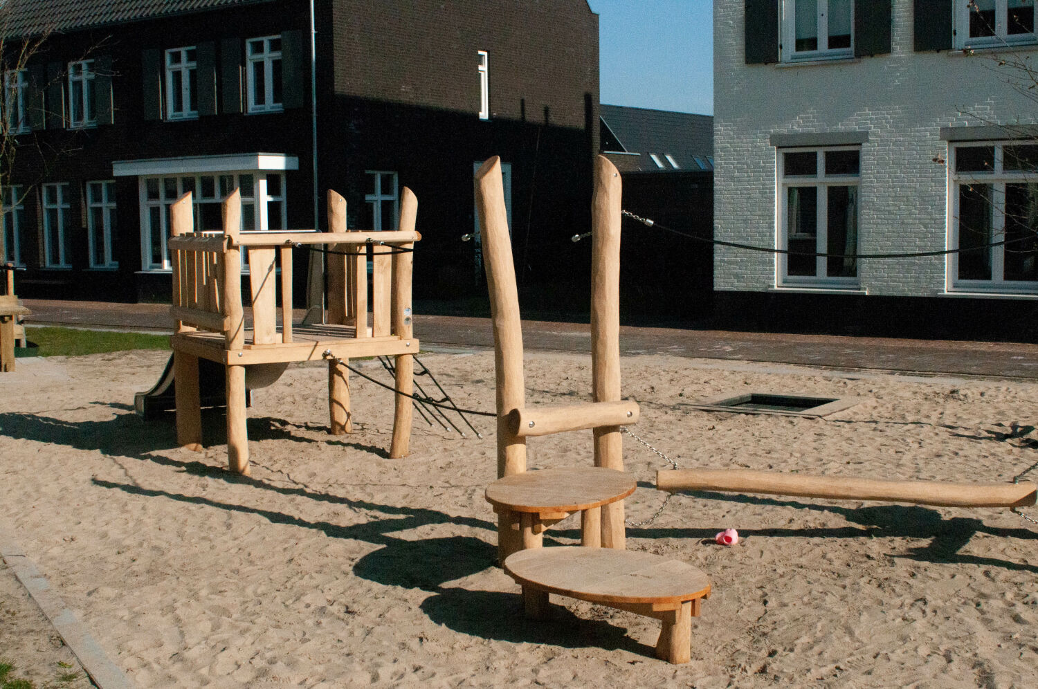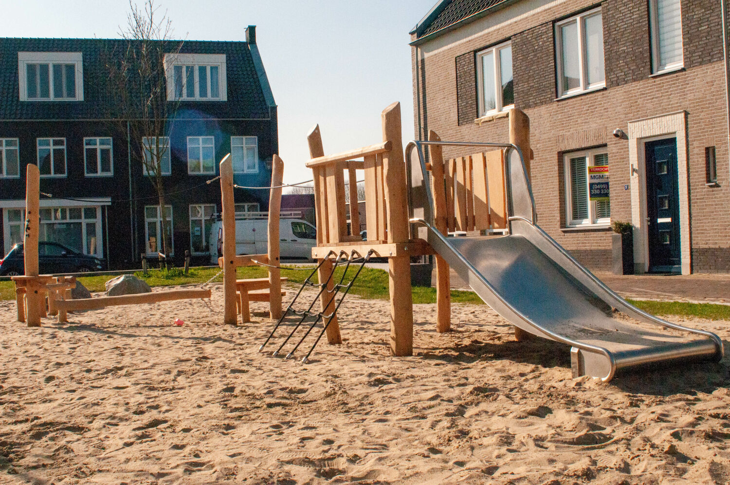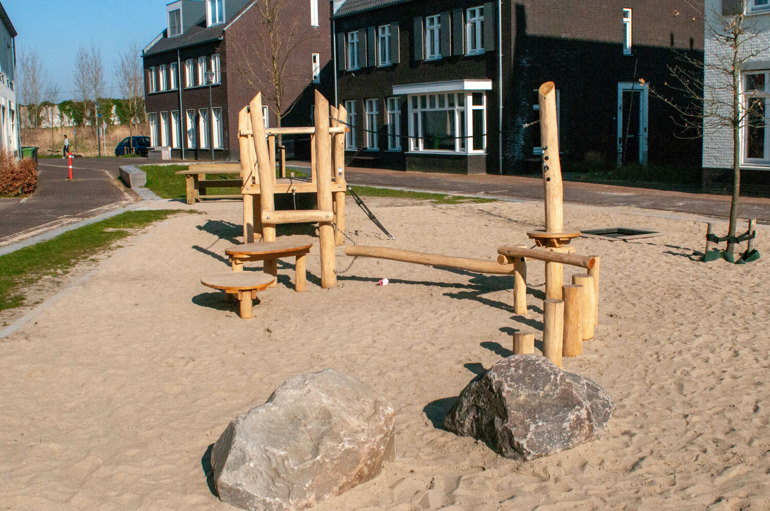 Het speelparcours en de wip zijn gemaakt van Robinia hout, de trampoline van rubber. De ondergrond van de speeltuin is van zand. Deze natuurlijke materialen passen goed in het straatbeeld van de nieuwbouwwijk.