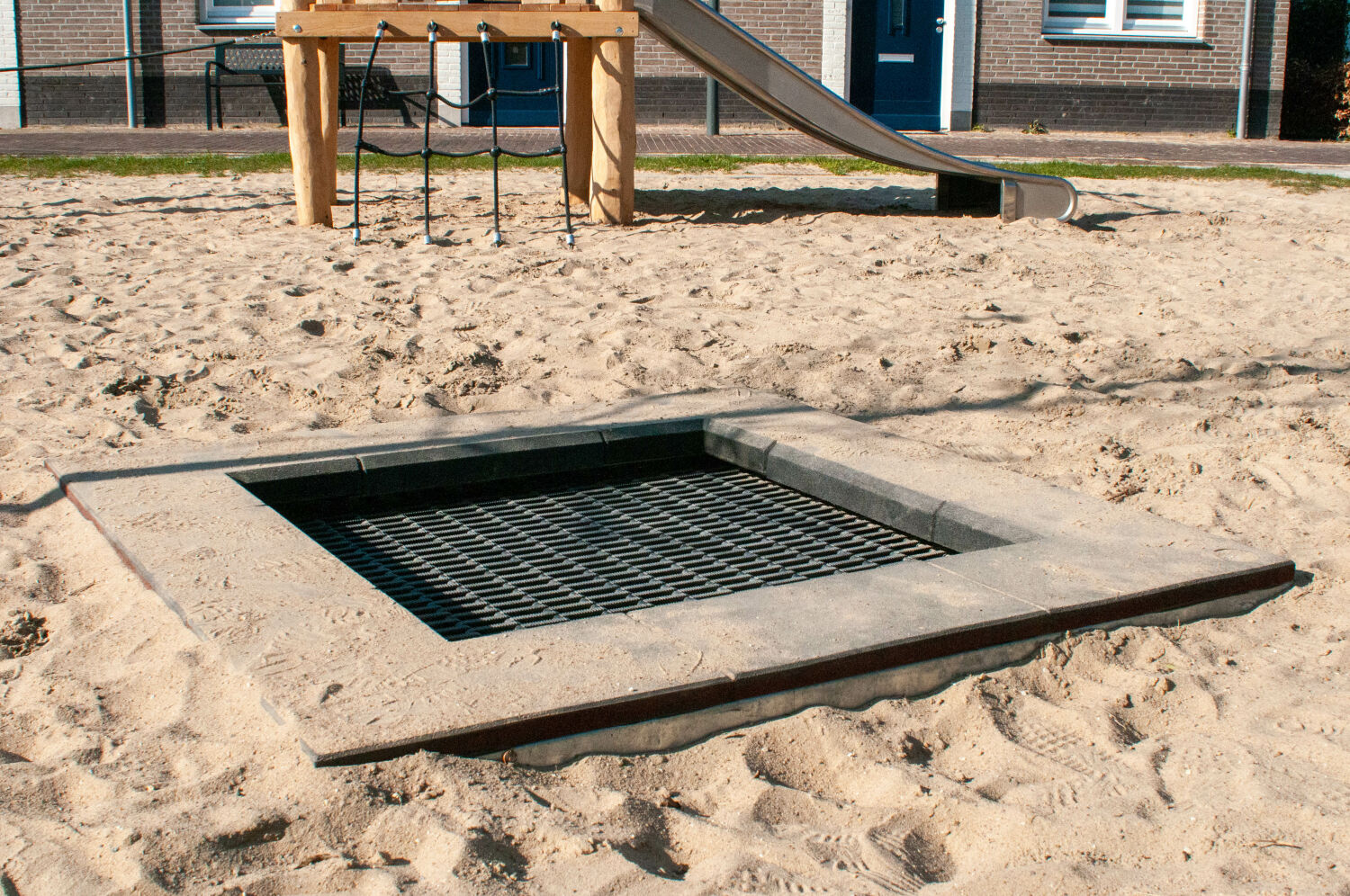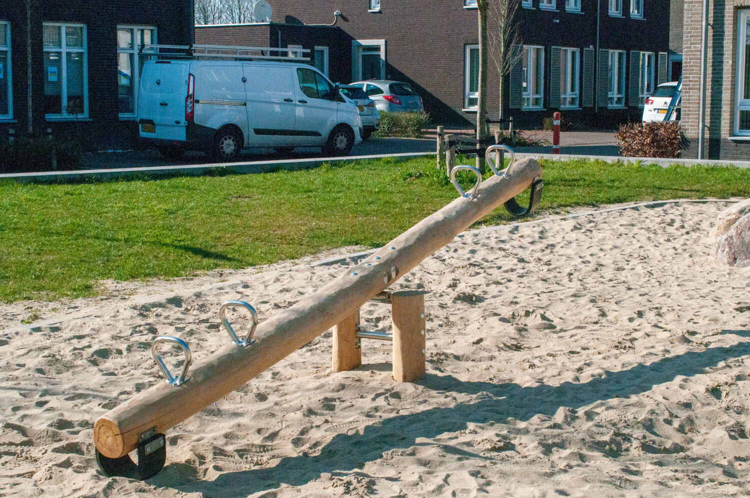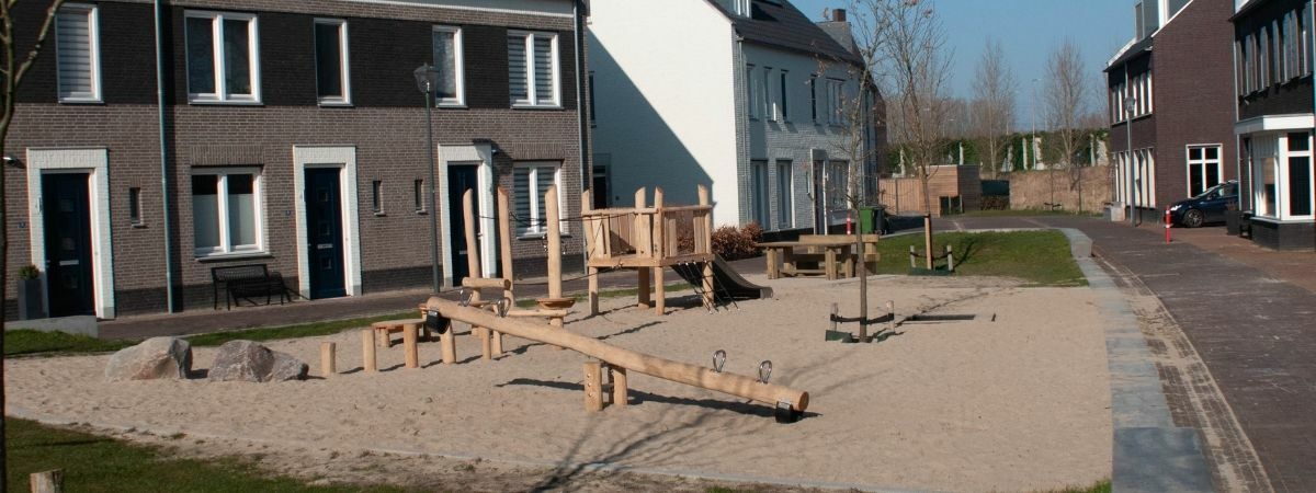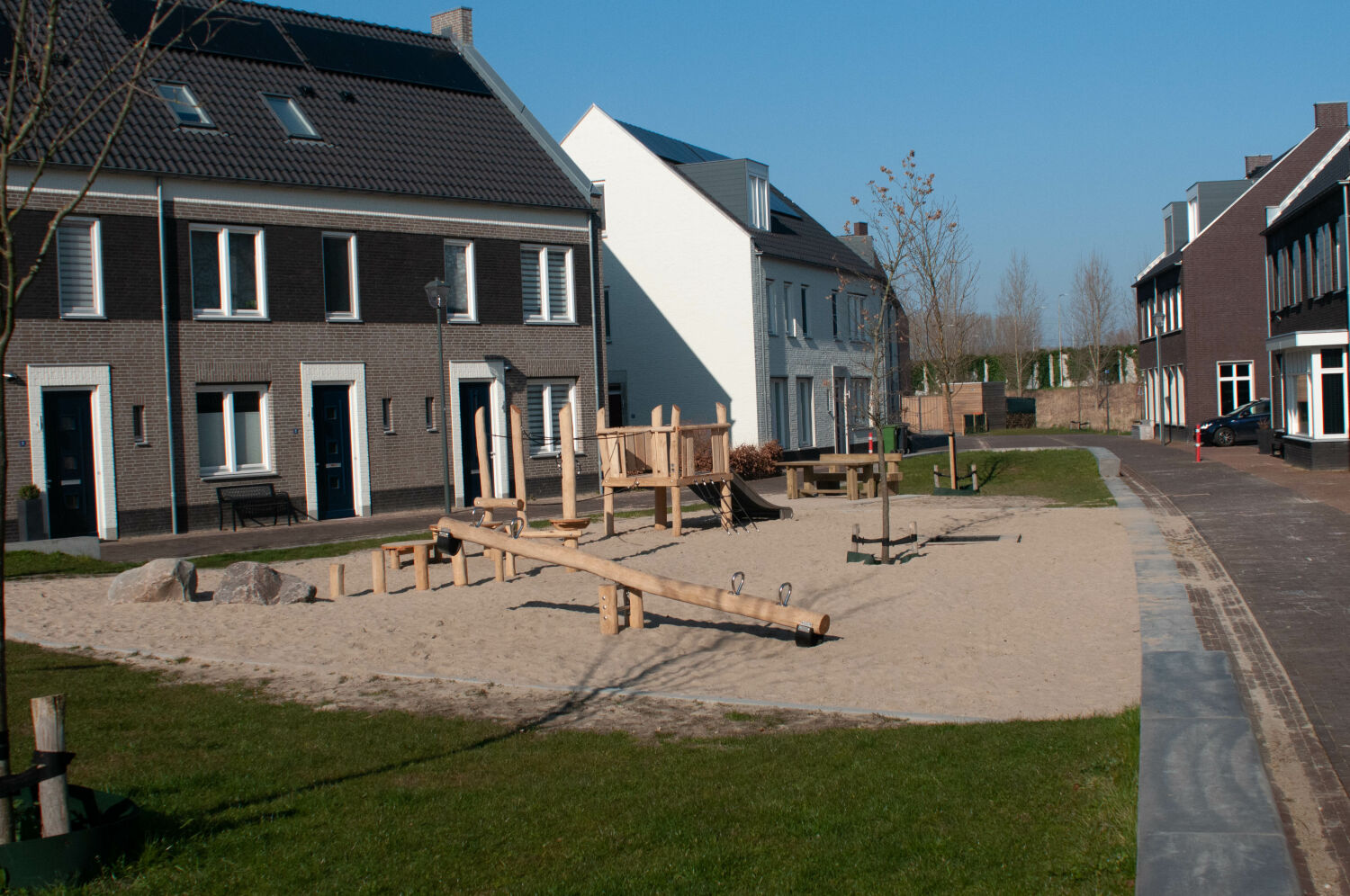 Het speelparcours en de wip zijn gemaakt van Robinia hout, de trampoline van rubber. De ondergrond van de speeltuin is van zand. Deze natuurlijke materialen passen goed in het straatbeeld van de nieuwbouwwijk.