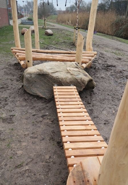 Het was sowieso van belang dat het uiterlijk van de speeltuin goed bij de uitstraling van de nieuwbouwwijk zou passen. Ze hadden voor de speelplek een zo natuurlijk mogelijke uitstraling in gedachte. Om die reden zijn we bij speeltoestellen gemaakt van Robinia hout uitgekomen.