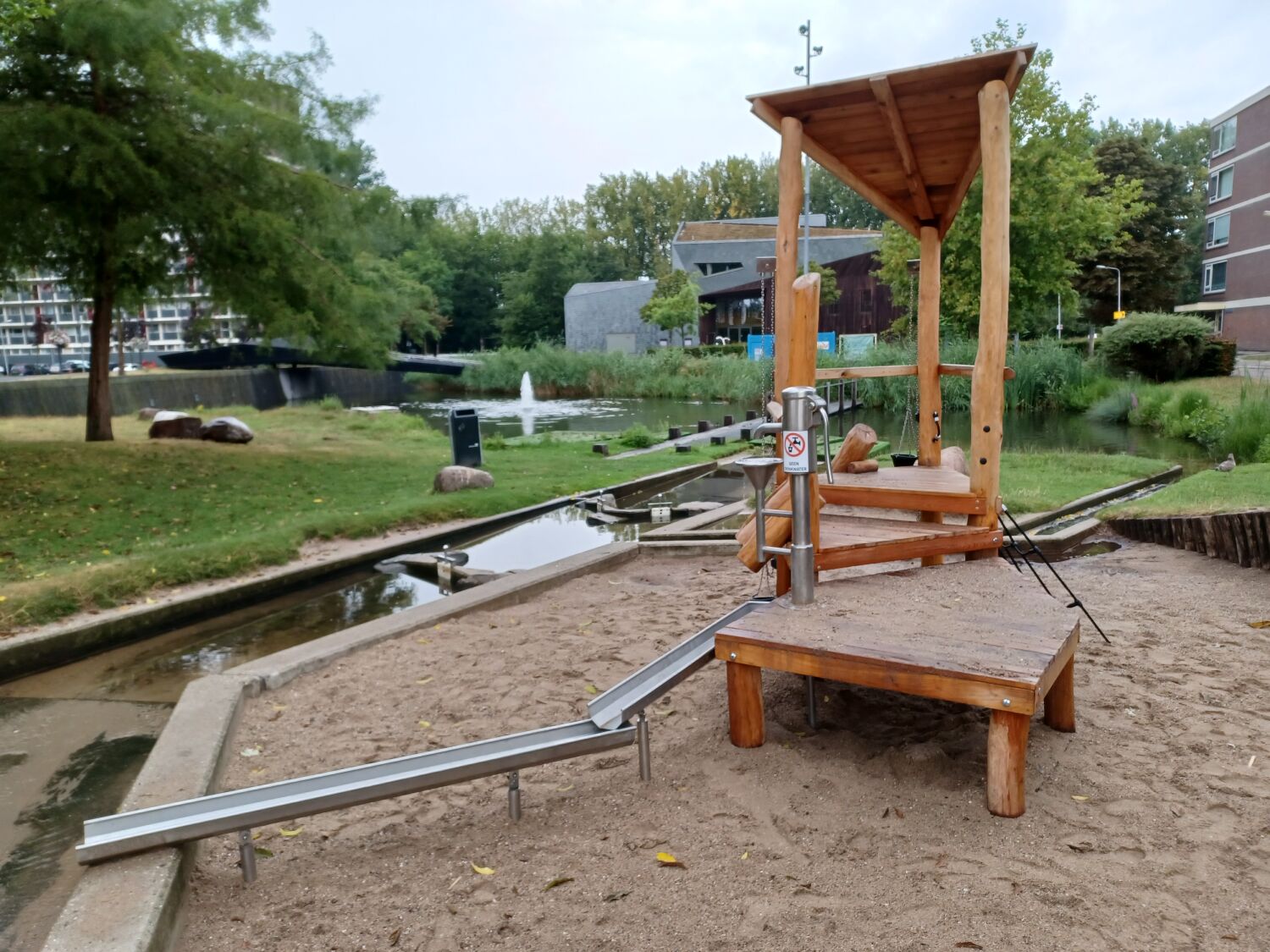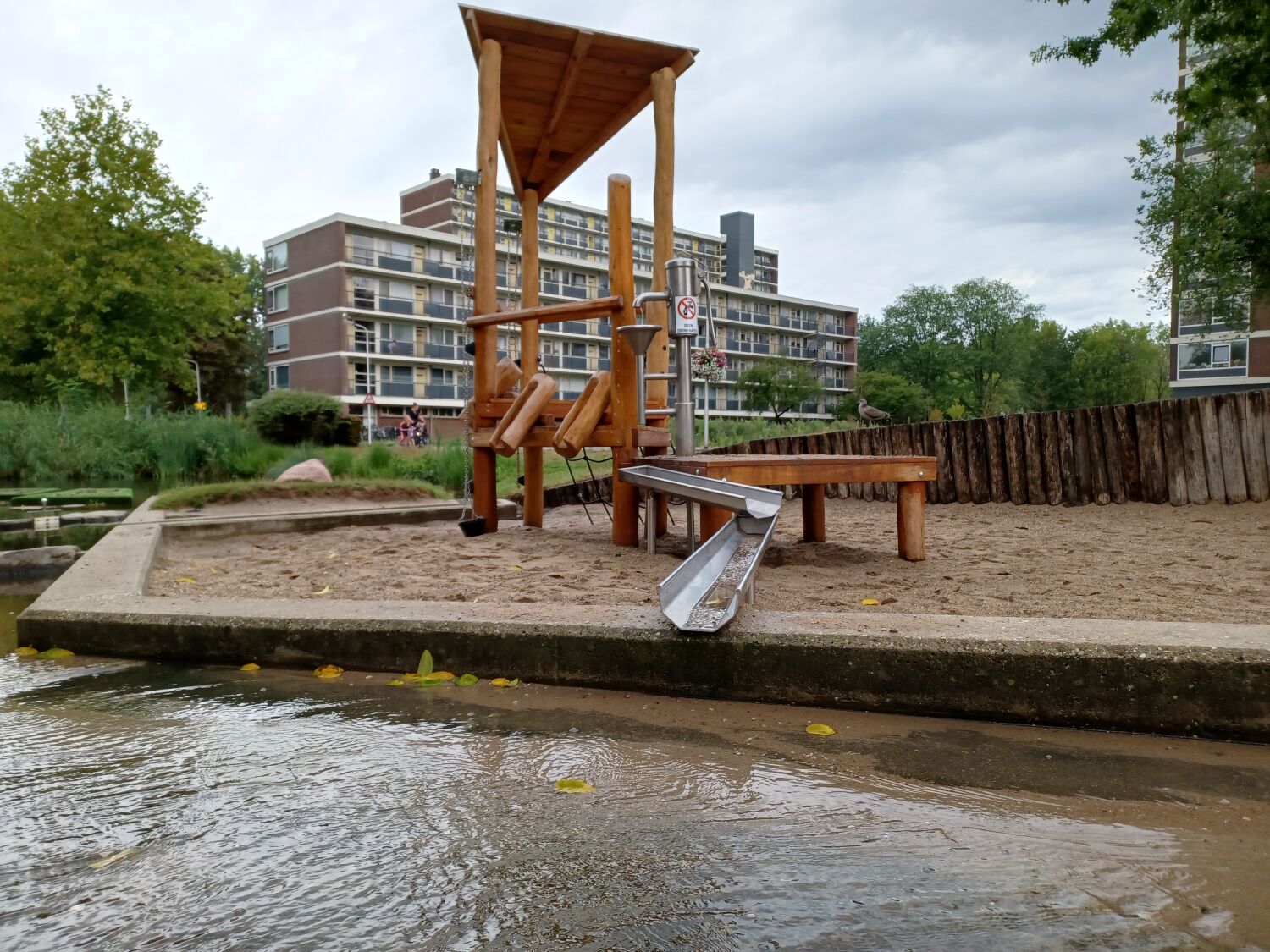 Aangezien er al een soort vijver met beekje aanwezig was op de groenstrook, hebben we voor een van de speeltoestellen voor een zand-/waterspeelcombinatie gekozen. Het water uit de vijver kan worden opgepompt en vervolgens spoelt dit water weg in de beek. De ondergrond van het speeltoestel is van zand, zodat er tegelijk ook met zandtakels gespeeld kan worden.