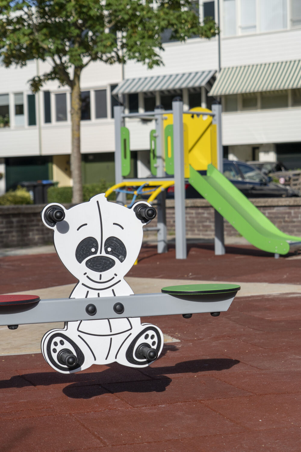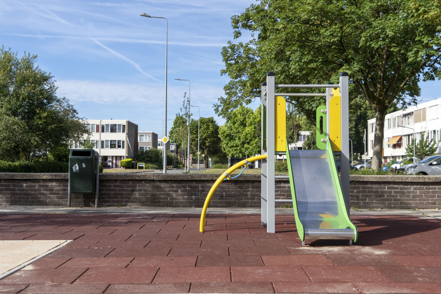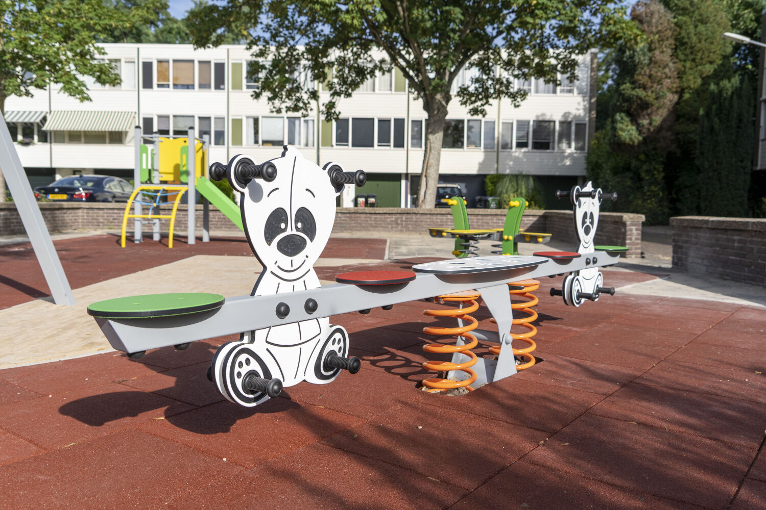 De speeltoestellen die we uiteindelijk neer hebben gezet zijn Dubbele schommel Vink, Glijbaantoren Joy, Veertoestel Ryan en Veertoestel Panda. Ideaal voor een wat jongere doelgroep, met toch voldoende speeluitdaging. Aangezien de speeltoestellen allemaal van gecoat metaal zijn gemaakt, hebben we met veel leuke kleurtjes kunnen werken. Dit maakt de speeltuin extra aantrekkelijk.