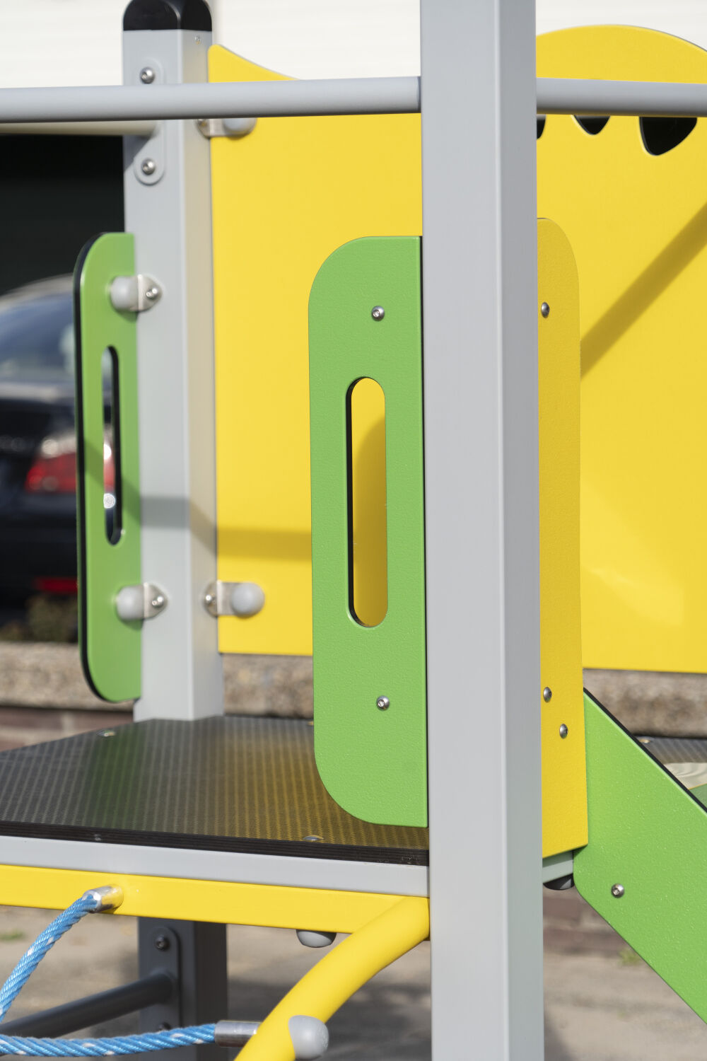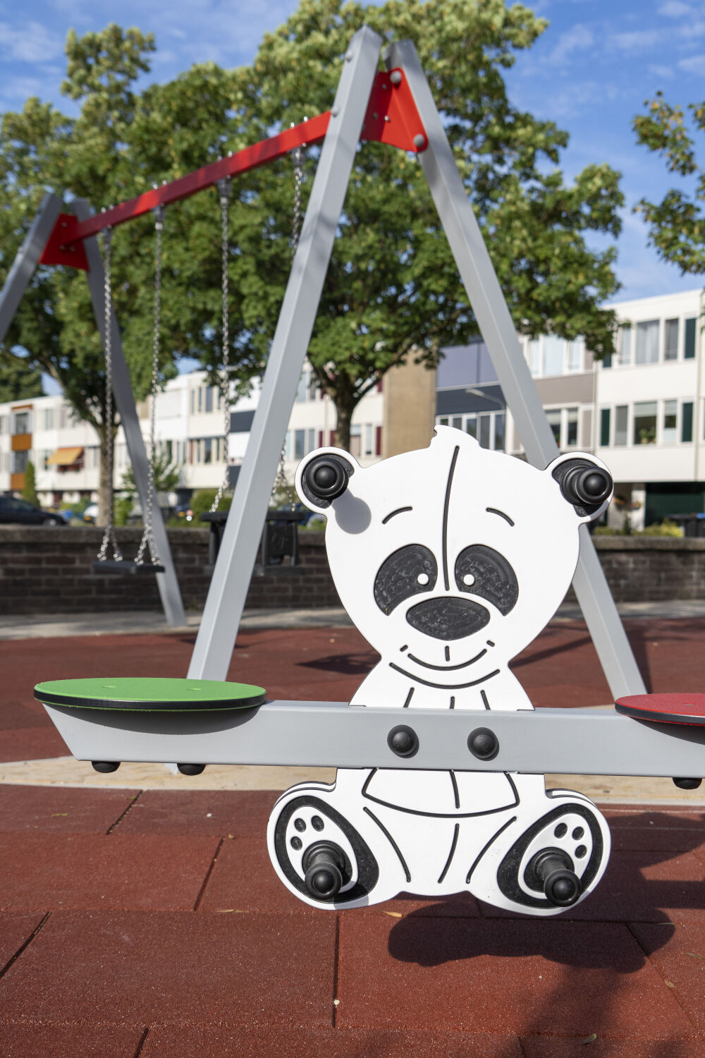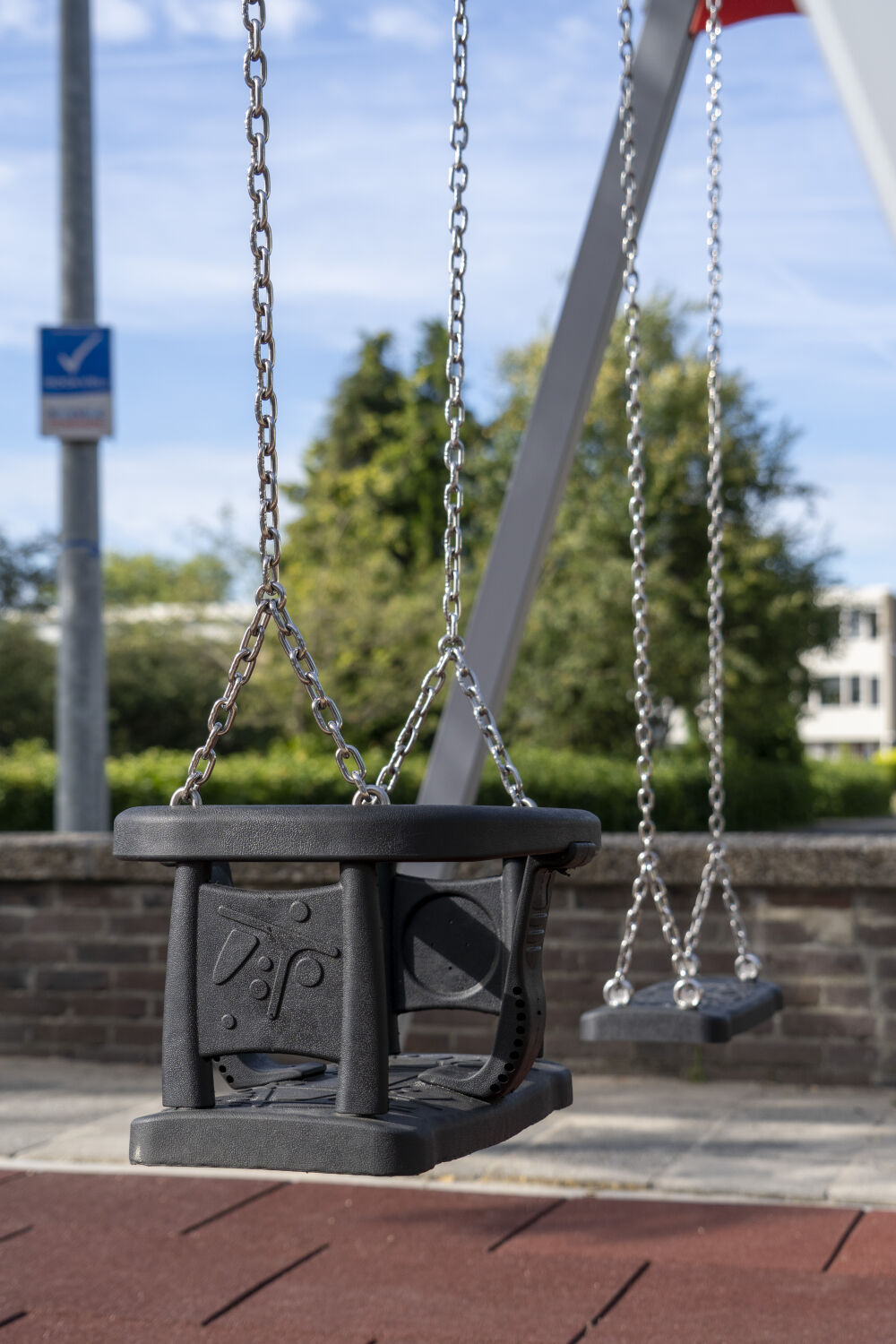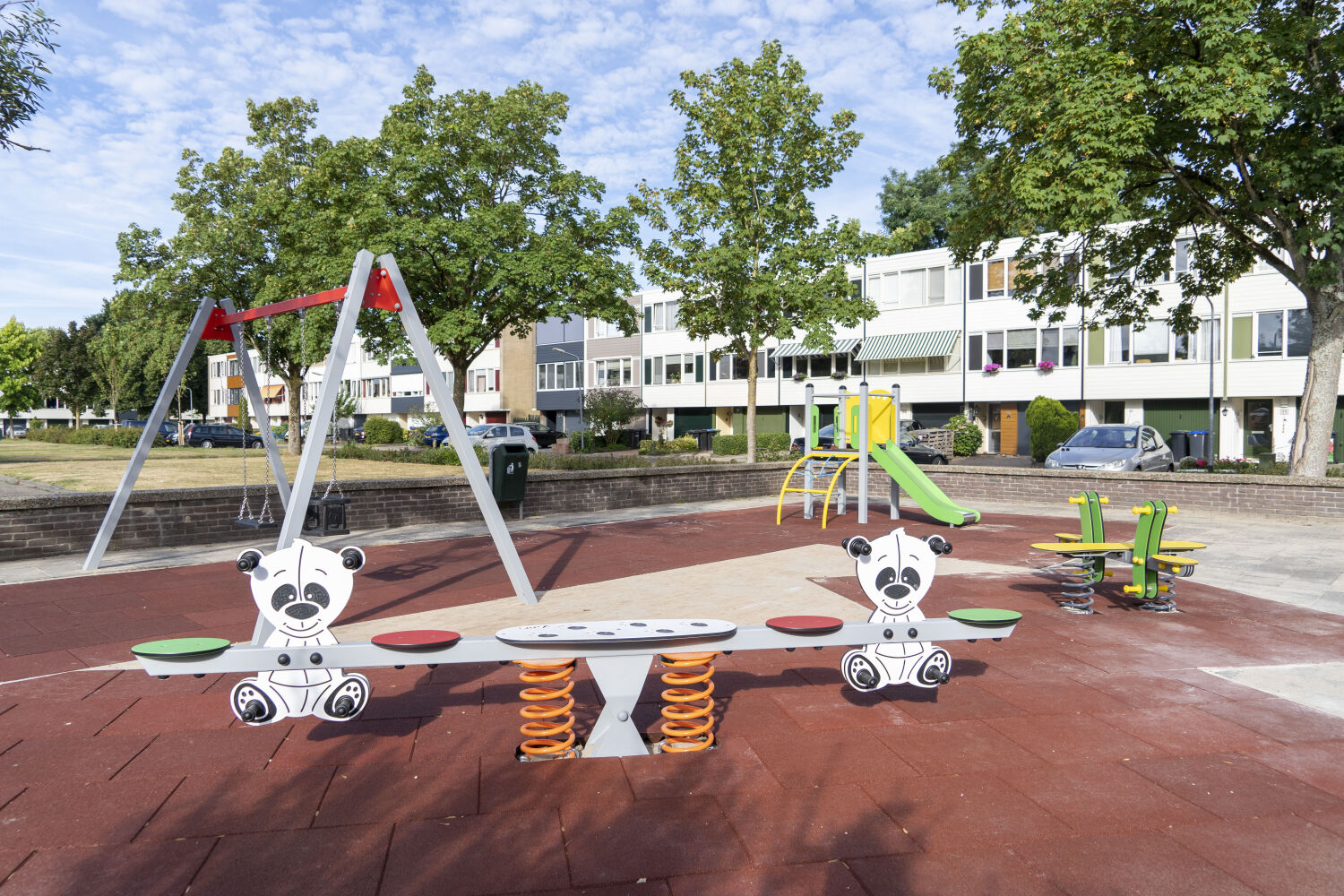 De speeltoestellen die we uiteindelijk neer hebben gezet zijn Dubbele schommel Vink, Glijbaantoren Joy, Veertoestel Ryan en Veertoestel Panda. Ideaal voor een wat jongere doelgroep, met toch voldoende speeluitdaging. Aangezien de speeltoestellen allemaal van gecoat metaal zijn gemaakt, hebben we met veel leuke kleurtjes kunnen werken. Dit maakt de speeltuin extra aantrekkelijk.
