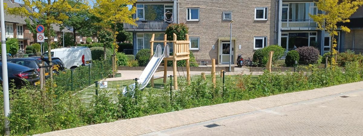 Een speeltuin met beperkte ruimte wilt niet direct zeggen dat er niet veel speelwaarden aan die speelplek kan worden toegevoegd. Door creatief te denken en de juiste combinatie van speeltoestellen uit te kiezen kun je alsnog veel speelaanleidingen samenbrengen op een kleine oppervlakte. Een mooi voorbeeld hiervan is de speeltuin aan de Oosterengweg in Hilversum.