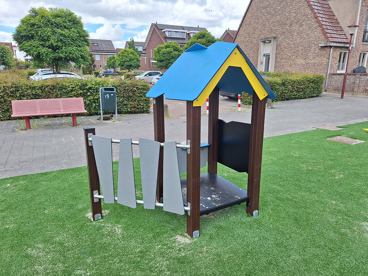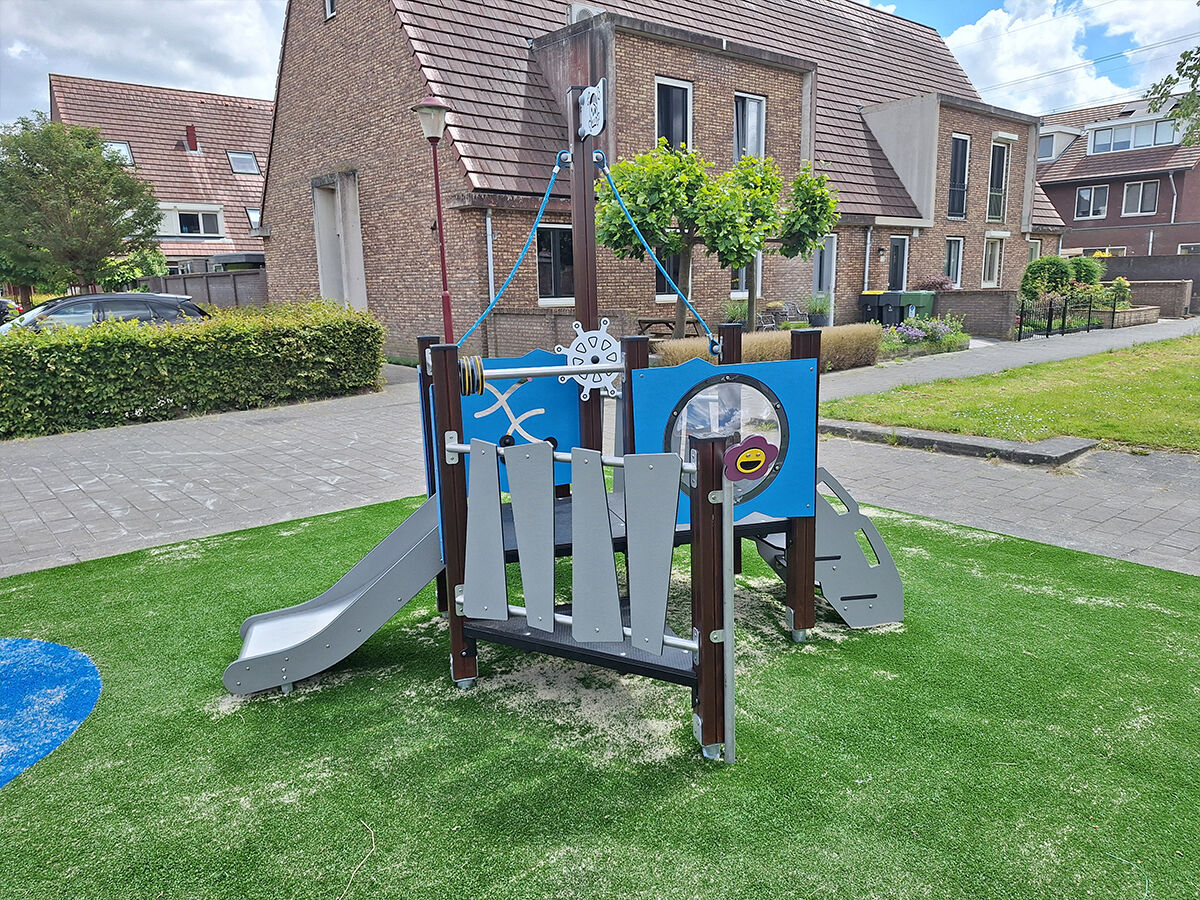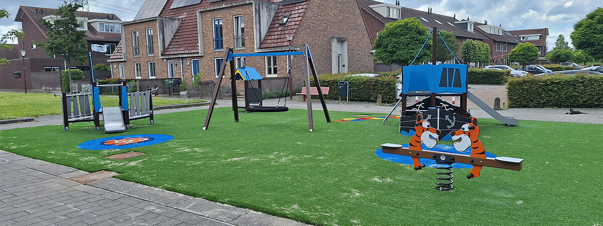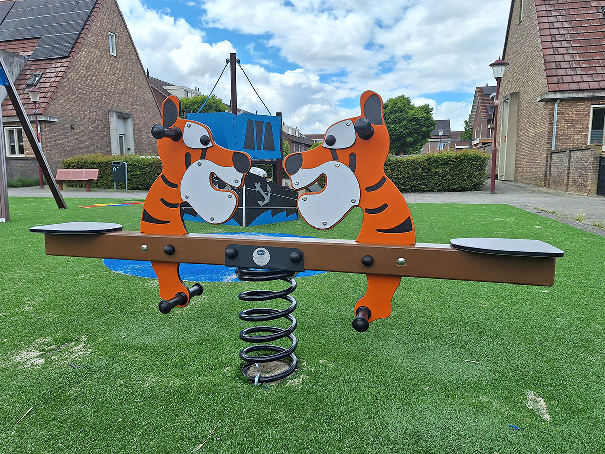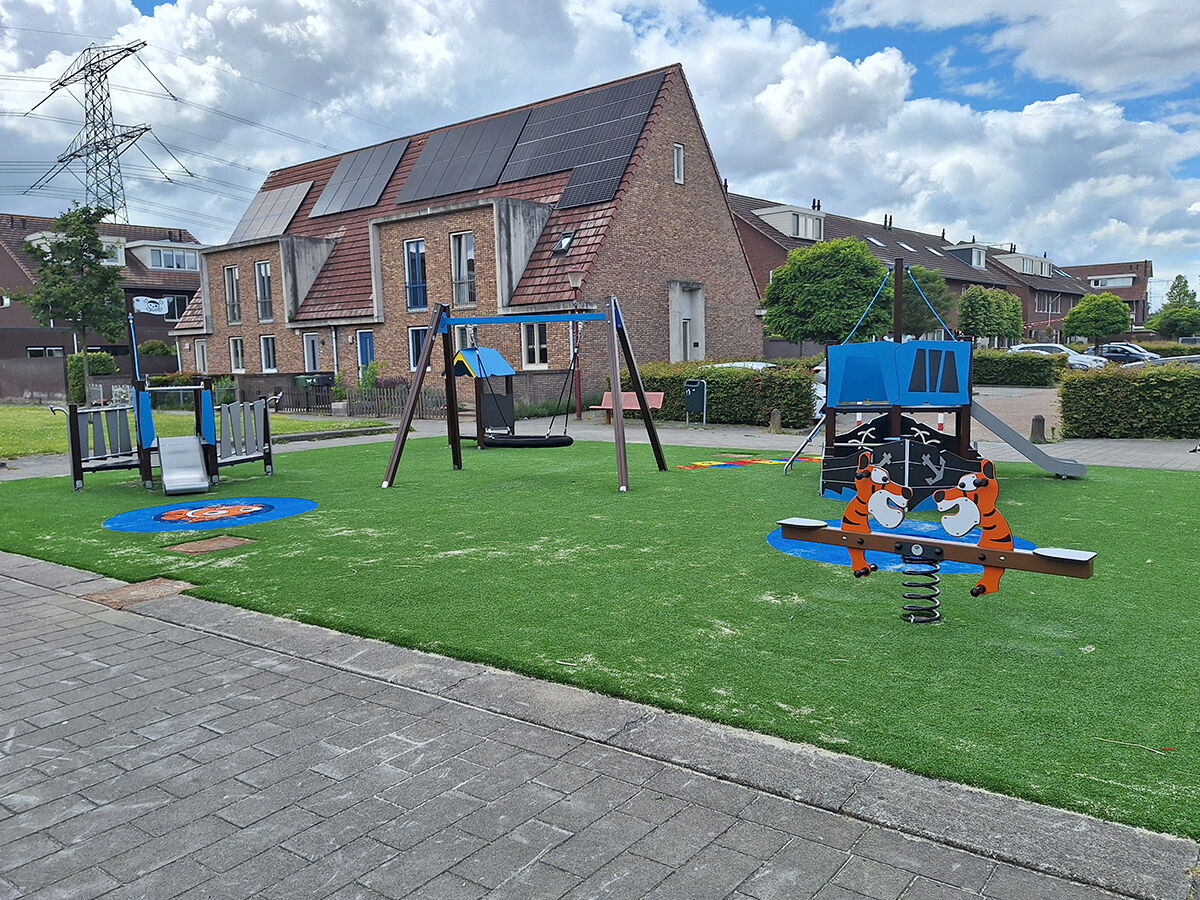 De nieuwe speelplek is voorzien van natuurlijk de gewenste schommel, daarnaast zijn Veertoestel Tijger, Speelhuisje Nova, Speelboot Baloo en Speelboot Aurora geplaatst. Een volle speelplek met veel verschillende speelwaardes!