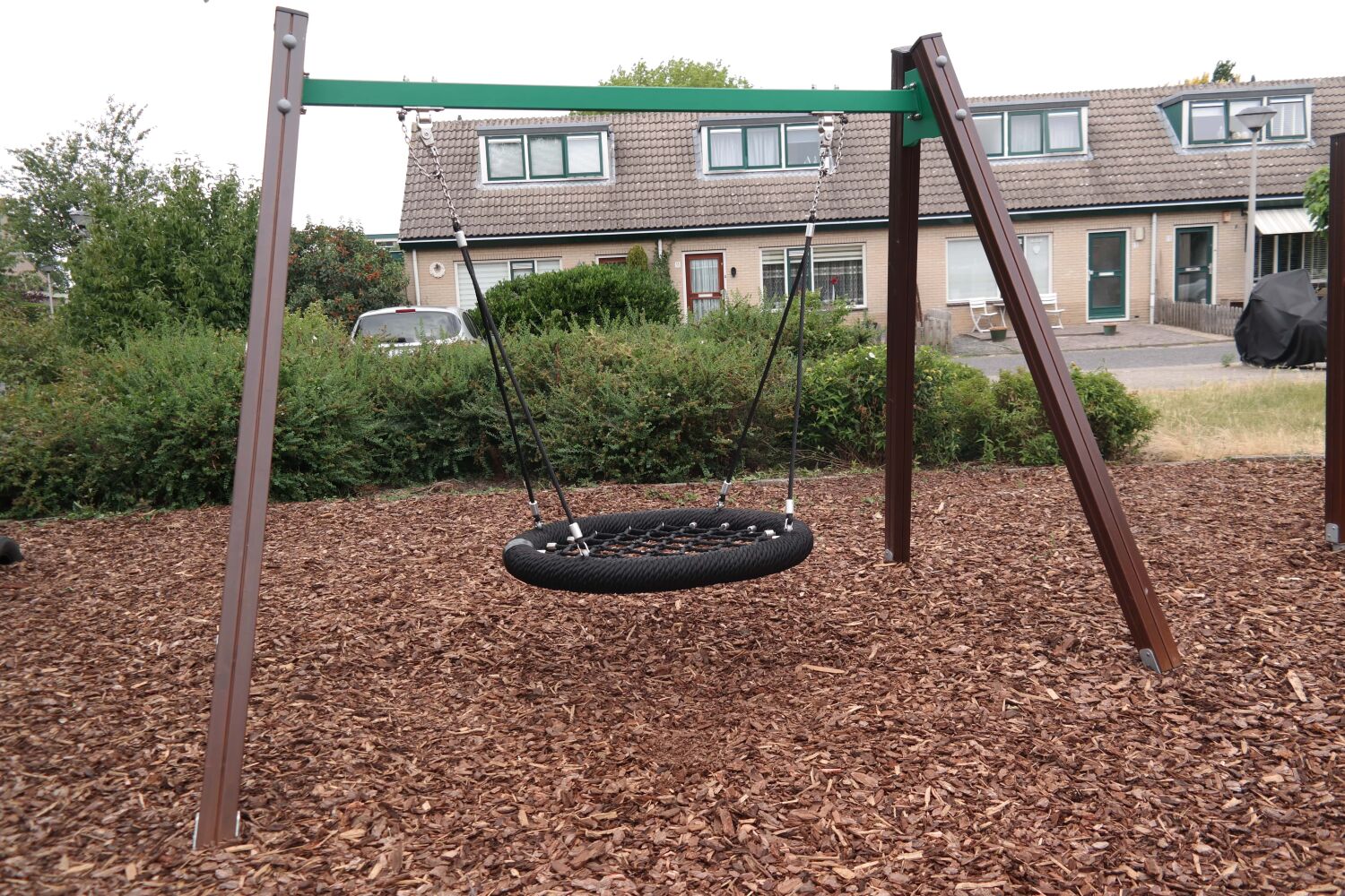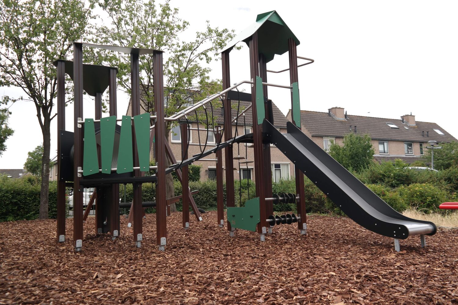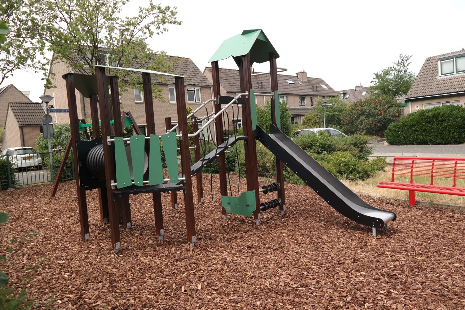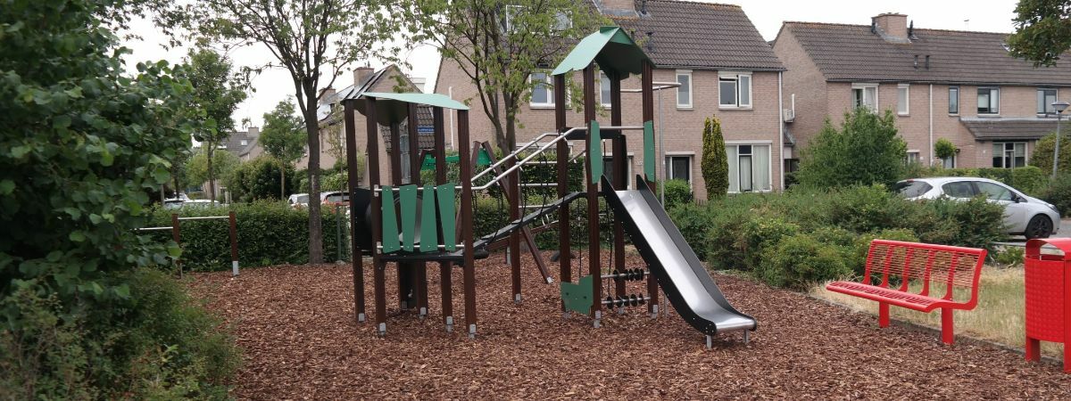 De toestellen die uiteindelijk gekozen zijn voor de speeltuin in Huizen zijn: Speelcombinatie Rosa, Vogelnestschommel specht, Rechte wip en Duikelrek Tumble. Alle speeltoestellen hebben een houtlook met groene elementen en passen op deze manier perfect bij de houtsnipper ondergrond en de bomen die in de wijk aanwezig zijn.