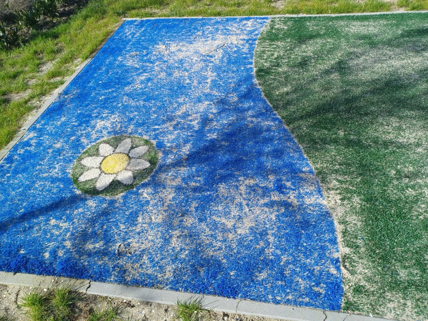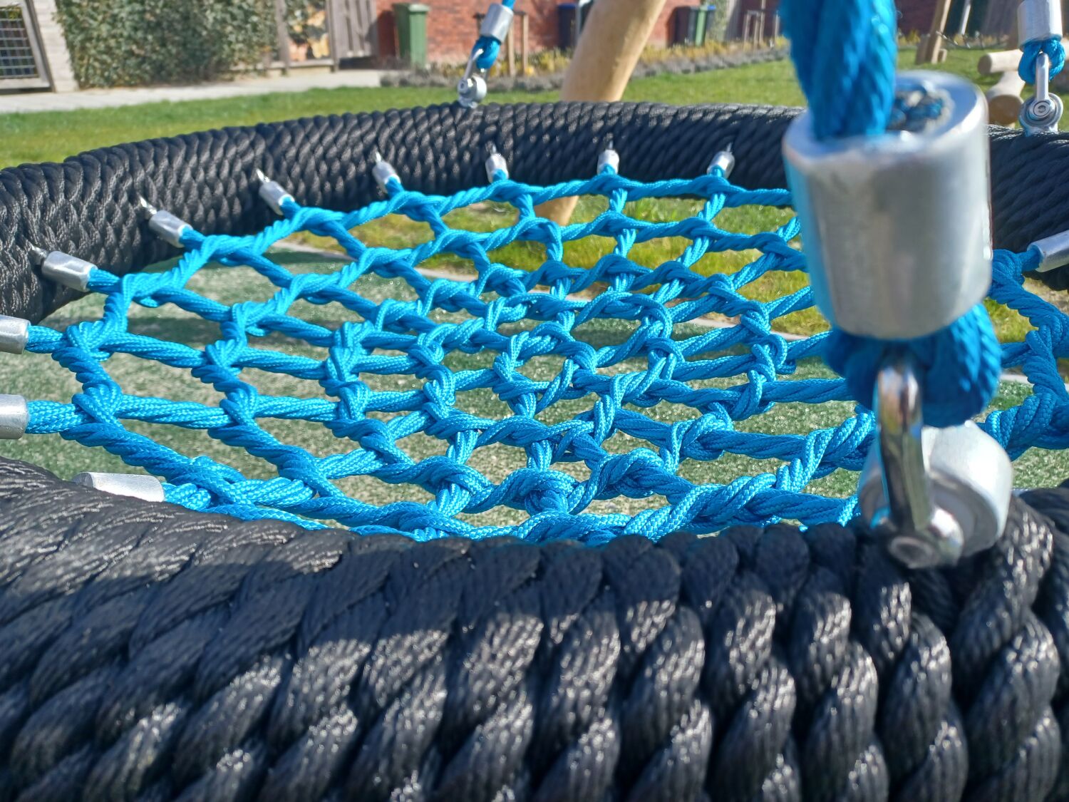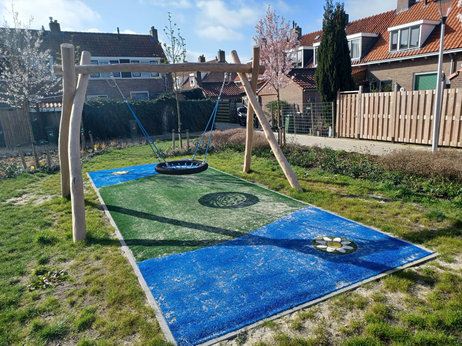 Het merendeel van de speeltuin heeft een ondergrond van gras. Voor onder de vogelnestschommel zijn wij echter voor kunstgras gegaan. Het kunstgras is deels groen en deels blauw met vrolijke Signgrass figuurtjes. De kleuren passen perfect bij de (natuurlijke) uitstraling van de wijk en de figuurtjes zorgen voor een extra sfeer.