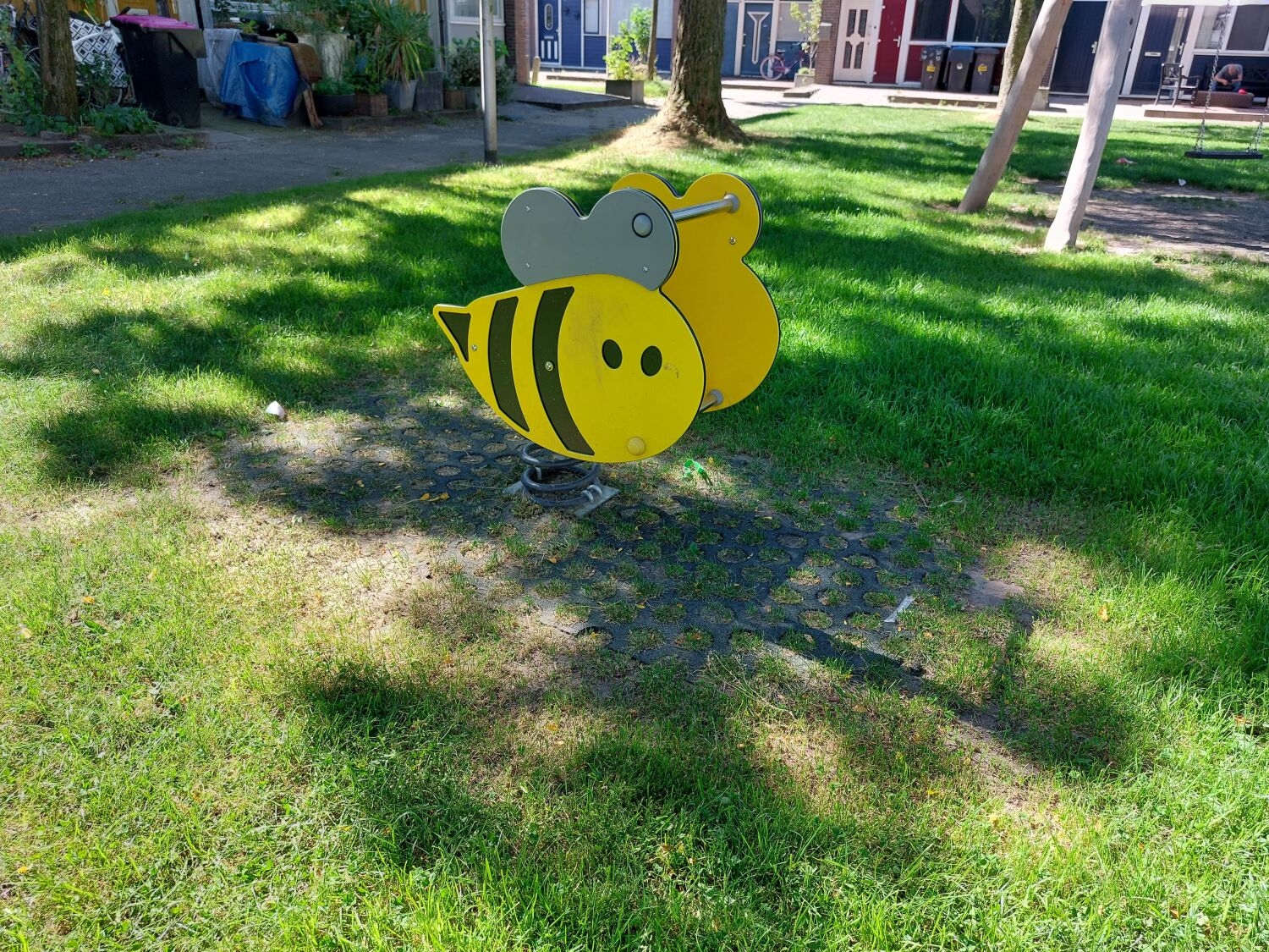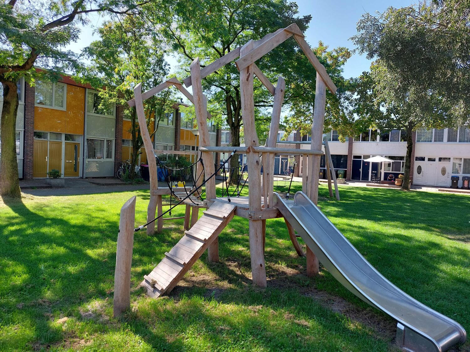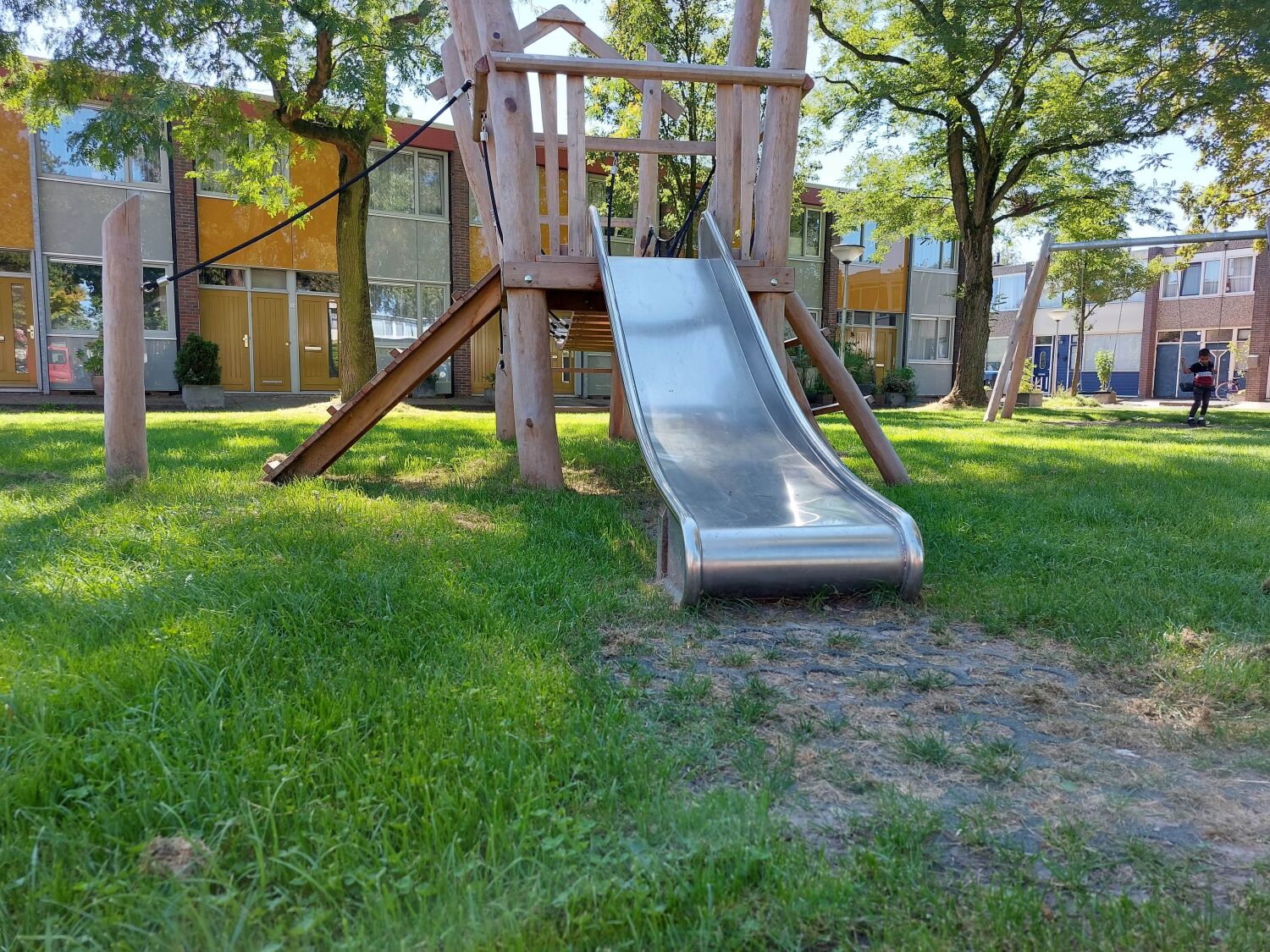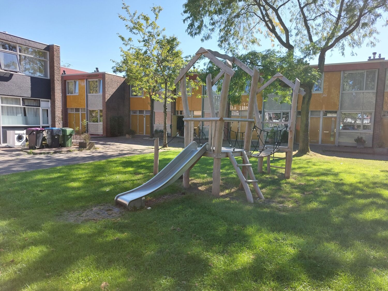 De speelplek aan de Robinsonstraat lag er wat sober bij, dat moest ook de gemeente Leeuwarden gevonden hebben. Want voor de vernieuwing van de speelplek klopte ze bij ons aan. De aanvraag van de gemeente: Metalen speeltoesellen die geschikt zijn voor een leeftijd van 5 - 10 jaar. Waarbij we graag een veertoestel voor meerdere kinderen zouden zien, een dubbele schommel met boxzitje en een toestel met een glijbaan.