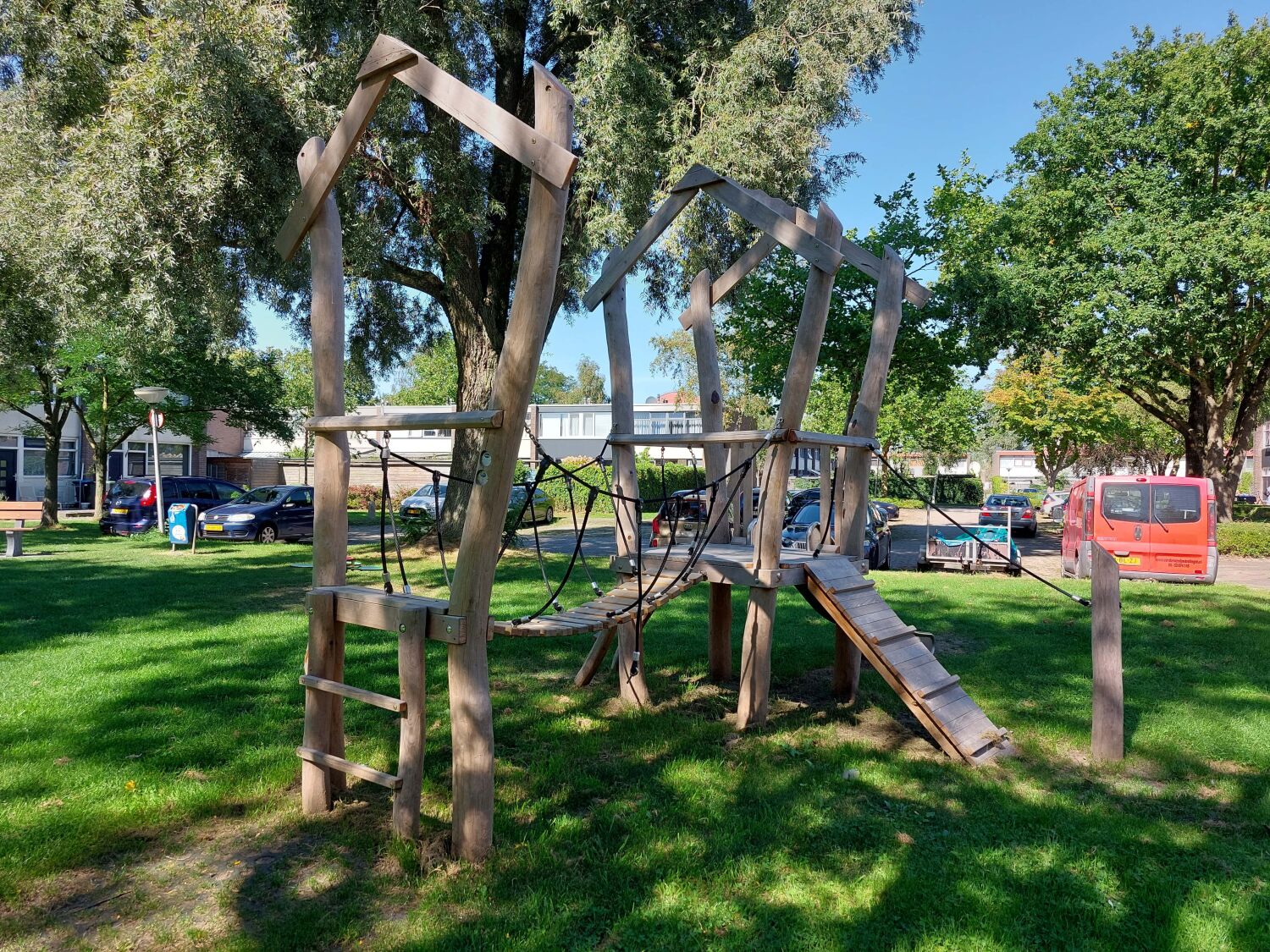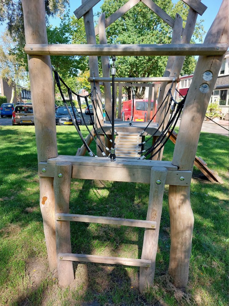 Uitvoering: Robinia speeltoestellen. De gemeente heeft uiteindelijk toch gekozen voor speeltoestellen met een natuurlijkere uitstraling en dus voor Robinia omdat deze beter passen in de omgeving waar ze komen te staan. De wensen betreft de speeltoestellen hebben wij kunnen vertalen naar Veertoestel Bij, Veertoestel Aardbei, een dubbele schommel en Speelcombinatie Jolly. Een mooi gevulde speeltuin met veel verschillende speelwaarden is het resultaat.