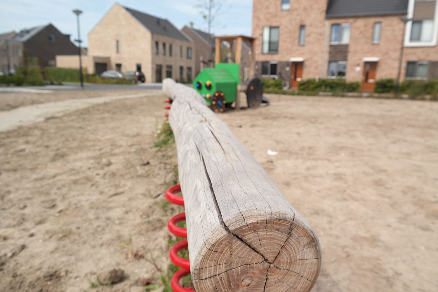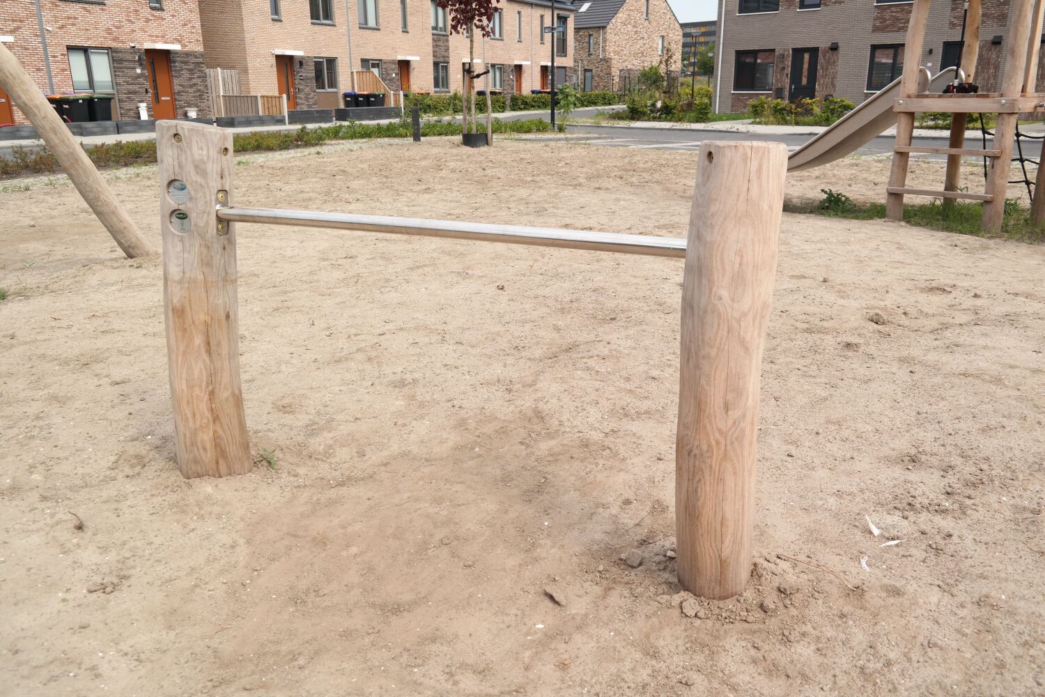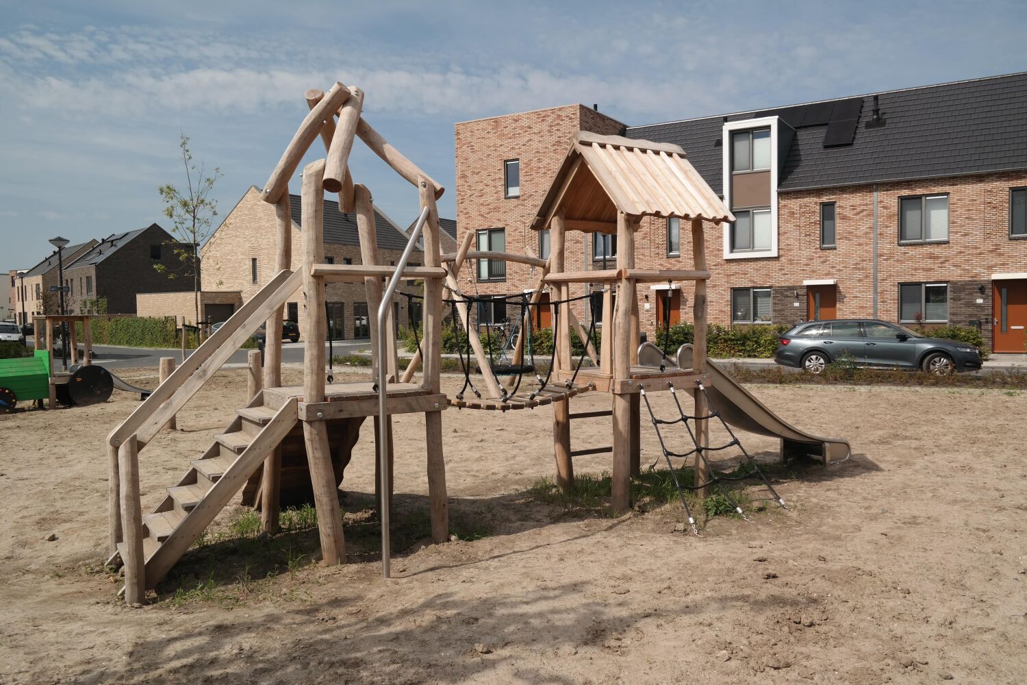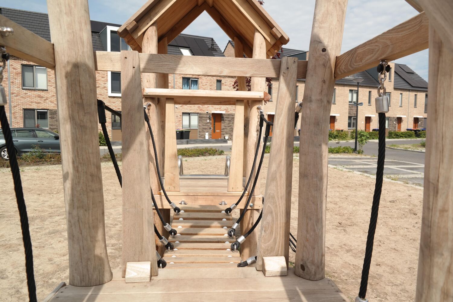Aangezien de beschikbare ruimte voor de speelplek vrij ruim was, konden wij heel wat speeltoestellen kwijt in ons ontwerp. We hebben ervoor gekozen om alle speeltoestellen van Robinia hout te maken. De natuurlijke uitstraling van deze houtsoort past namelijk het beste bij de uitstraling van de nieuwe woonwijk. Zeker op een ondergrond van valzand zorgt dit voor een mooi plaatje.