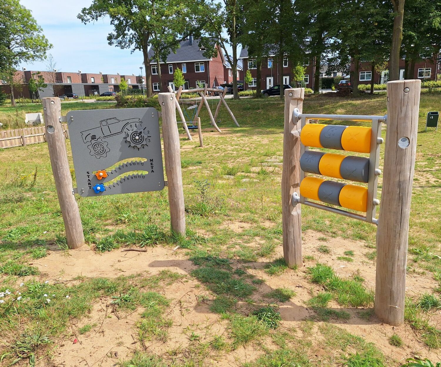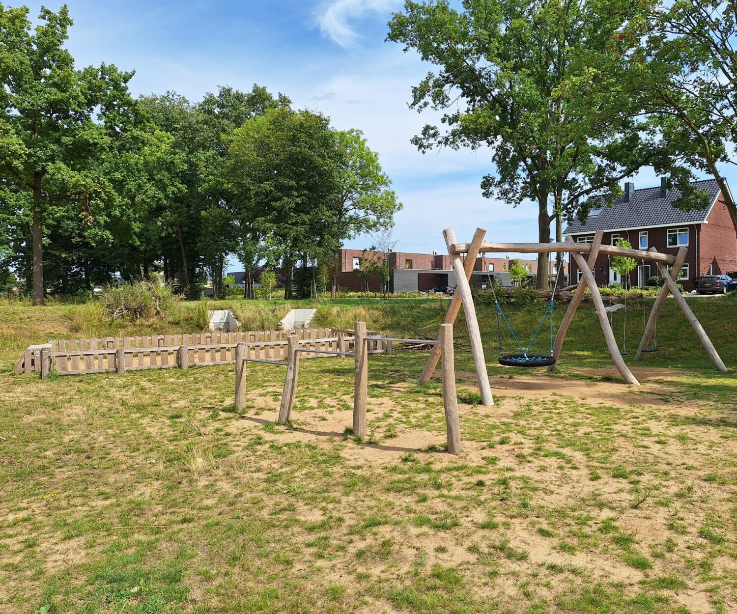 Voor de toestellen kozen we robuust Robinia-hout van Nederlandse bodem: sterk, duurzaam en met een natuurlijke uitstraling. Het speelontwerp is gevarieerd en uitdagend: van een pannakooi tot speelaanleidingen buiten de wadi, zodat ook sporters en kinderen met verschillende speelniveaus volop aan hun trekken komen.
