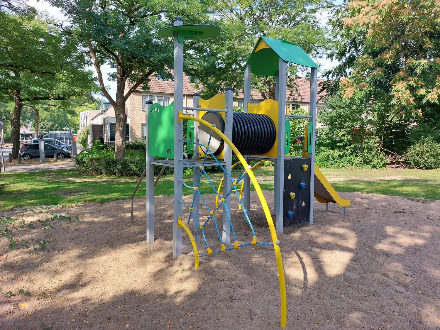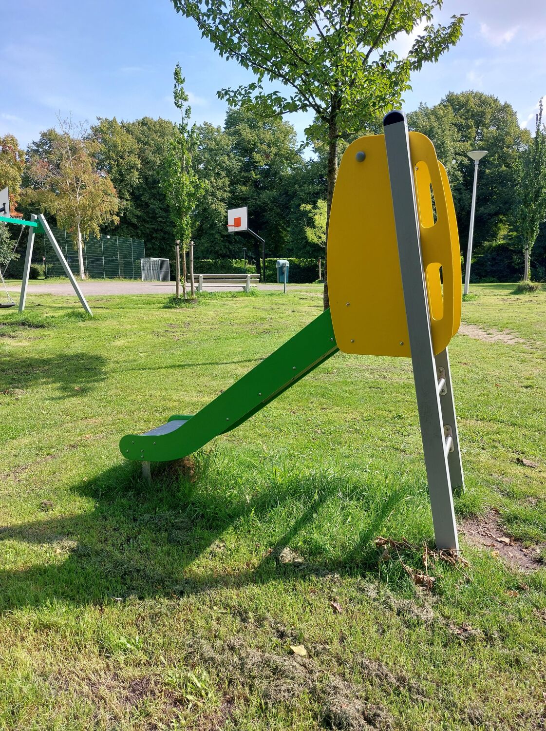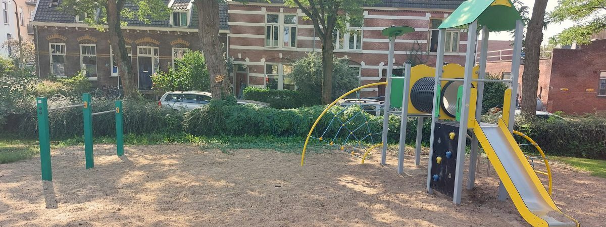 Bij het kiezen van de speeltoestellen is er ook rekeningen gehouden met de kleurrijke uitstraling. Zo zijn er twee hoofdkleuren gekozen voor de speeltoestellen: geel en groen. Deze zie je dan ook terug in elk toestel, waardoor de gehele speeltuin één mooi geheel wordt. De speeltuin is voorzien van een grote speelcombinatie, diverse schommels, een wip, een duikelrek en een vrijstaande glijbaan.