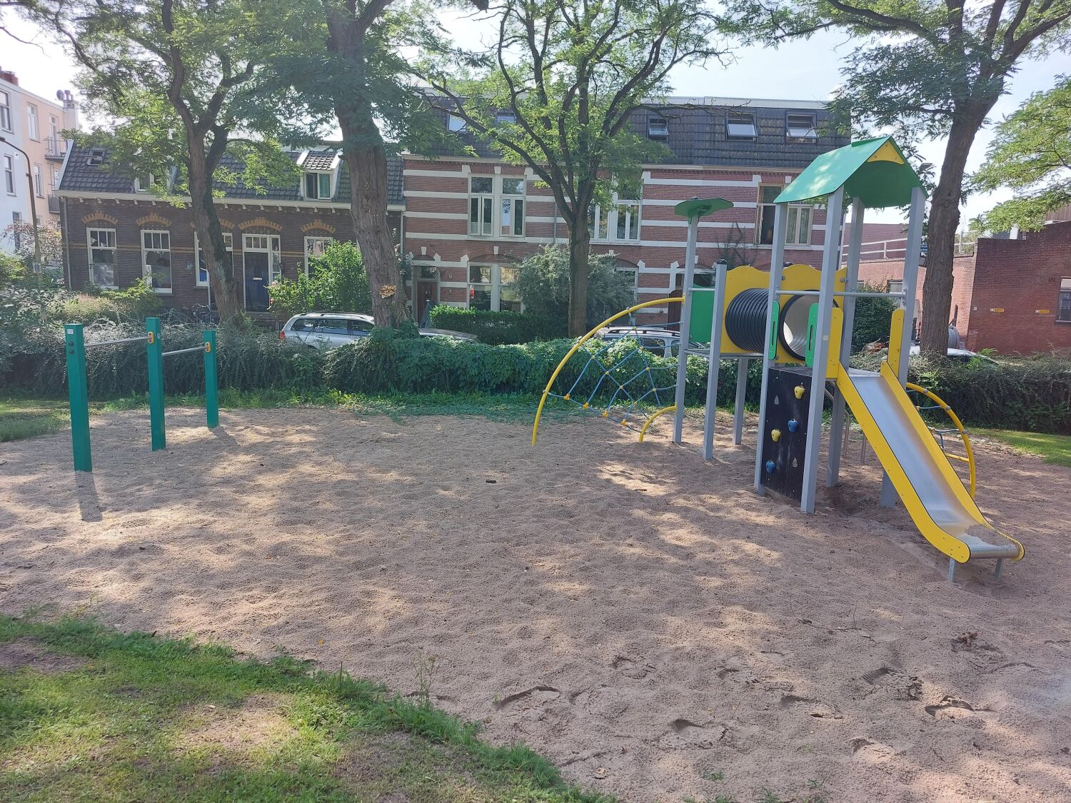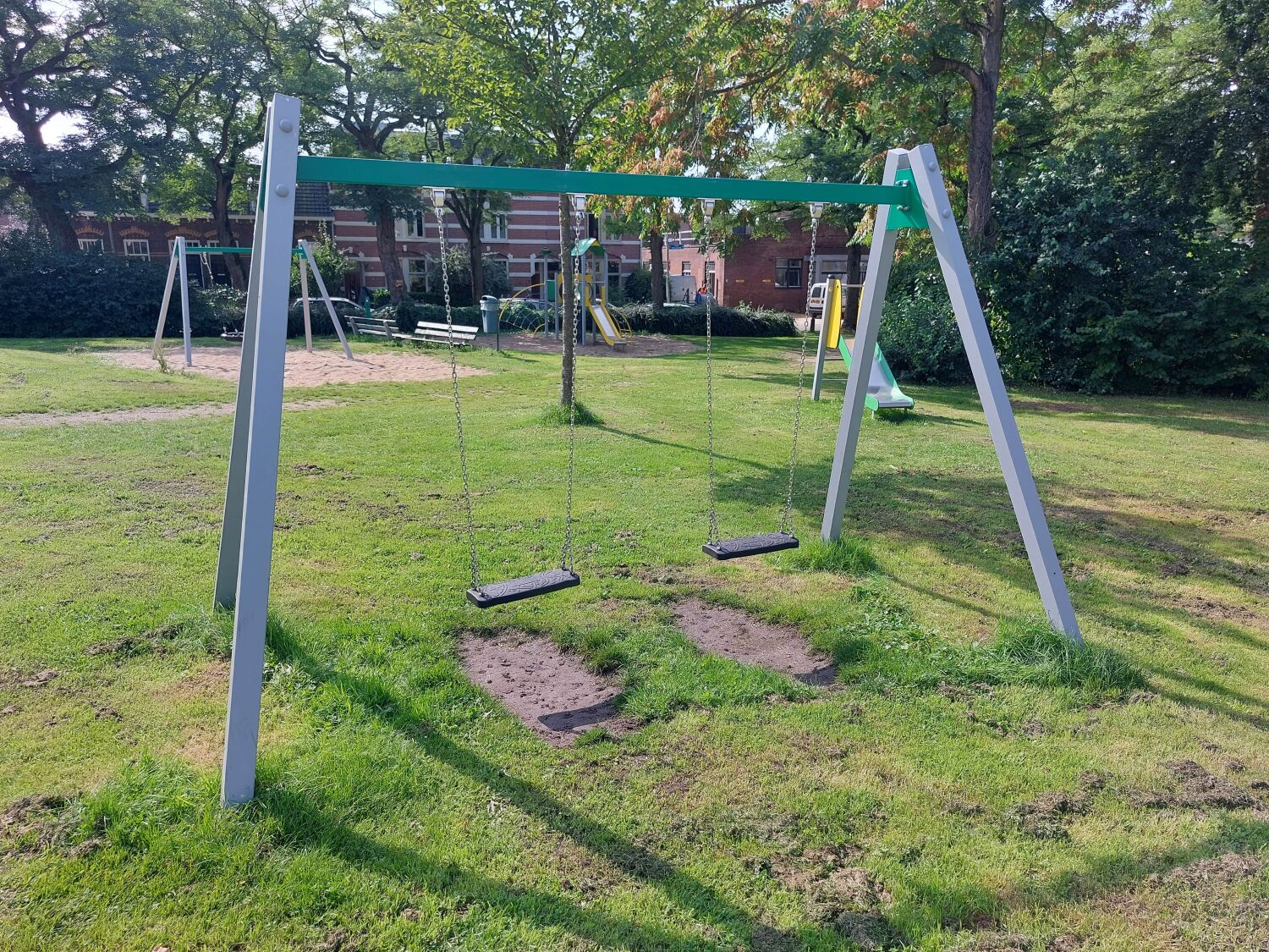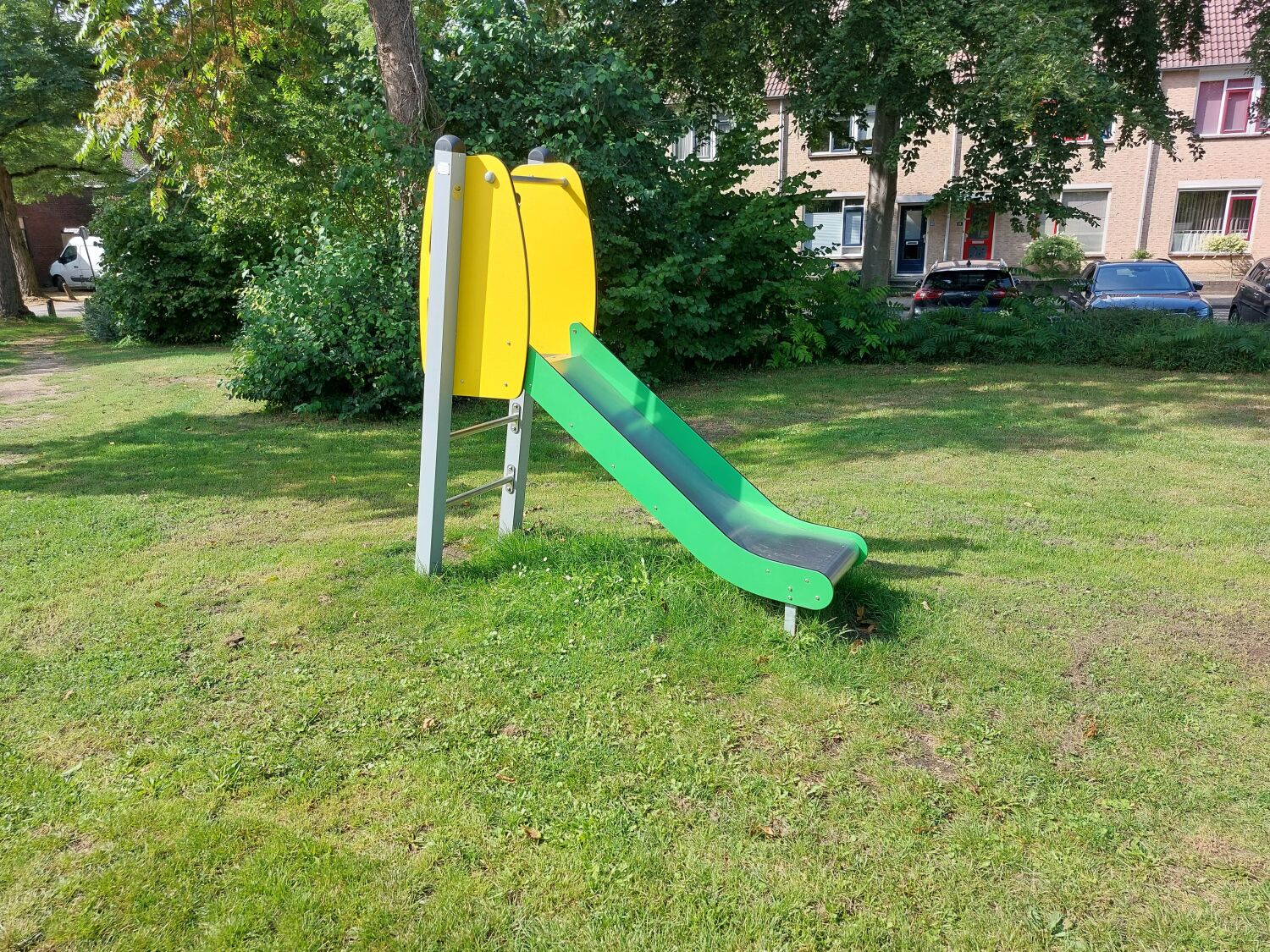 Bij het kiezen van de speeltoestellen is er ook rekeningen gehouden met de kleurrijke uitstraling. Zo zijn er twee hoofdkleuren gekozen voor de speeltoestellen: geel en groen. Deze zie je dan ook terug in elk toestel, waardoor de gehele speeltuin één mooi geheel wordt. De speeltuin is voorzien van een grote speelcombinatie, diverse schommels, een wip, een duikelrek en een vrijstaande glijbaan.