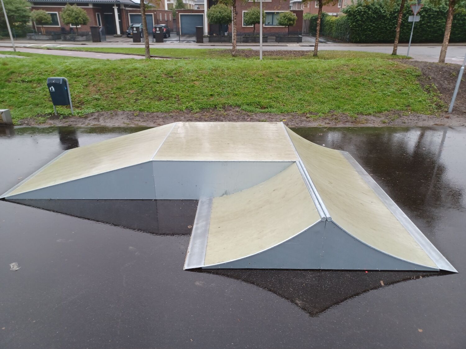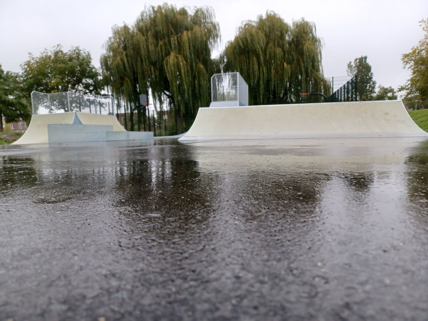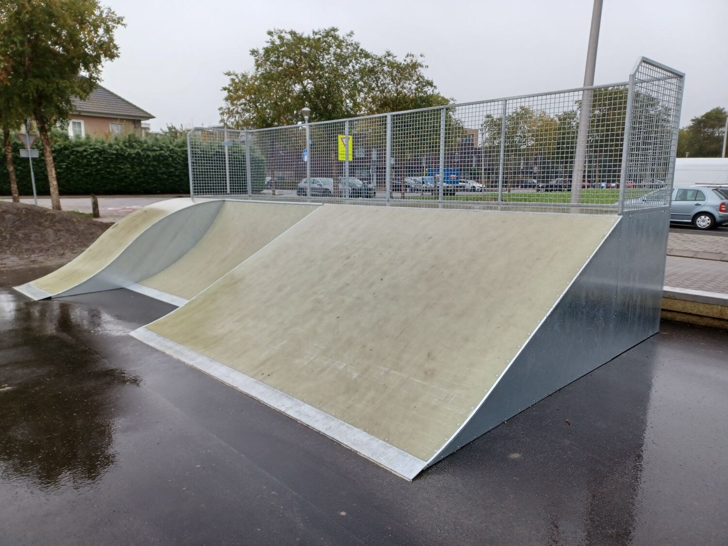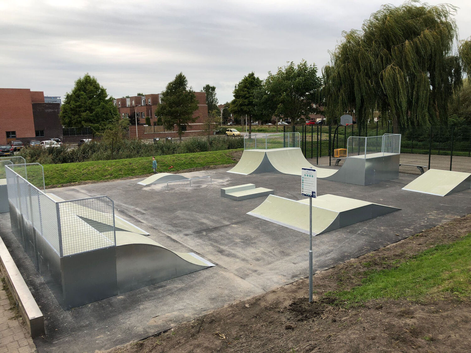 Gelukkig hebben wij dit in ons ontwerp mooi mee kunnen nemen! Er is een verscheidenheid aan skatetoestellen gemaakt en geplaatst. Deze toestellen bestaan uit een stalen frame met polyester platen. Voor het nieuwe asfalt heeft de gemeente zelf een partij ingeschakeld, die een nieuwe, strakke ondergrond verzorgde. Zo heeft het nieuwe park een strakke en stoere look gekregen.