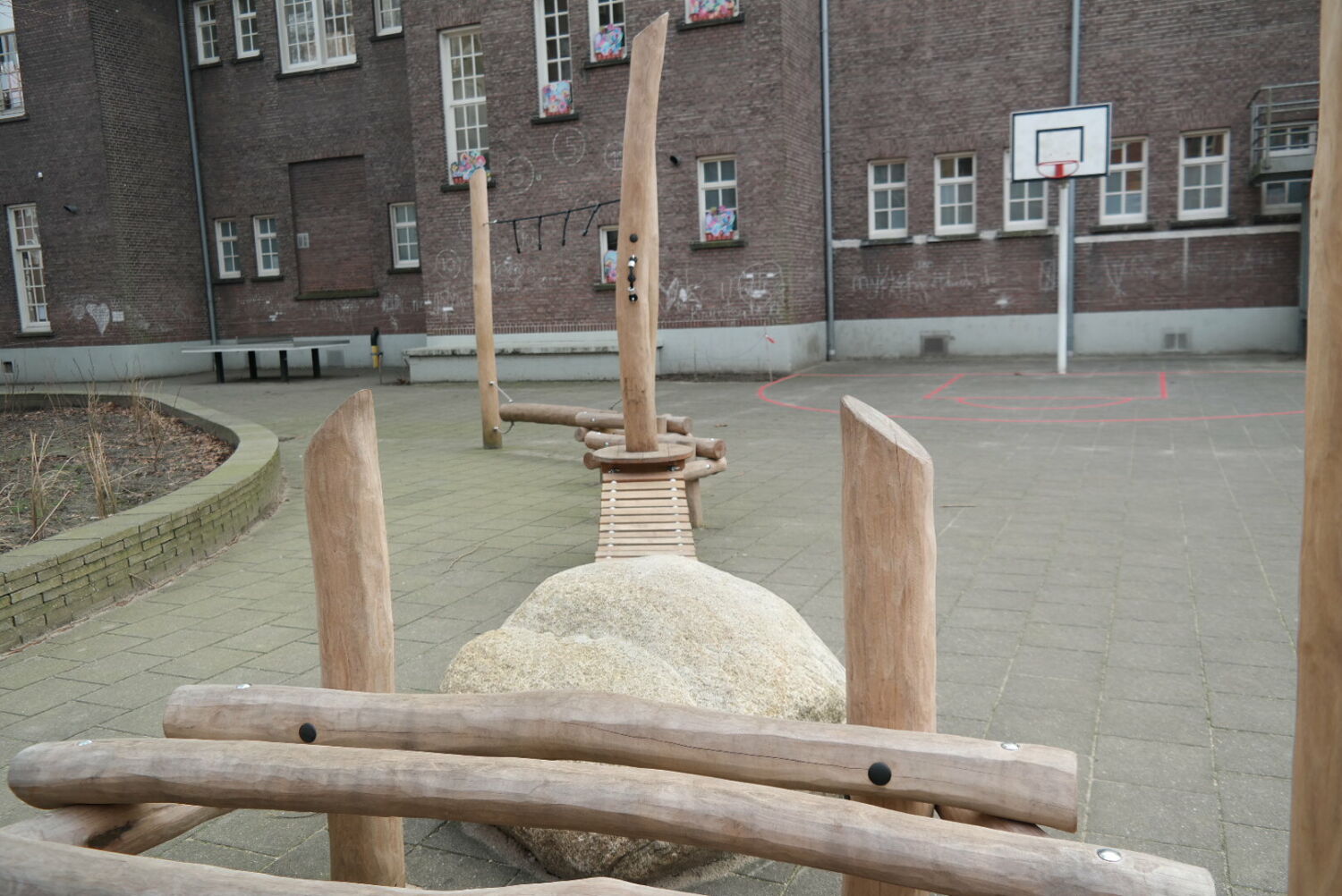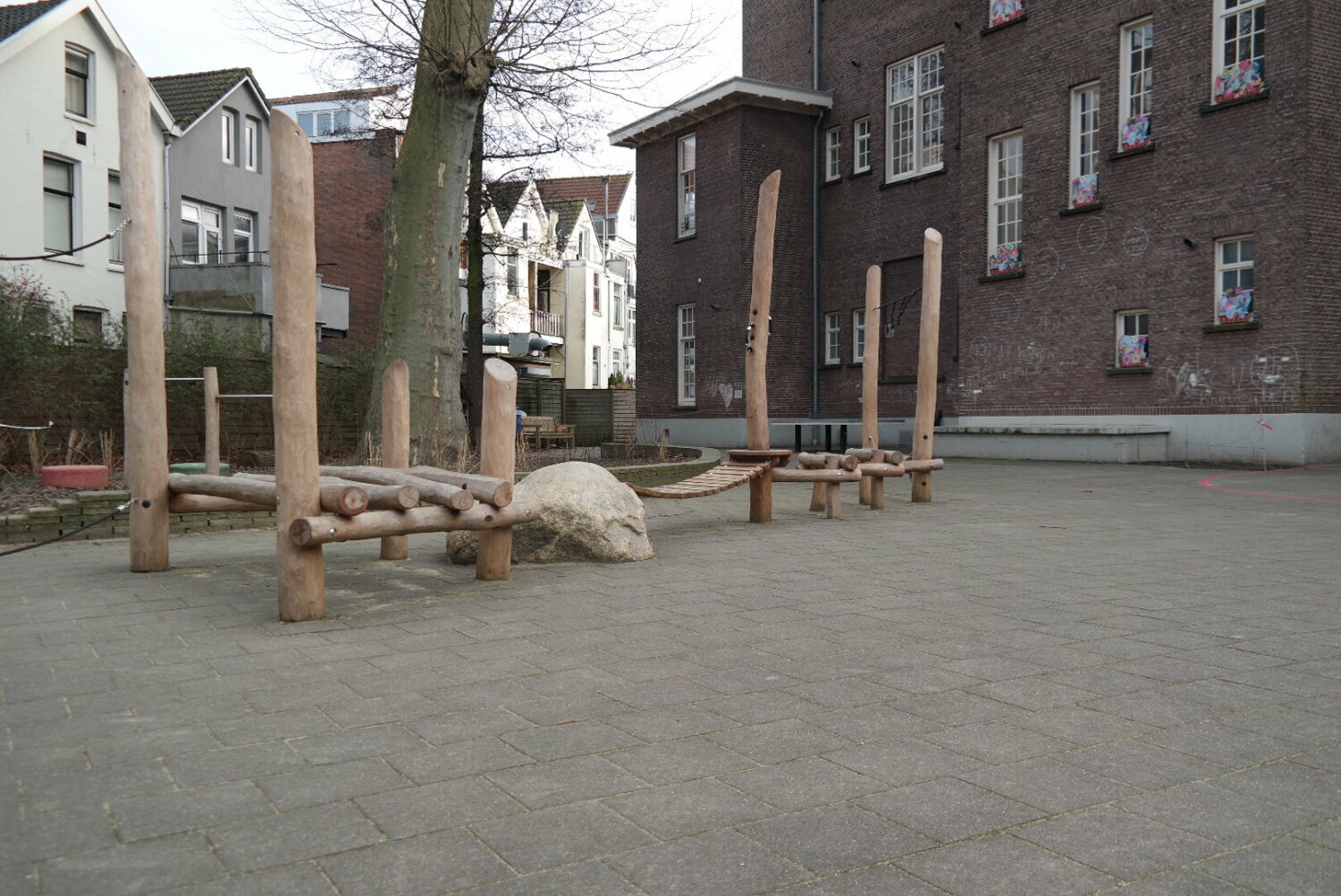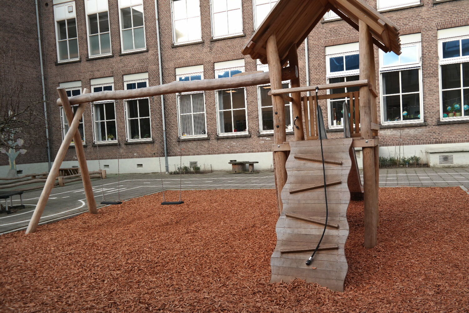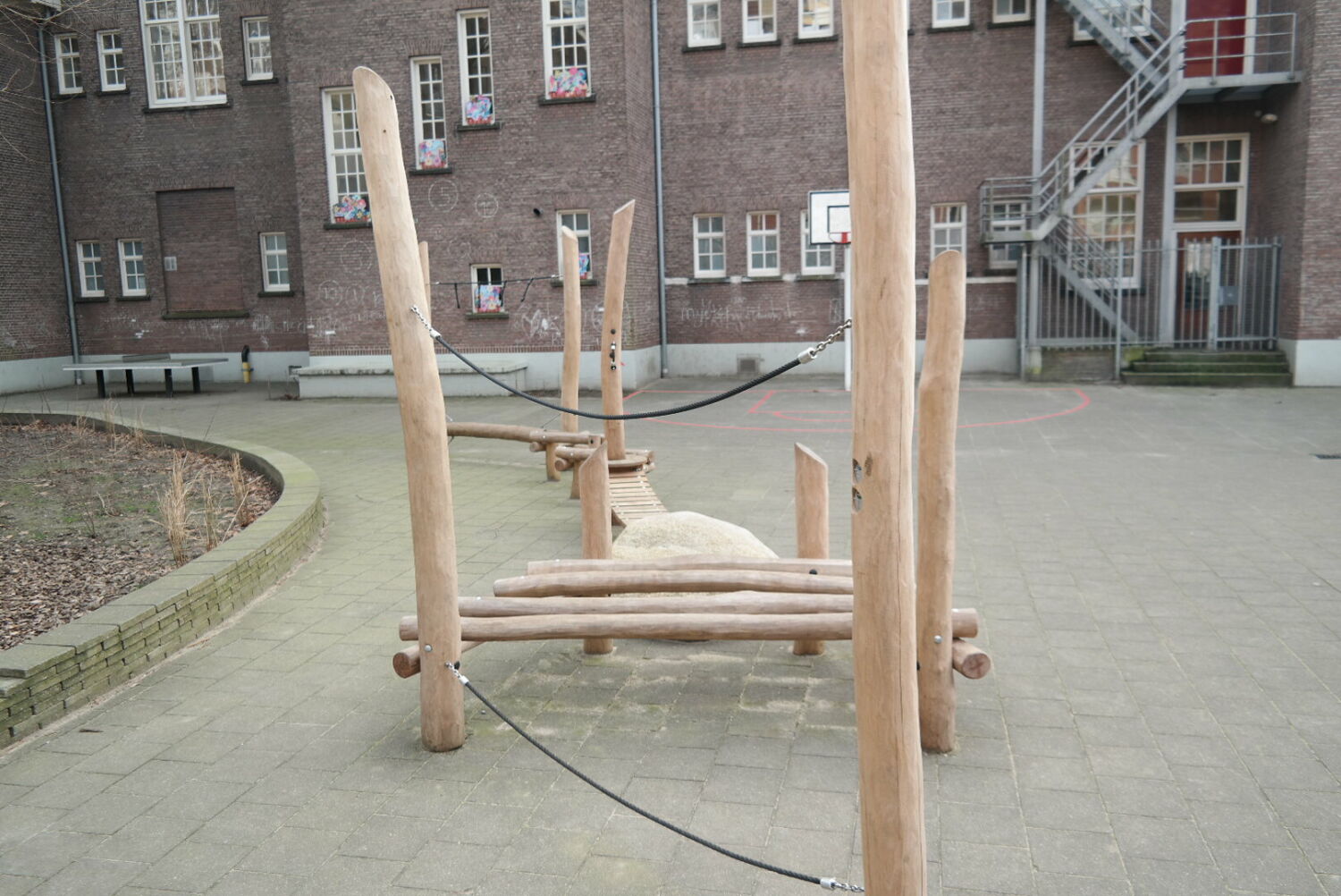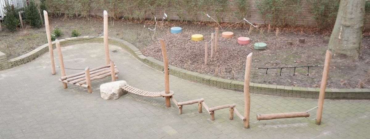 Alle speeltoestellen zijn van Robinia hout gemaakt. Dit vond de school een mooie materiaalsoort die perfect aansloot op het groenplan.