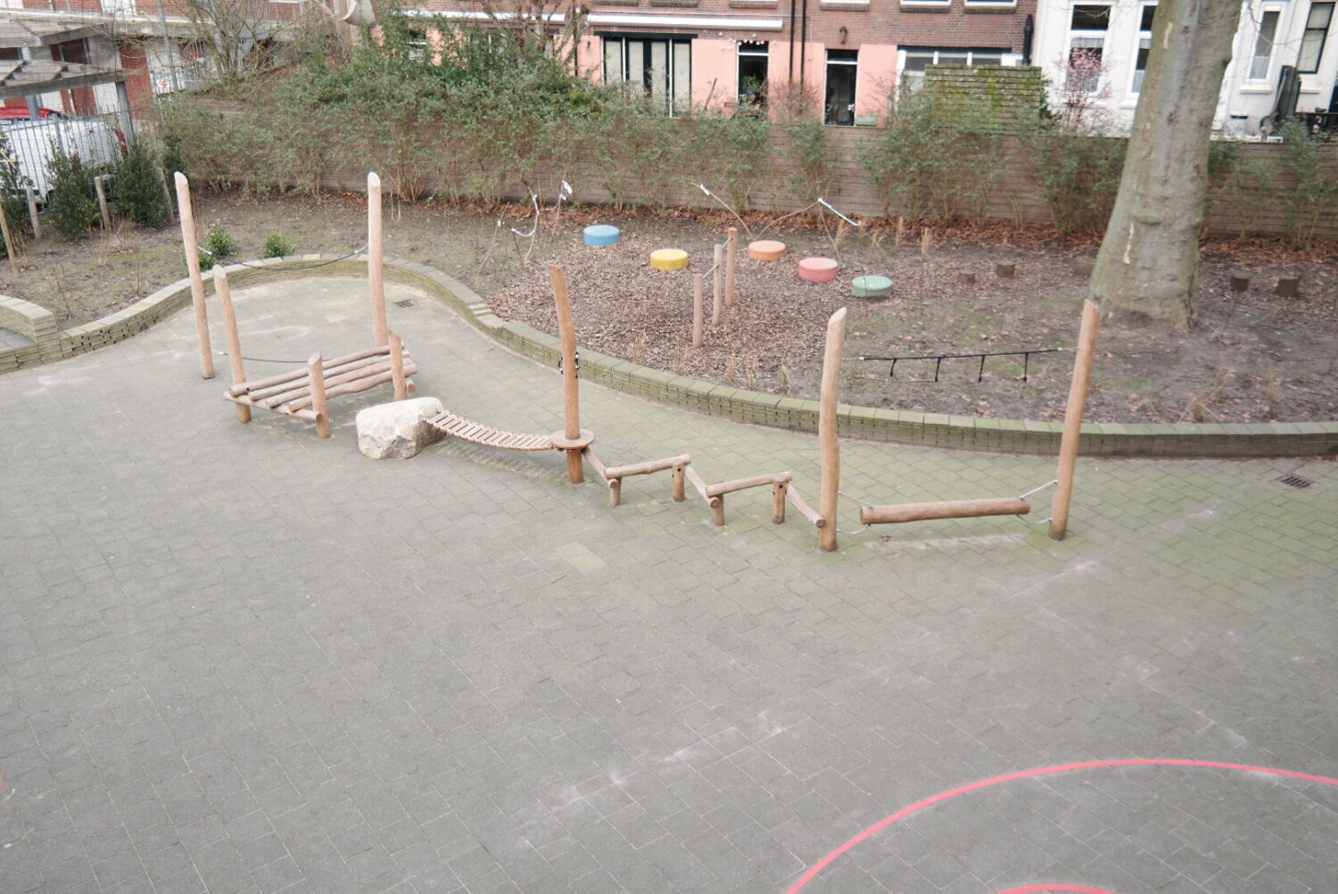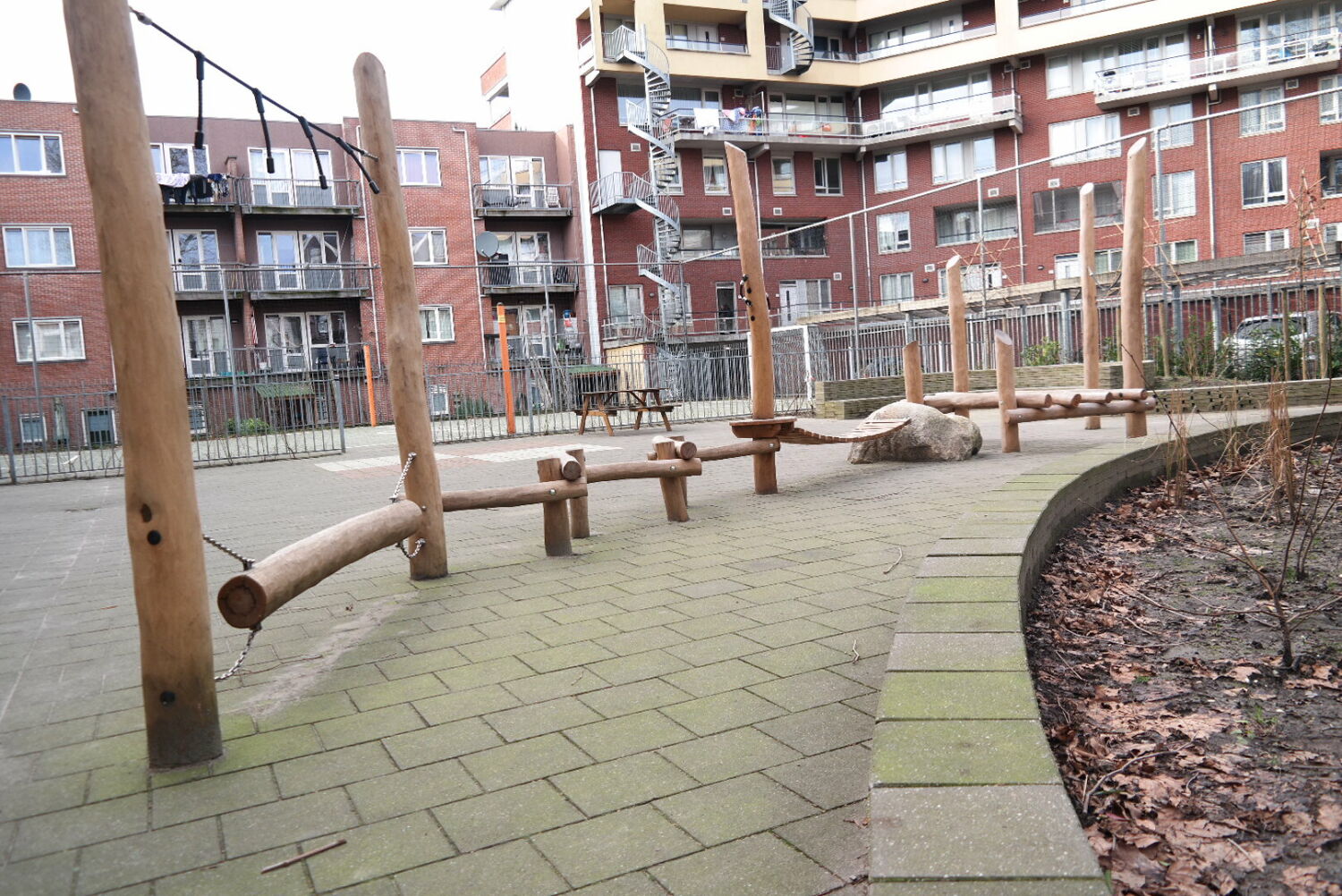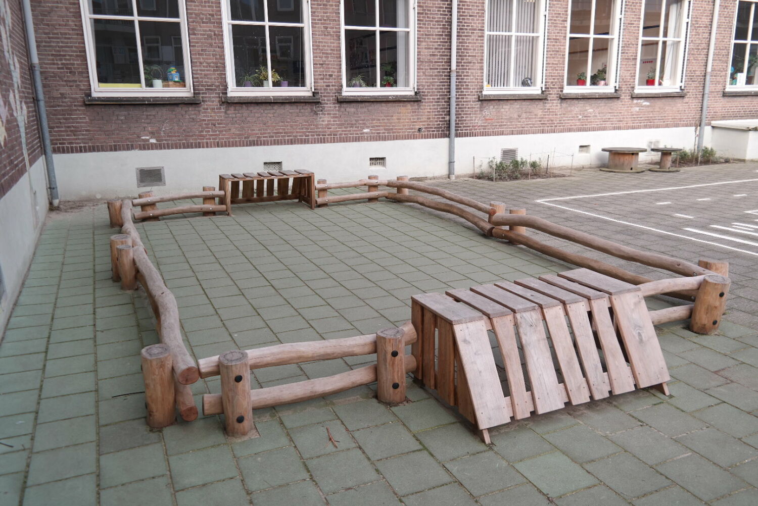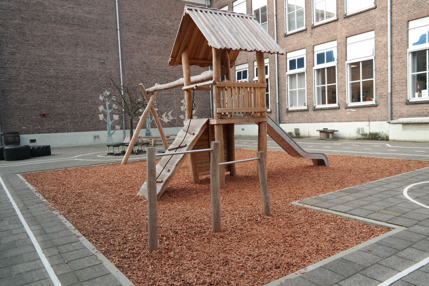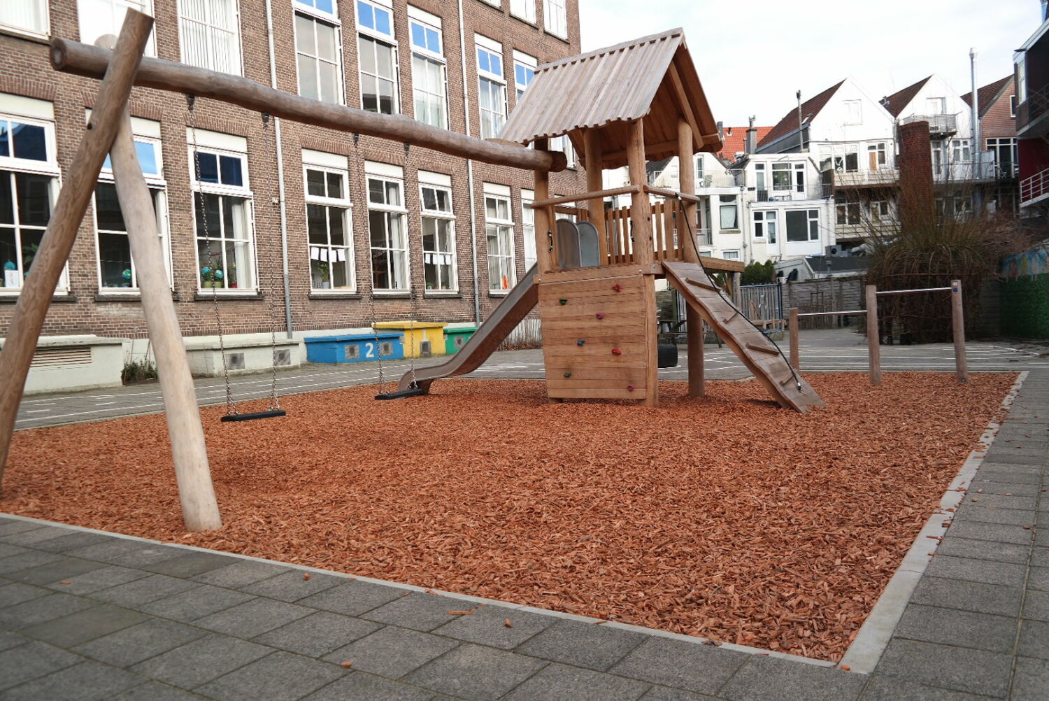 Alle speeltoestellen zijn van Robinia hout gemaakt. Dit vond de school een mooie materiaalsoort die perfect aansloot op het groenplan.