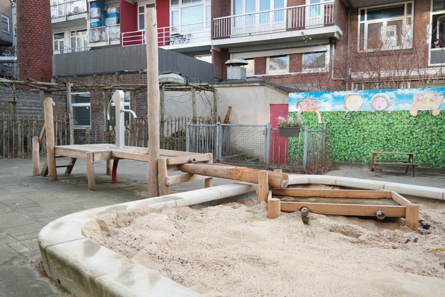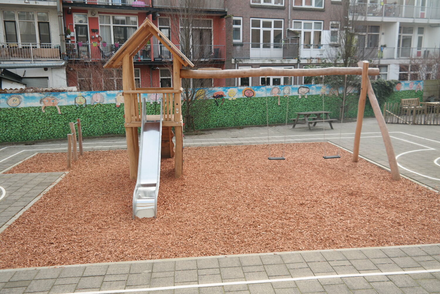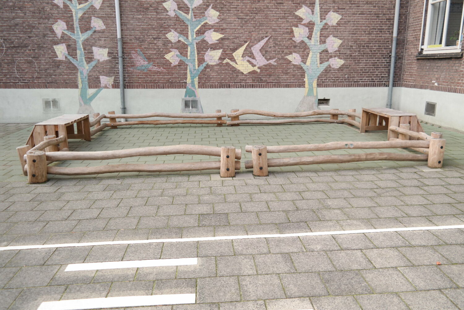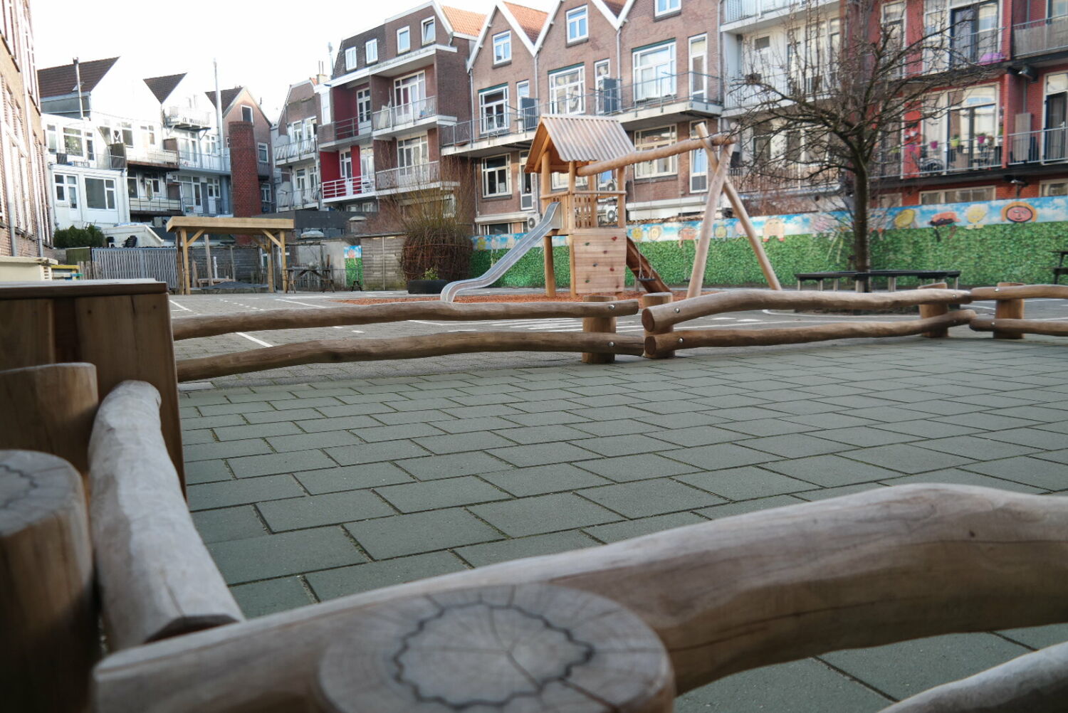 Alle speeltoestellen zijn van Robinia hout gemaakt. Dit vond de school een mooie materiaalsoort die perfect aansloot op het groenplan.