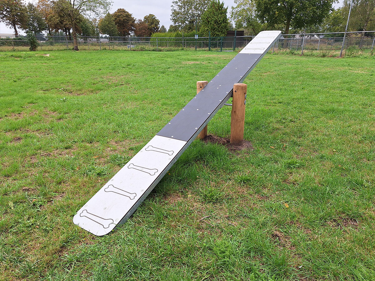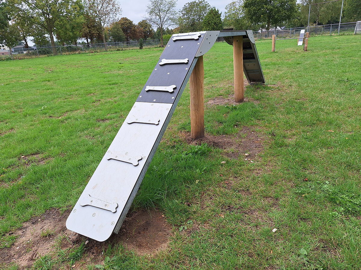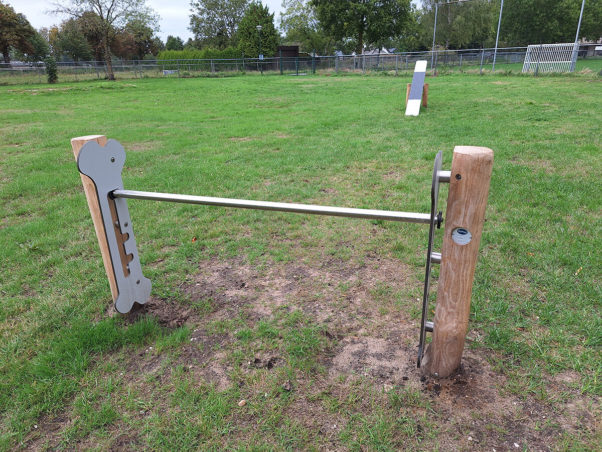 Voor dit project hebben we drie verschillende hondentoestellen geleverd. Het parcours begint met een brug waar honden vanuit de grond op kunnen rennen en vervolgens weer vanaf kunnen dalen. Daarna volgt een springtoestel met een verstelbare springstok, waardoor honden van verschillende groottes en niveaus ermee kunnen oefenen. Het parcours eindigt met een hondenwip, die zorgt voor extra uitdaging en balans. Doordat de toestellen achter elkaar zijn geplaatst, kunnen de honden eenvoudig en logisch van het ene naar het andere toestel rennen.