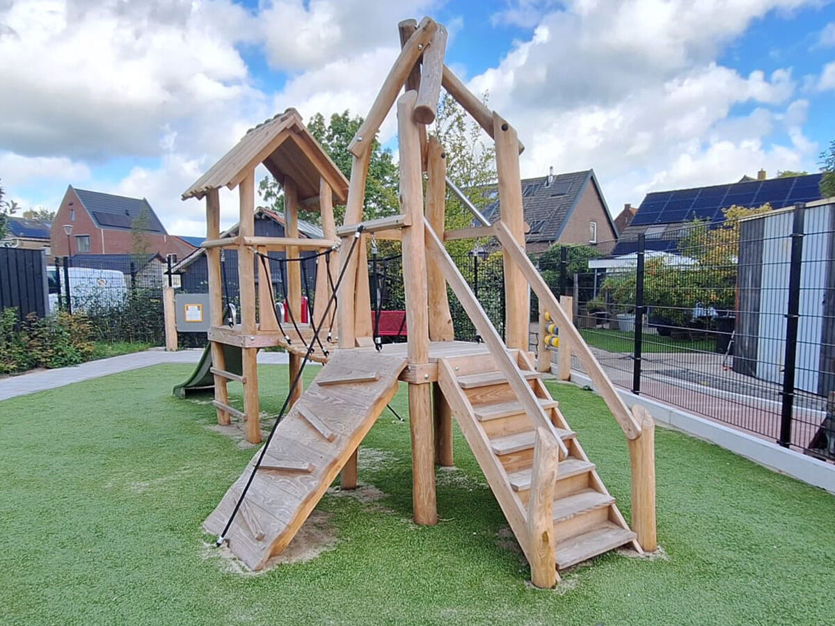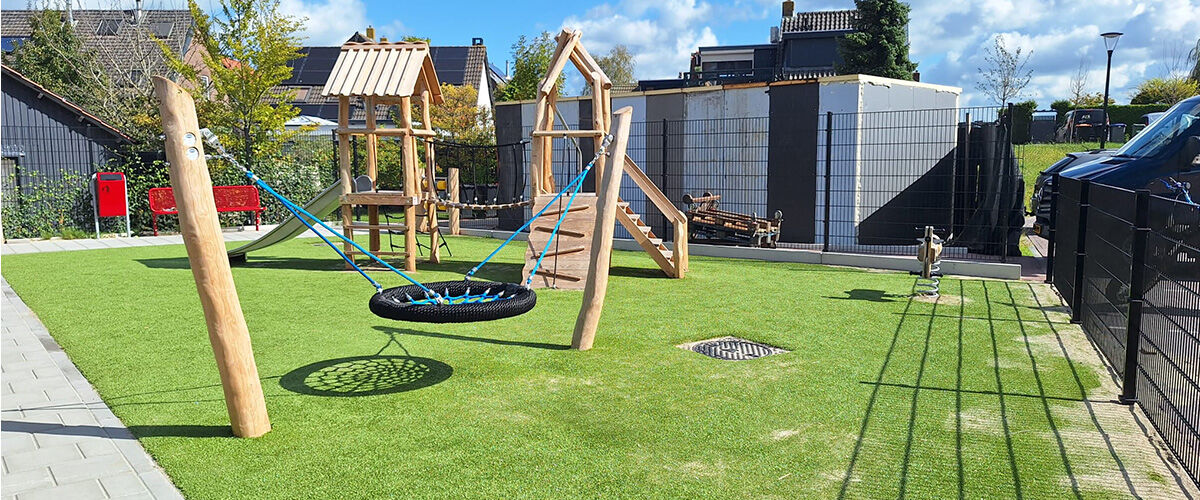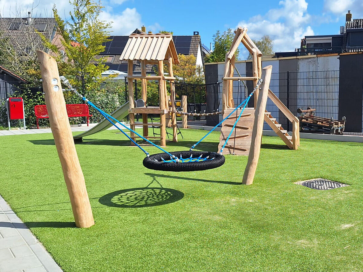Het resultaat is een eigentijdse speelplek waar robinia hout en natuurlijke elementen centraal staan. Met een nieuwe vogelnestschommel en speelcombinatie is er speelruimte voor verschillende leeftijden. Kinderen worden uitgenodigd om samen te ontdekken, te bewegen en grenzen te verleggen.