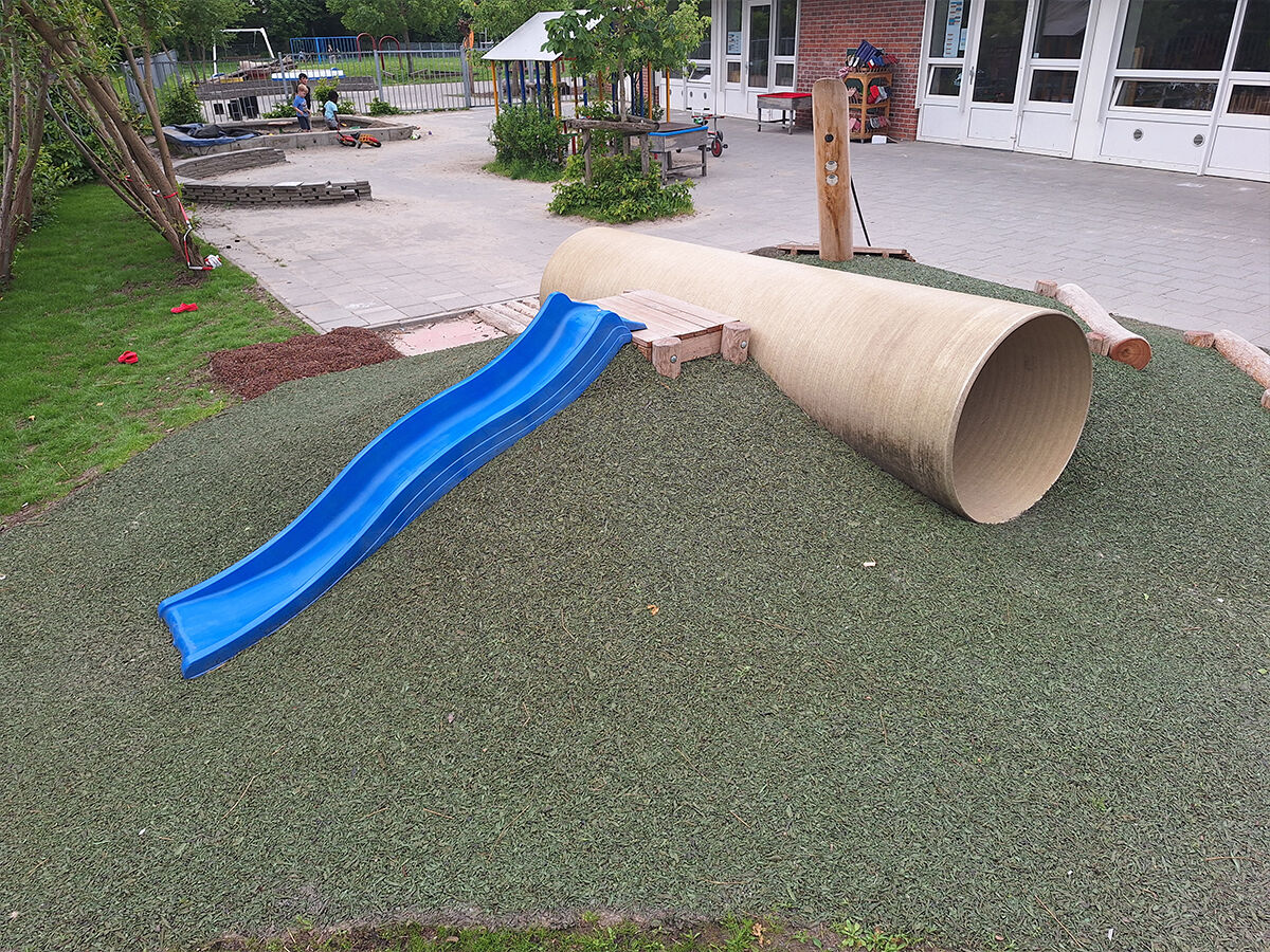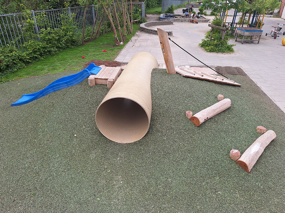 Een belangrijk aspect van deze upgrade is het hergebruik van materialen. In het ontwerp is er een voorstel gedaan om de oude glijbaan en kruipbuis te hergebruiken. De klant was erg verrast hierdoor, aangezien ze geen idee hadden dat dit mogelijk was. Maar natuurlijk waren ze hier wel erg blij mee. Dit hergebruik draagt bij aan een duurzaam project en maakt het mogelijk om met een beperkt budget toch een hoogwaardige speelomgeving te creëren.