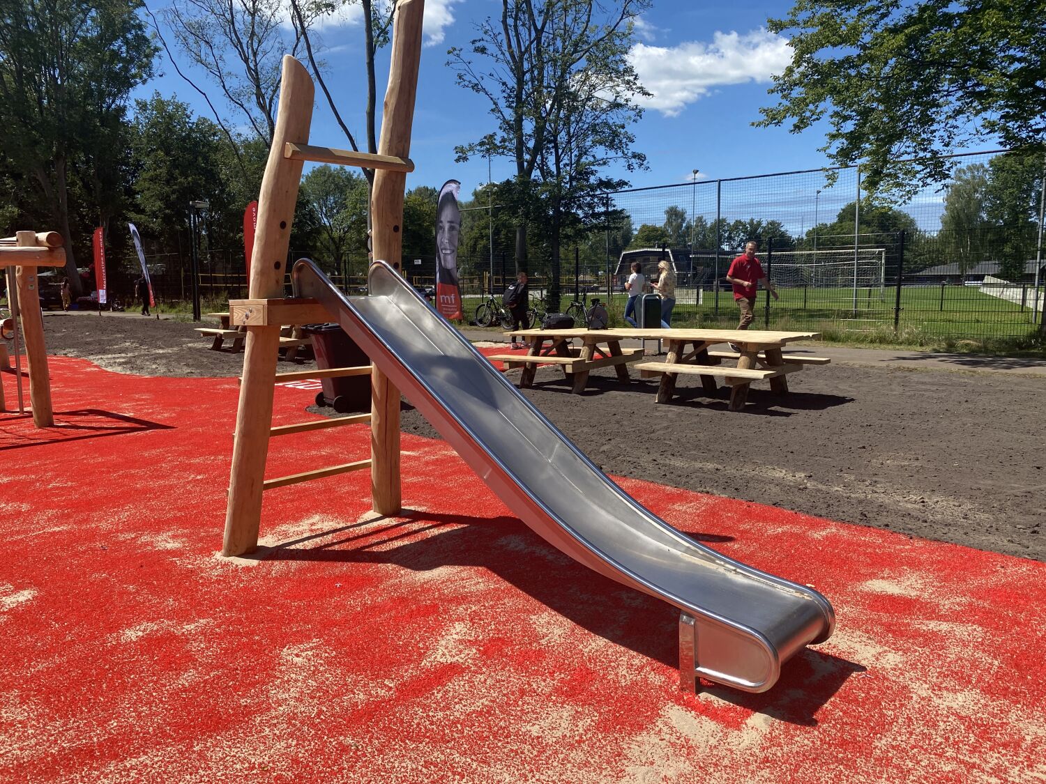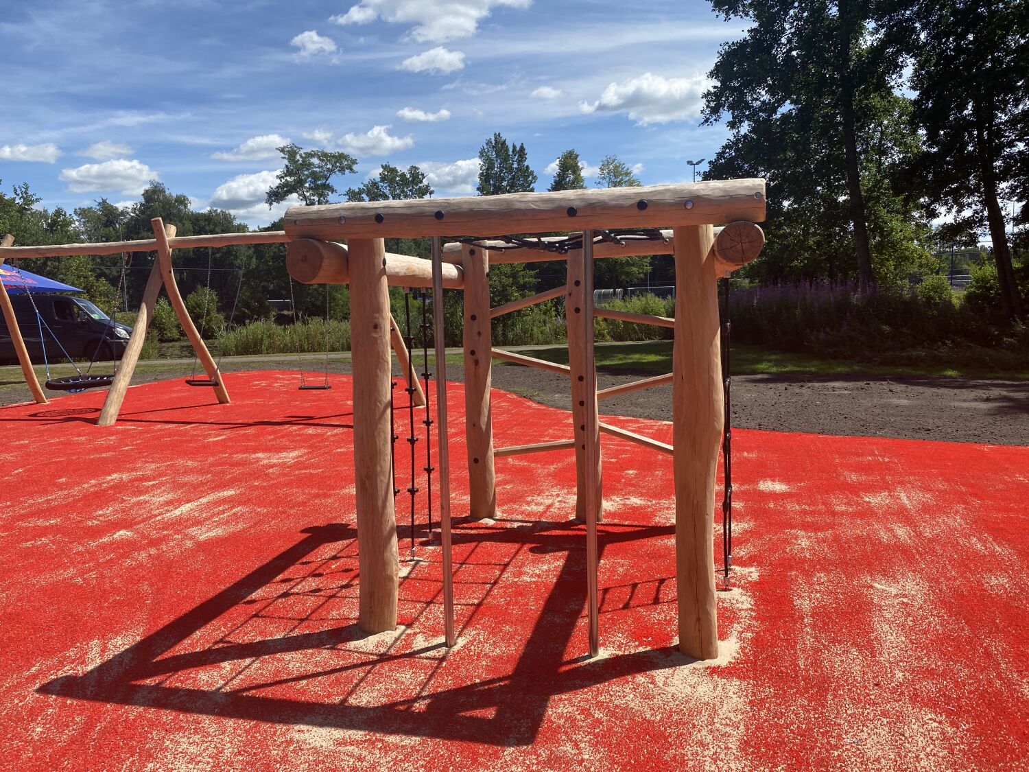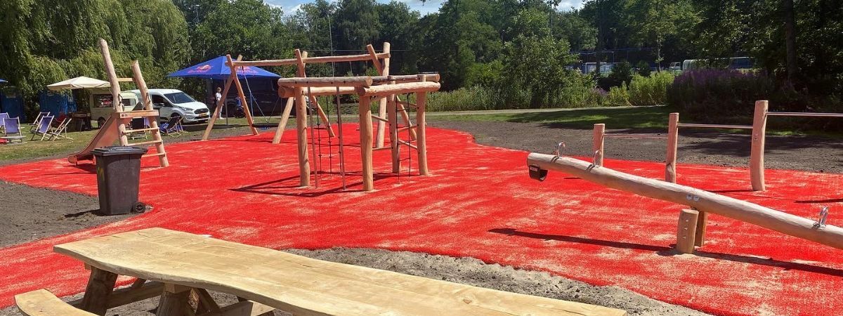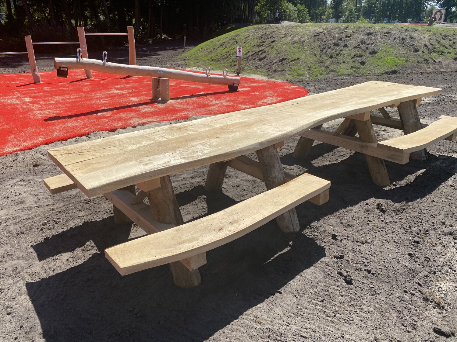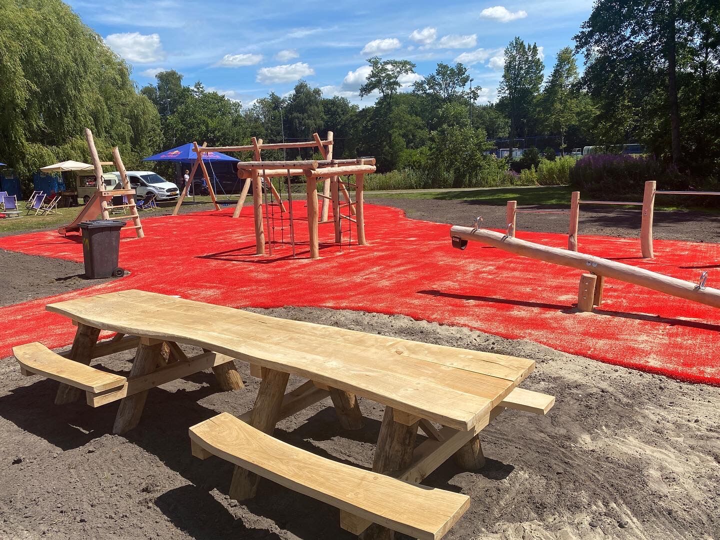 De speeltoestellen die wij uiteindelijk hebben geplaatst zijn Klimtoestel Vlier, een driedelig duikelrek, een vrijstaande glijbaan, een combinatieschommel en 4-zitswip. Tijdens al dat spelen moet er ook uitgerust kunnen worden. Vandaar dat we nog twee grote picknicktafels hebben geplaatst die ook direct geschikt zijn voor personen in een rolstoel! Qua materiaal is er voor Robinia hout gekozen. Een bewuste keuze, aangezien dit materiaal mooi past in de omgeving waar de speeltuin zich bevindt.